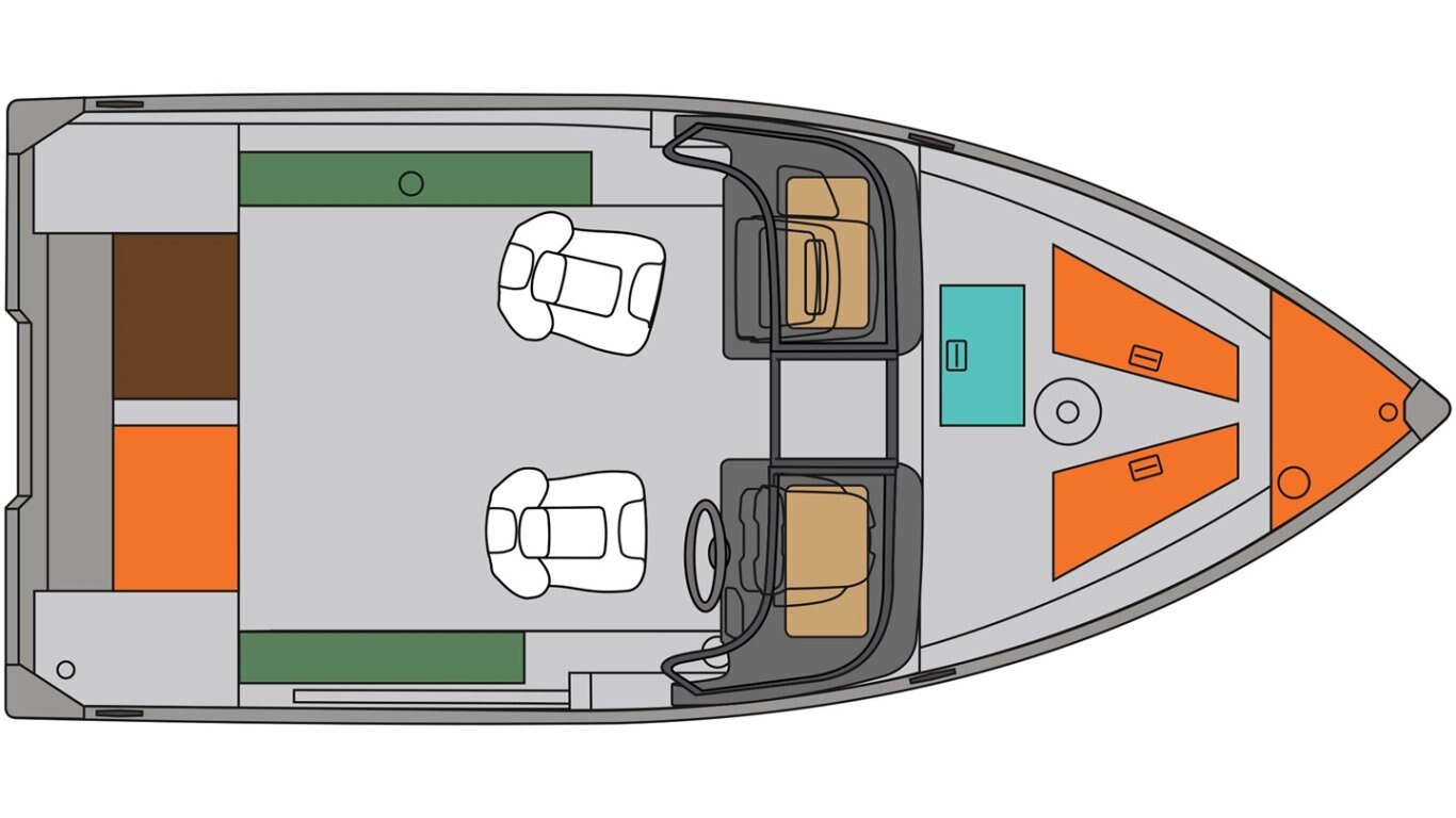 5052-H36 marine grade aluminum alloy NMMA & Transport Canada certified Exterior urethane paint, with black glossy finish including decal package Reverse chine hull design Aluminum clad transom Deep self-draining splashwell Twin plating from bow to mid-ship Rigging tube under flooring (from console to bow) Rigging tube under flooring (from stern to console) Stainless steel bow and stern eyes 4 nylon cleats BOW RAISED CASTING PLATFORM Storage under casting platform Deep cycle battery storage compartment Electric-filled aerated livewell Seat mount floor base Storage compartment AFT RAISED CASTING PLATFORM Battery storage compartment