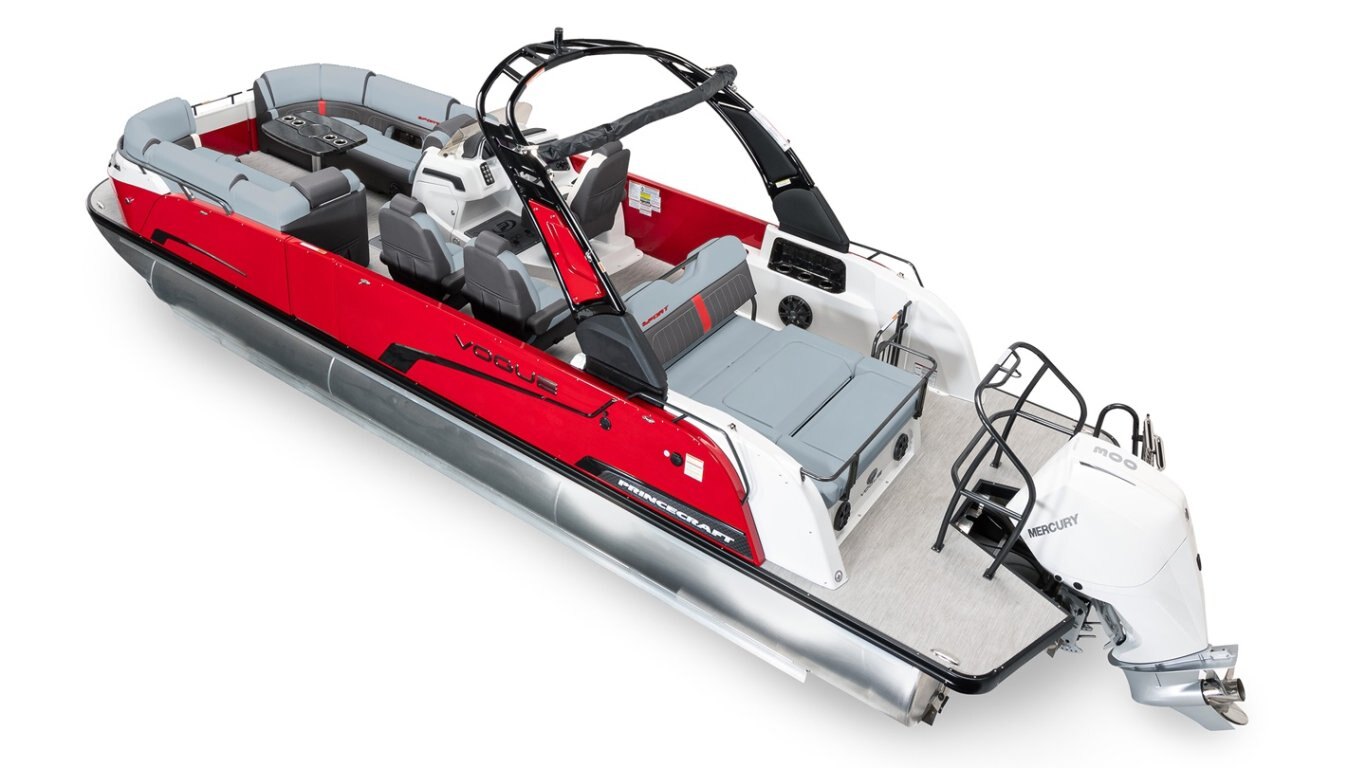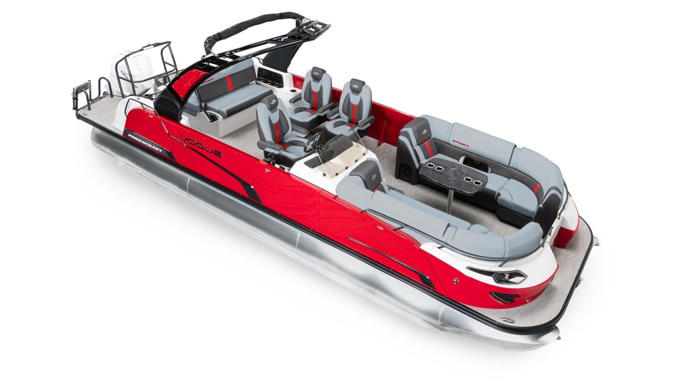 - Sport Edition (Red accent) including premium upholstery textured vinyl, LED lighting on floor, bimini top, pontoon logs, speakers, and fixed cup holders (MUST be order with grey Sensation or Infinity grey with white lines)