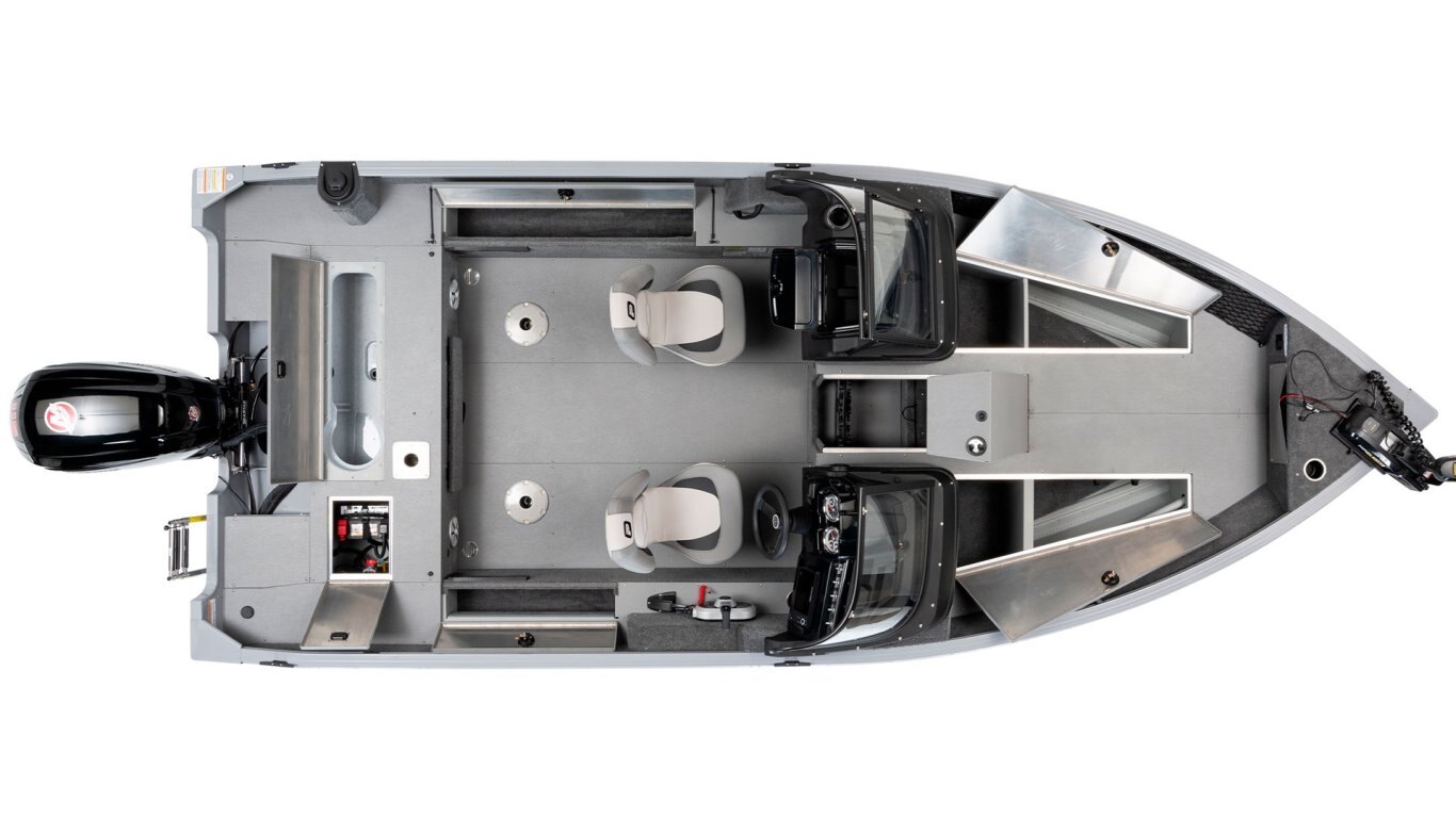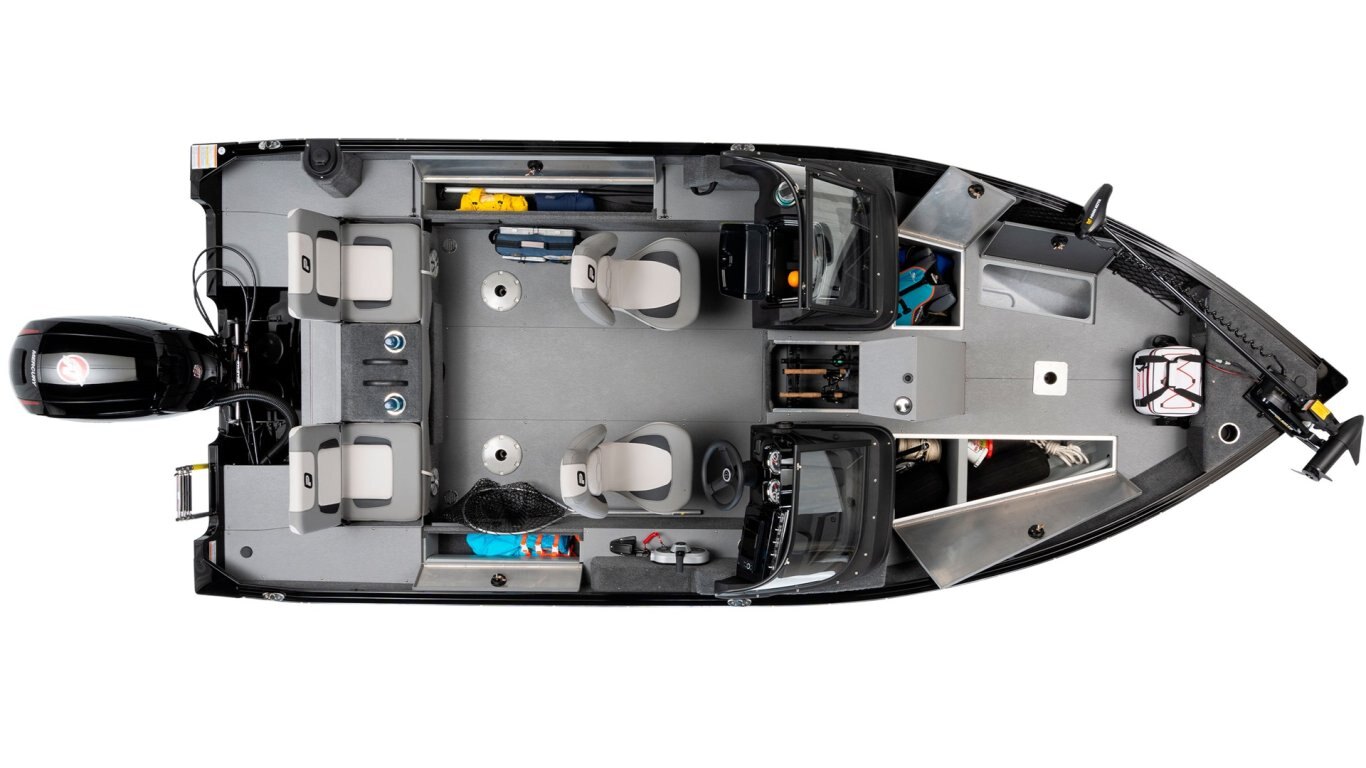 • Tournament fishing TFT Anthracite Grey package including Black and Anthracite Grey exterior color, 3D Princecraft® black chrome logo, insulated livewells, additional bow livewell, 4 flip cleats, tournament Fishing Team graphics, fish ruler, deluxe seat exchange, flat seat bases on fishing platforms, quick rod storage, nets addition under consoles and on bow platform
