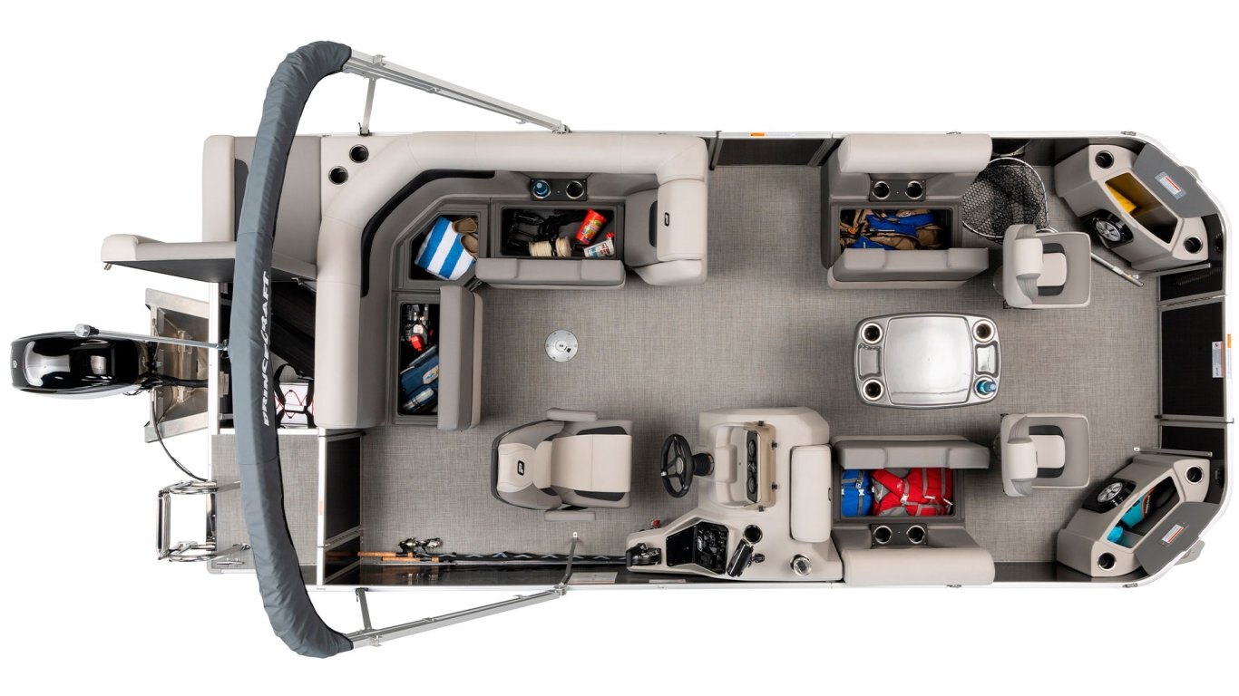 • Nautical Blue Edition including 3D Princecraft® black chrome logo on both sides and front door, Nautical blue exterior colour accent, deluxe driver seat, LED lighting under driver console and furniture, superior steering wheel and docking lights