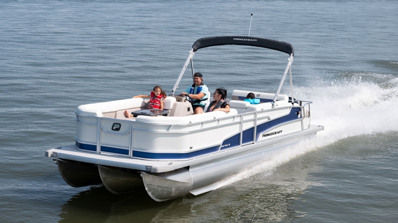 • Nautical Blue Edition including 3D Princecraft® black chrome logo on both sides and front door, Nautical blue exterior colour accent, deluxe driver seat (also, if applicable passenger captain's chair and slider), LED lighting under driver console and furniture, top flywheel, docking lights and colour accent in the standard upholstery only