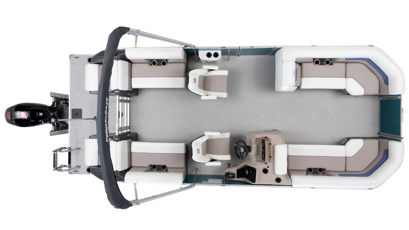 • Nautical Blue Edition including 3D Princecraft® black chrome logo on both sides and front door, Nautical blue exterior colour accent, deluxe driver seat (and if applicable passenger captain's chair and slider), LED lighting under driver console and furniture, superior steering wheel, docking lights and colour accent in the standard upholstery only