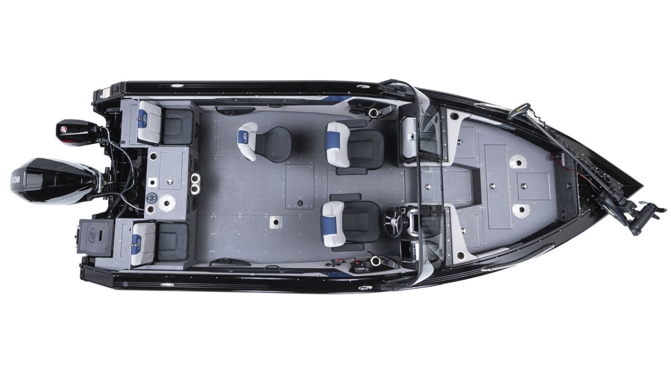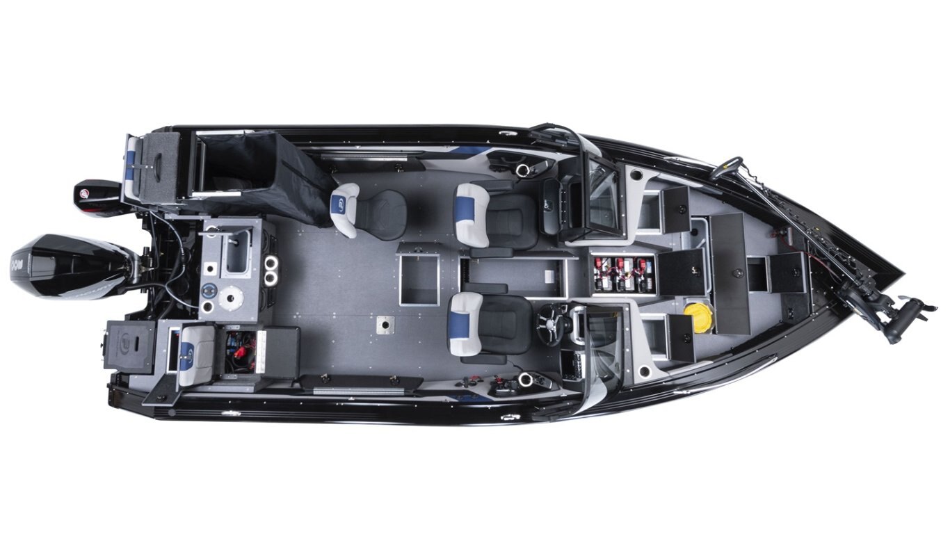 Key standard features of the Platinum Series Black anodized tempered glass windshield, with hidden frame and door Simrad® NSX7 multifunction touch screen allowing instrumentation display, GPS functions, sonar, and downscan imaging 200-watt AM/FM/Bluetooth® Clarion Digital media center including an in-dash USB plug and 4 waterproof speakers with LED lights 77 L/20 U.S. gal. bow and 64 L/17 U.S. gal. stern ProFloMD Plus electric-filled aerated livewells ACS system (Advanced Circulation System): air intake allowing airflow of the in-floor rod organizer
