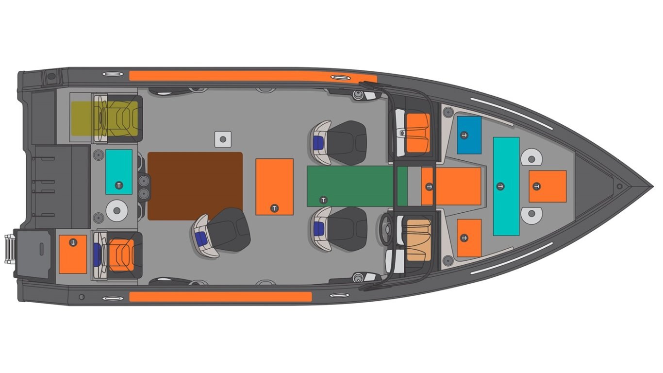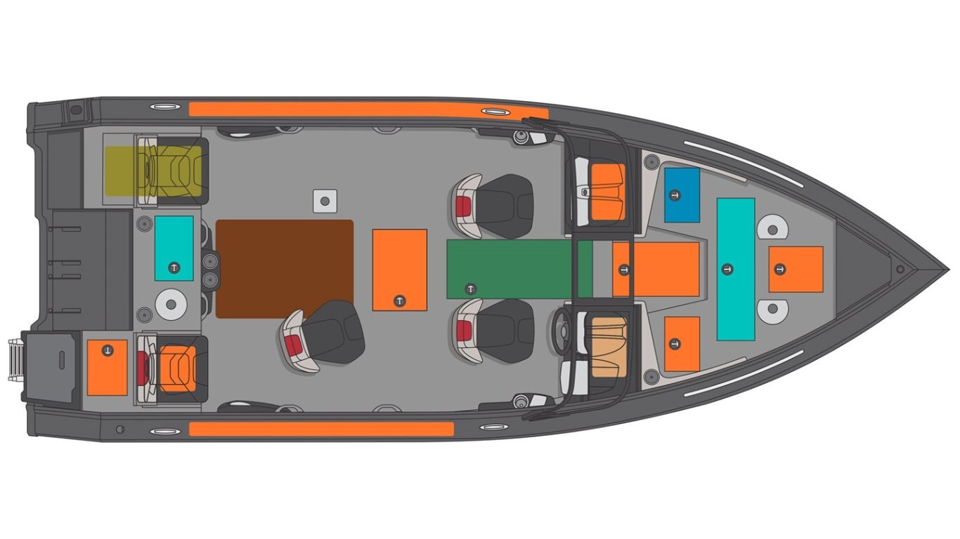 Ventilation system in bow storage compartments includes: an electric fan Downrigger supports (Metallic black) PrinceTrak storage system PrinceTrak accessory and bait tray PrinceTrak rod holder (installation plate included) PrinceTrak support