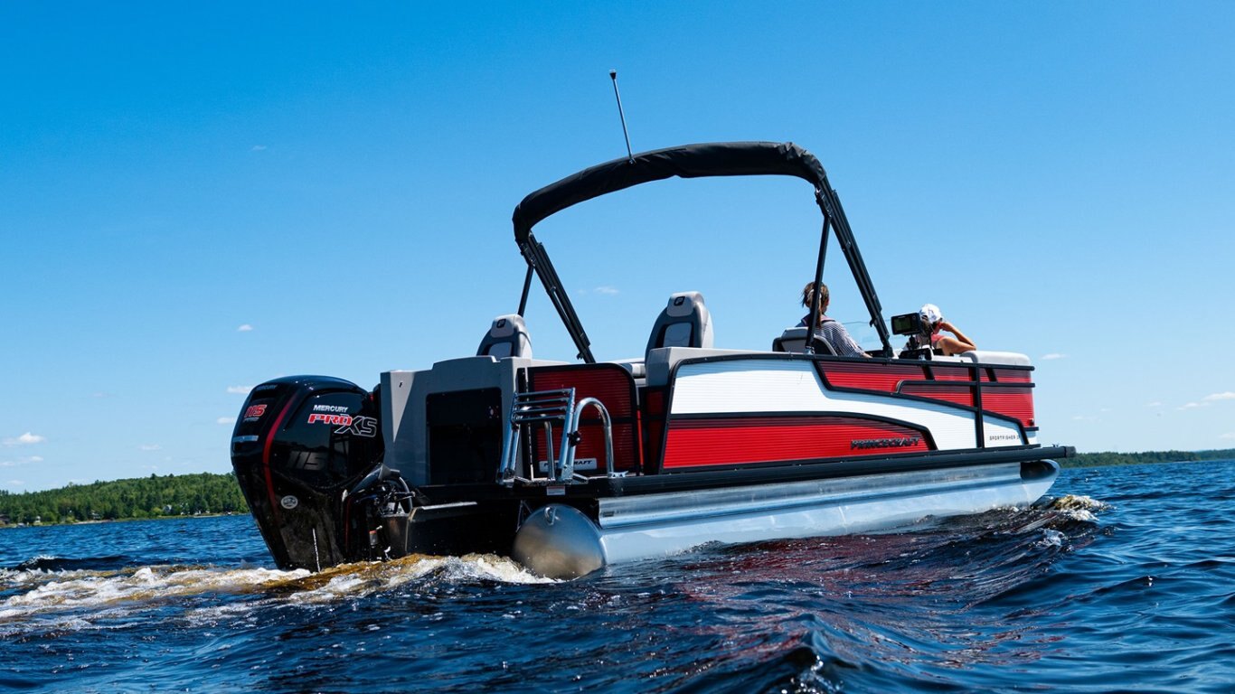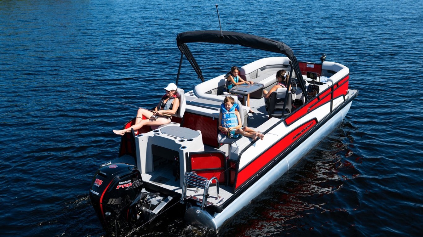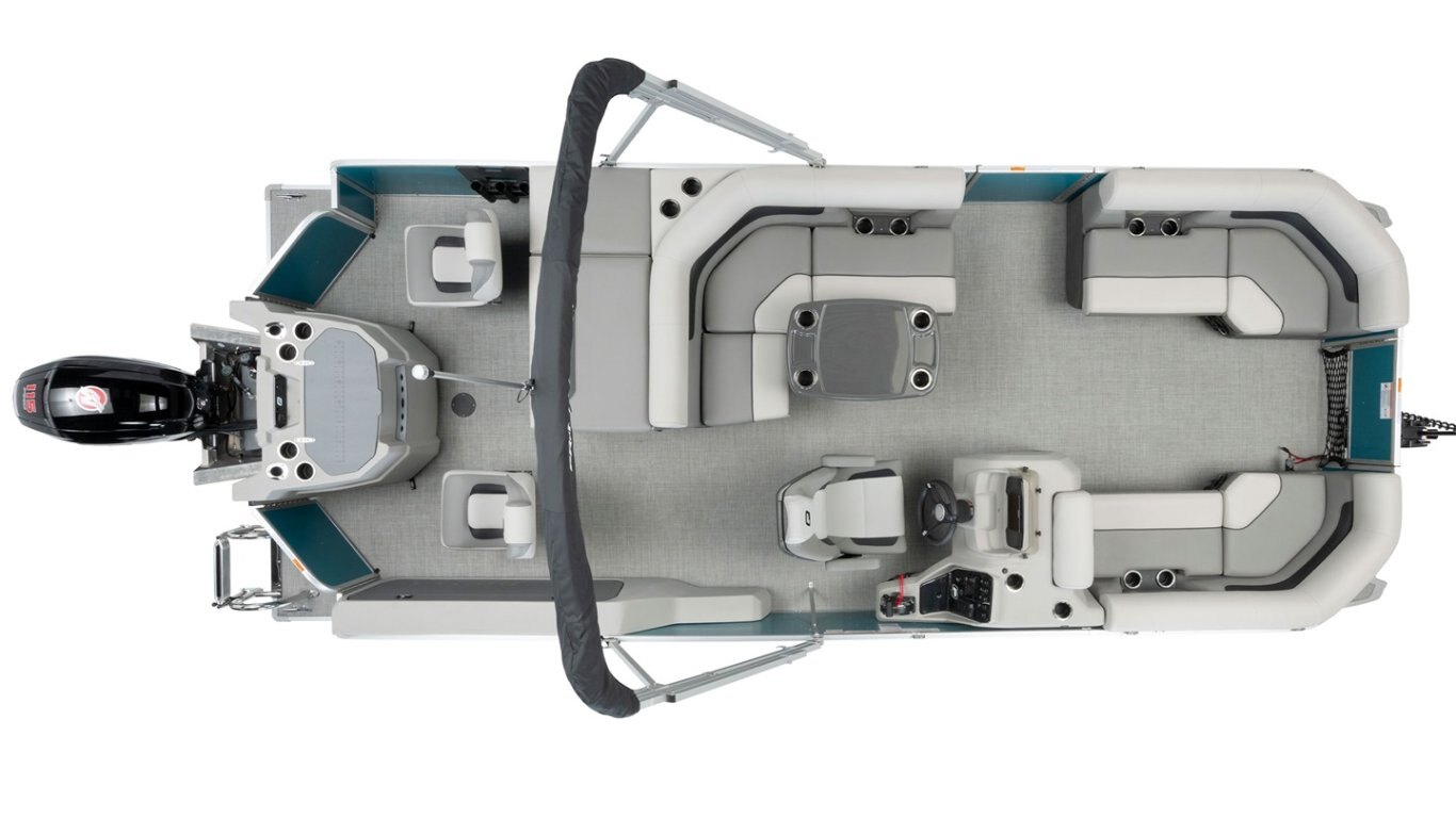 - Protective cover (black) for pontoon with an electric bimini and performance configuration