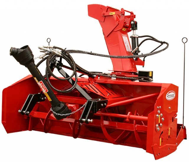 The draw behind snowblower allowing to blow snow while travelling foward. The gear box on this model is placed at the front of the snowblower which allows backing up closer to obstacles to remove the snow and reduces the load on the three point hitch.