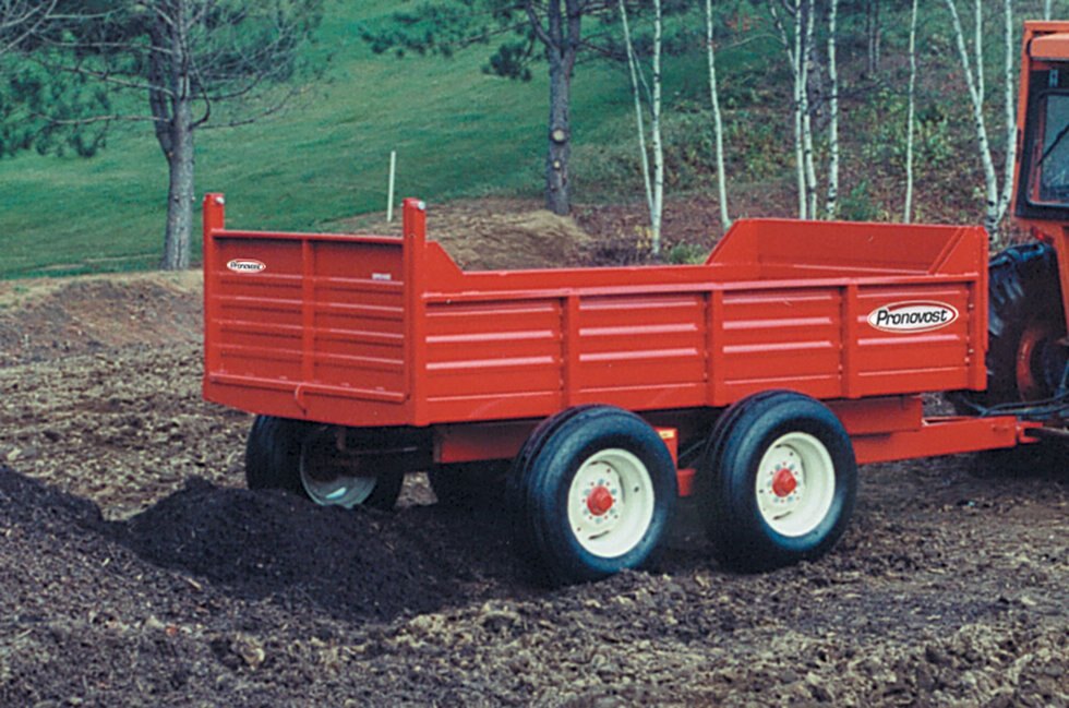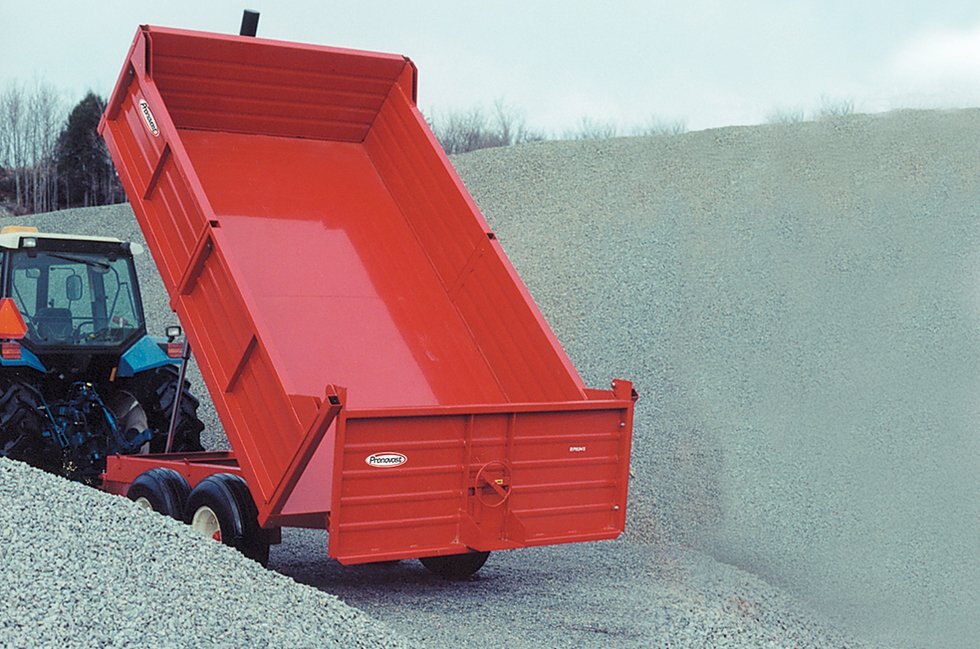 Robust chassis and reinforced deck (box rails under the deck). Strong, removable profiled panels. Hinged side panels (certain models). Automatic rear panel opening mechanism (except on P-503). Optional grain chute on rear panel. Optional maximum tilt angle auto stop on certain models. Optional board pockets on certain models. Swivel hitch or ball receiver. Cylinders and hydraulic hoses with quick disconnects. Electric hydraulic pump optional.