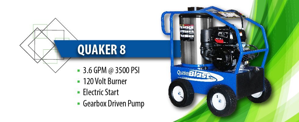 The Quaker-8 is a compact heavy duty gearbox driven hot water gas pressure washer designed for daily industrial cleaning. This unit is equipped with a 12 volt Wayne burner and self contained charging system.