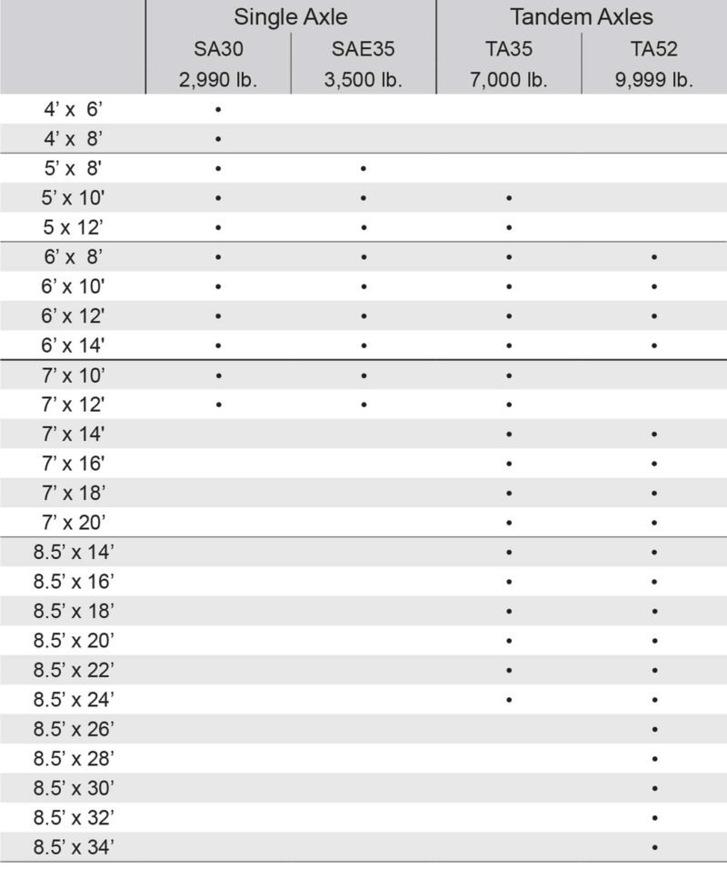 The RWT is available in a variety of sizes, ranging from a compact 4’ wide x 6’ long, to a spacious 8.5’ wide x 34’ long. Hitch options are expansive, from your standard 2” coupler on single axles to 3rd Member Tongue on Tandem 5,200 lb. axles—see product details for more information. This trailer is also available in aluminum.