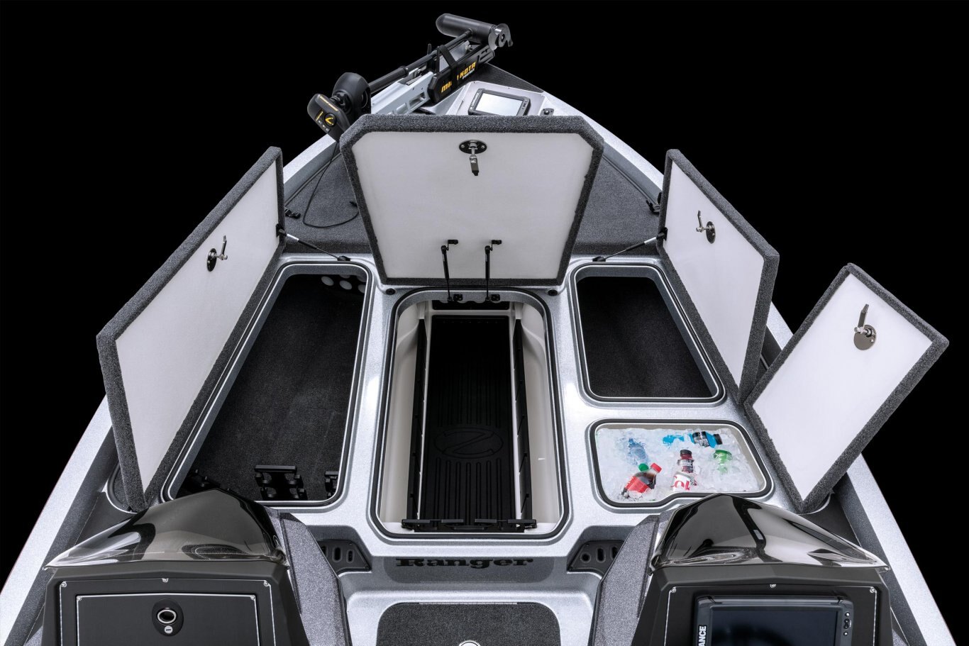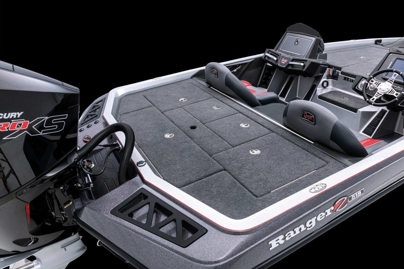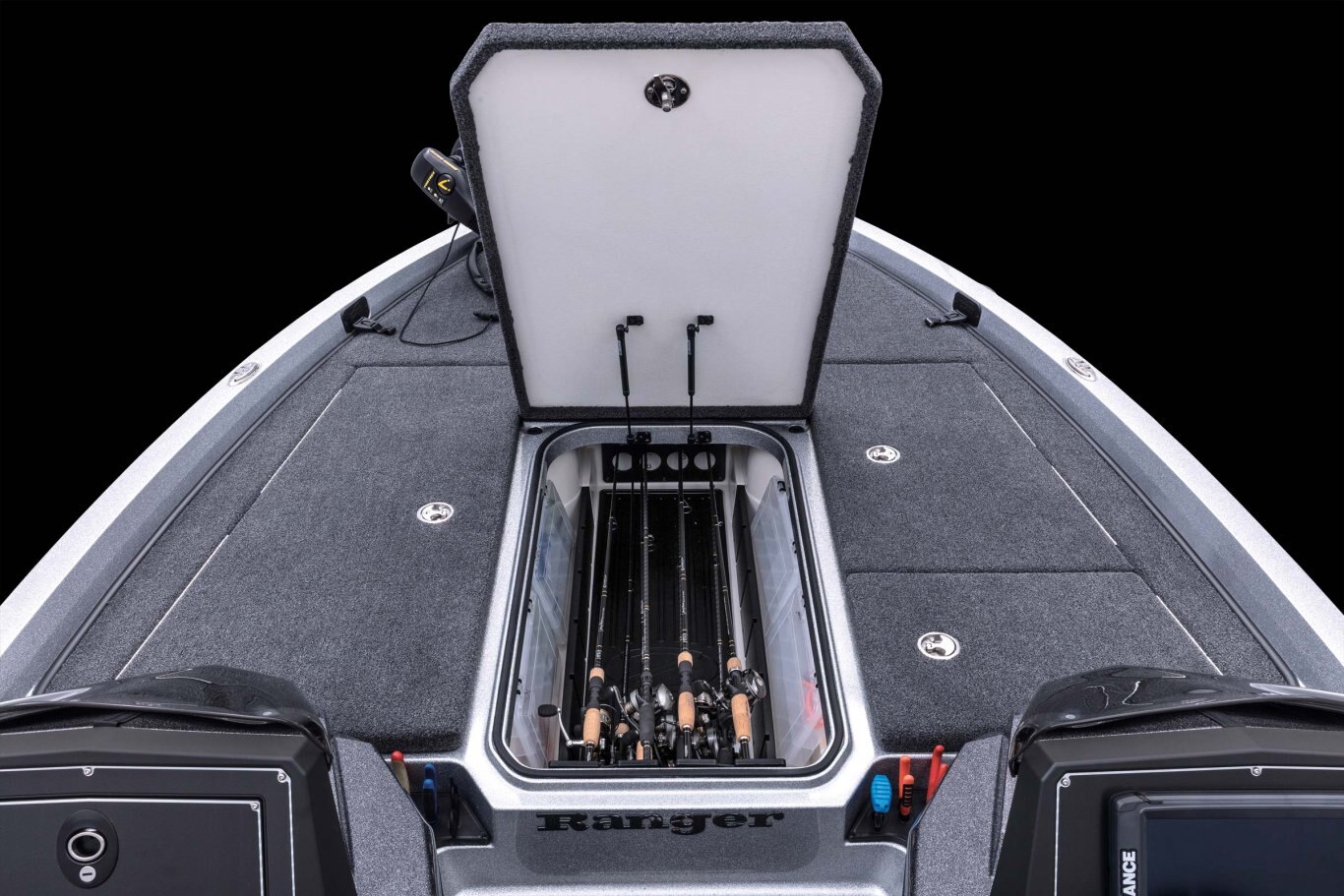 The wide, stable beam of the Z519 Ranger Cup Equipped boasts a tour-grade layout and delivers the stability, performance and confidence only Ranger ® can provide. Exceptional fishability comes by way of a huge padded front deck with an 8’ center rod locker and flush-mounted bow electronics. Highlighting the cockpit is a bold console with a full complement of gauges and capability to carry 15” screens, along with plush seats covered in premium, marine-grade upholstery and co-angler rod storage. The back deck features a timed, aerated and divided livewell nestled between monster storage boxes and just fore of the battery box. With a full palette of custom color options and the outboard of your choice, the Z519 Ranger Cup Equipped is the go-to tournament rig for those who refuse to lose.