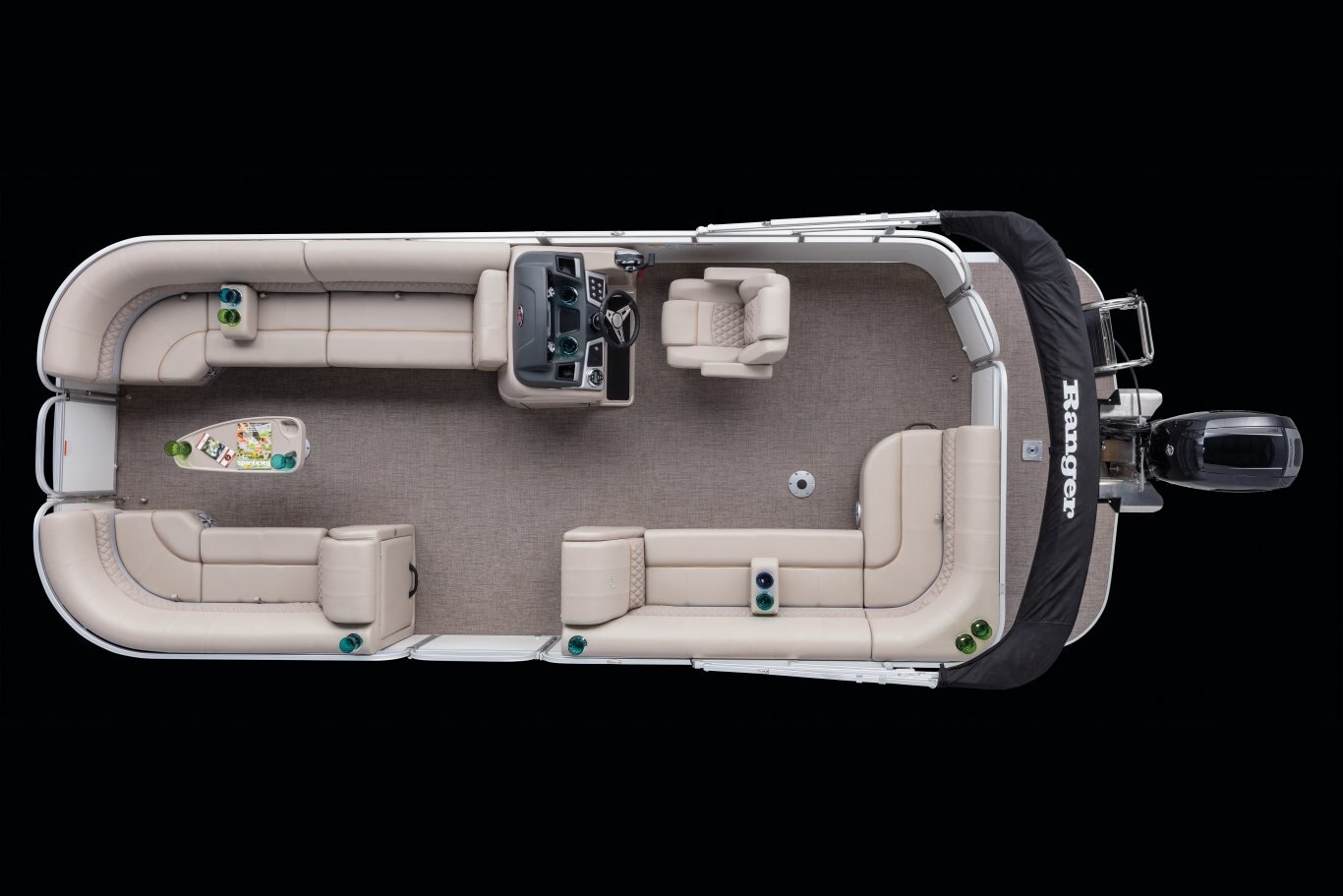With a deck big enough for any undertaking, the Ranger® Reata® 220C is an easy-to-maneuver platform that gives up nothing in capacity while boasting a full complement of high-end touches inside and out. Chrome bezels surround LED navigation and docking lights on the redesigned fencing. Rounded gates with stainless steel hardware provide entry to the plush deck, highlighted by an updated helm seat and fully featured console complete with no-feedback steering and an array of gauges. A matching 11-foot Bimini top keeps things cool while a wealth of cupholders and an under-console cooler storage keep drinks close at hand. When you need to escape into the outdoors, the 220C deliver all kinds of capability for any and everything.