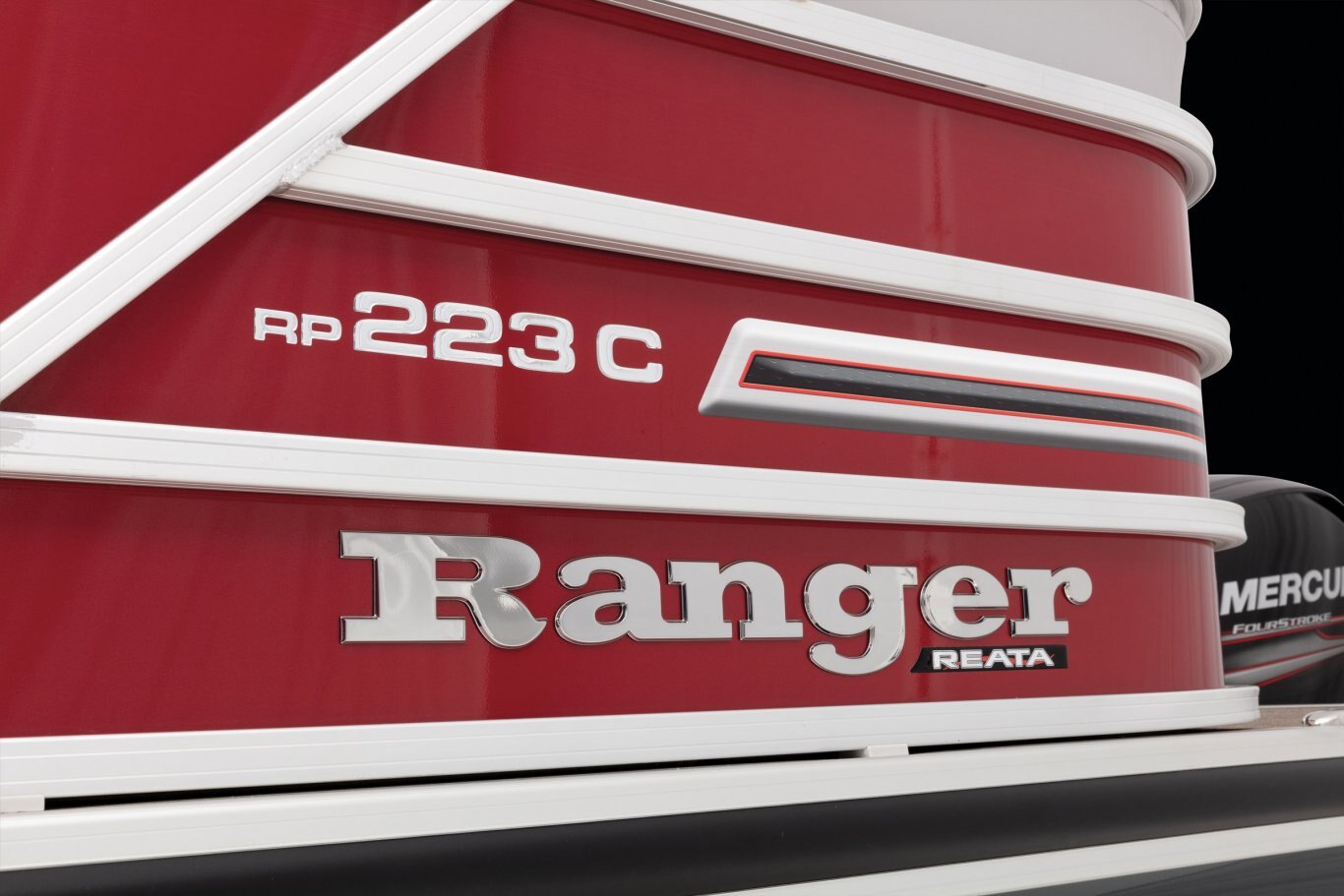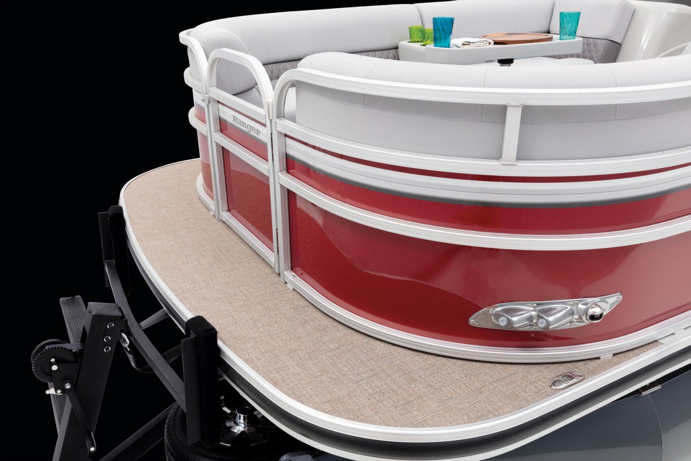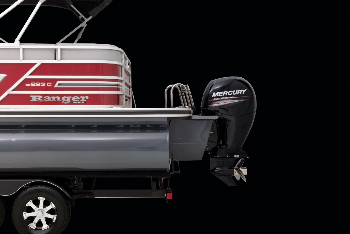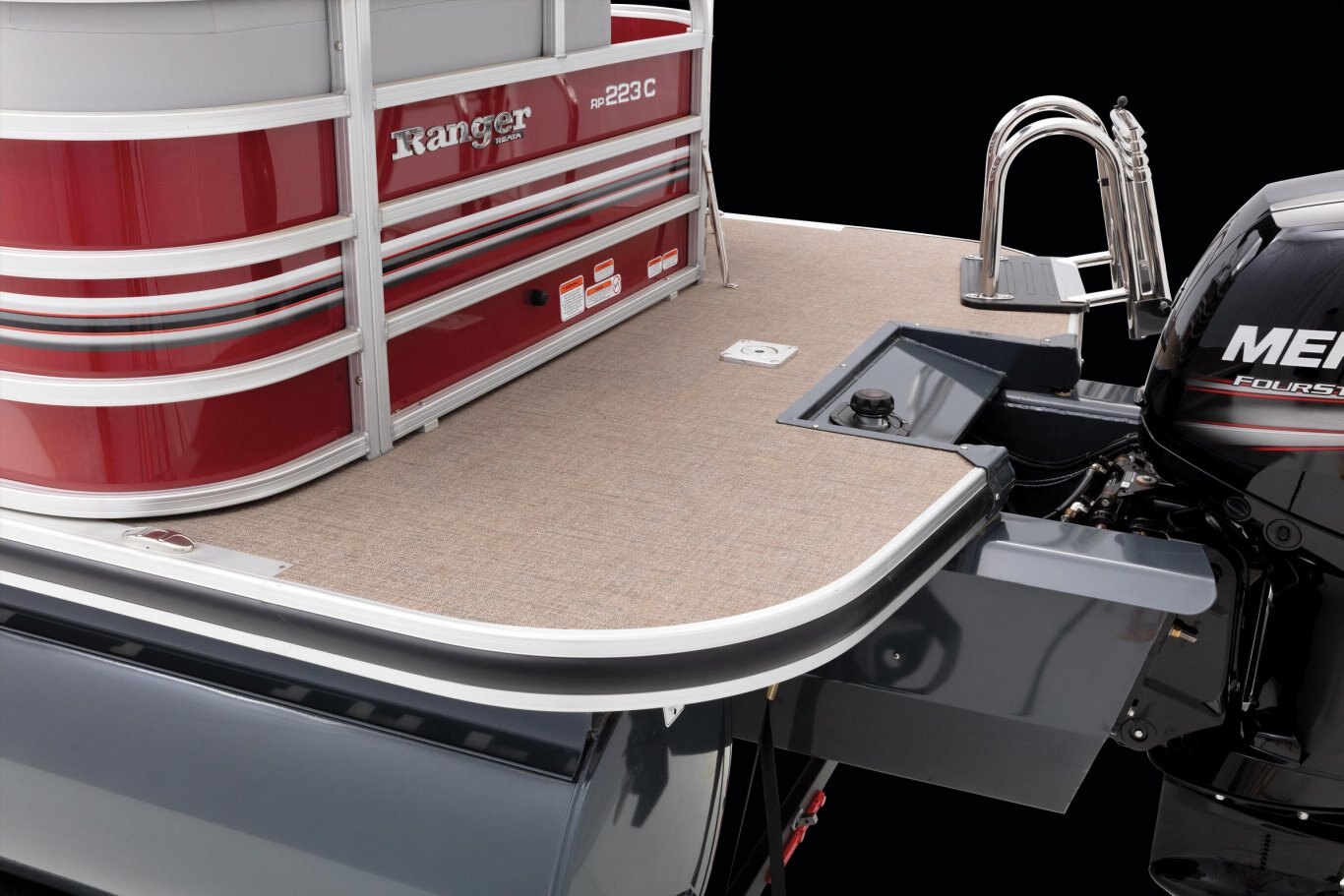 Smooth, solid power, refined luxury and maximum convenience define the Ranger® Reata® 223C. With three powder-coated pontoons, hand-crafted seating and an 11-foot Bimini top, this pontoon is ready to move you in comfort and style. A full-width rear swim platform with boarding ladder are adjacent to the PowerPod™ motor extension that delivers enhanced performance and a quieter ride. Within the redesigned gates is luxury from top to bottom, from the soft-touch woven flooring to the extra-plush lounges and overstuffed captain’s chair. Storage beneath every seat and under the console easily hold a day’s worth of gear while a 200-horsepower rating ramps up excitement on demand. With so much capability, the Ranger 223C delivers high performance, even at 0 MPH.