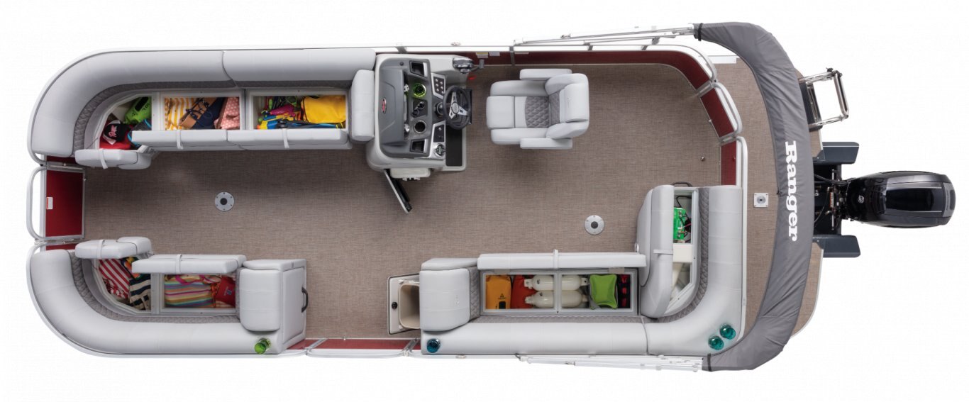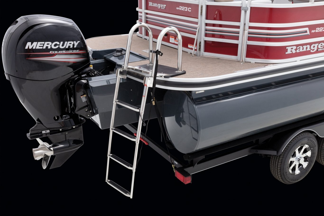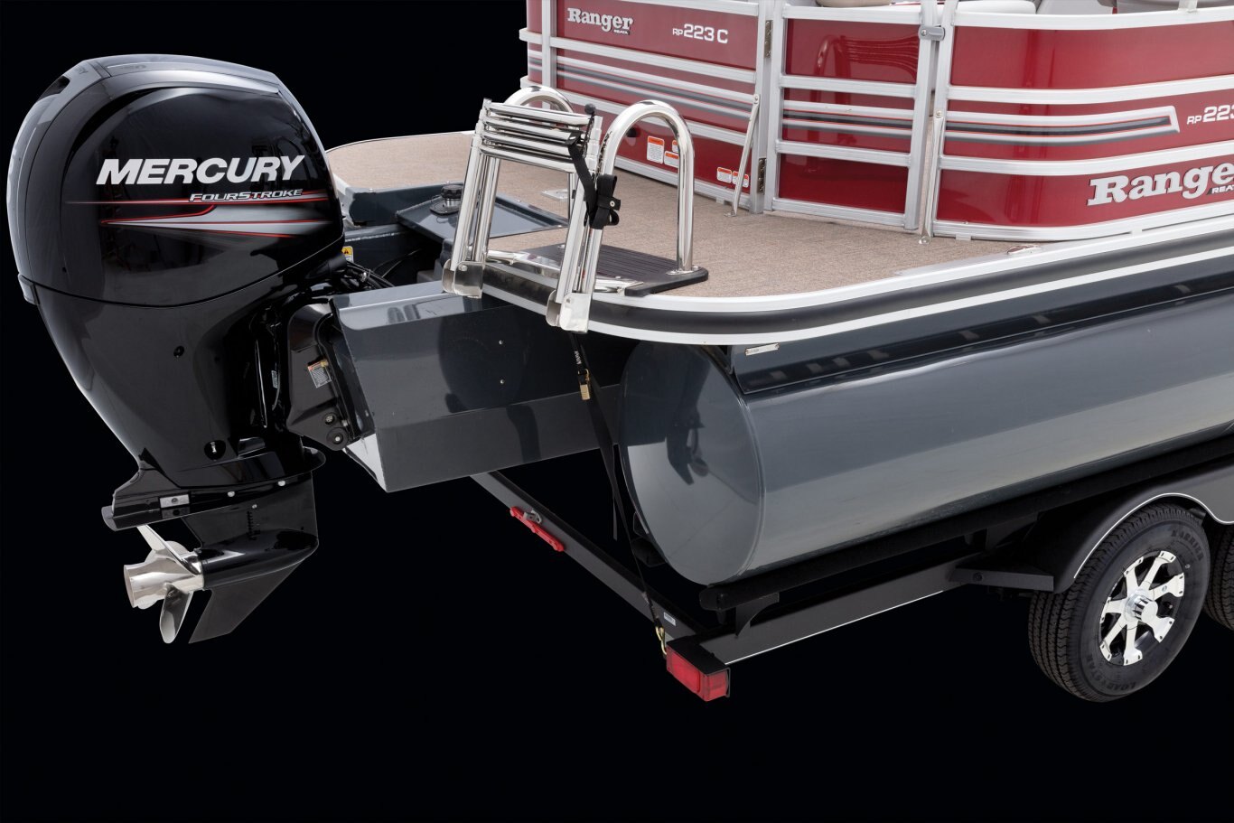 Smooth, solid power, refined luxury and maximum convenience define the Ranger® Reata® 223C. With three powder-coated pontoons, hand-crafted seating and an 11-foot Bimini top, this pontoon is ready to move you in comfort and style. A full-width rear swim platform with boarding ladder are adjacent to the PowerPod™ motor extension that delivers enhanced performance and a quieter ride. Within the redesigned gates is luxury from top to bottom, from the soft-touch woven flooring to the extra-plush lounges and overstuffed captain’s chair. Storage beneath every seat and under the console easily hold a day’s worth of gear while a 200-horsepower rating ramps up excitement on demand. With so much capability, the Ranger 223C delivers high performance, even at 0 MPH.