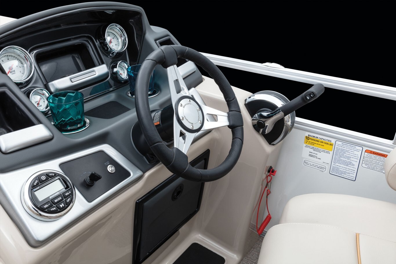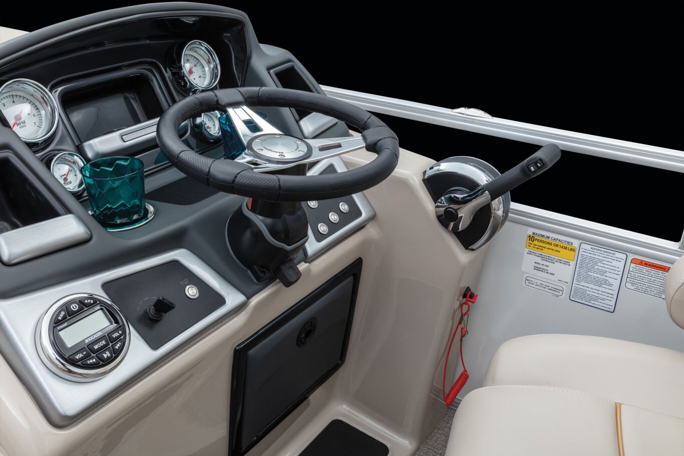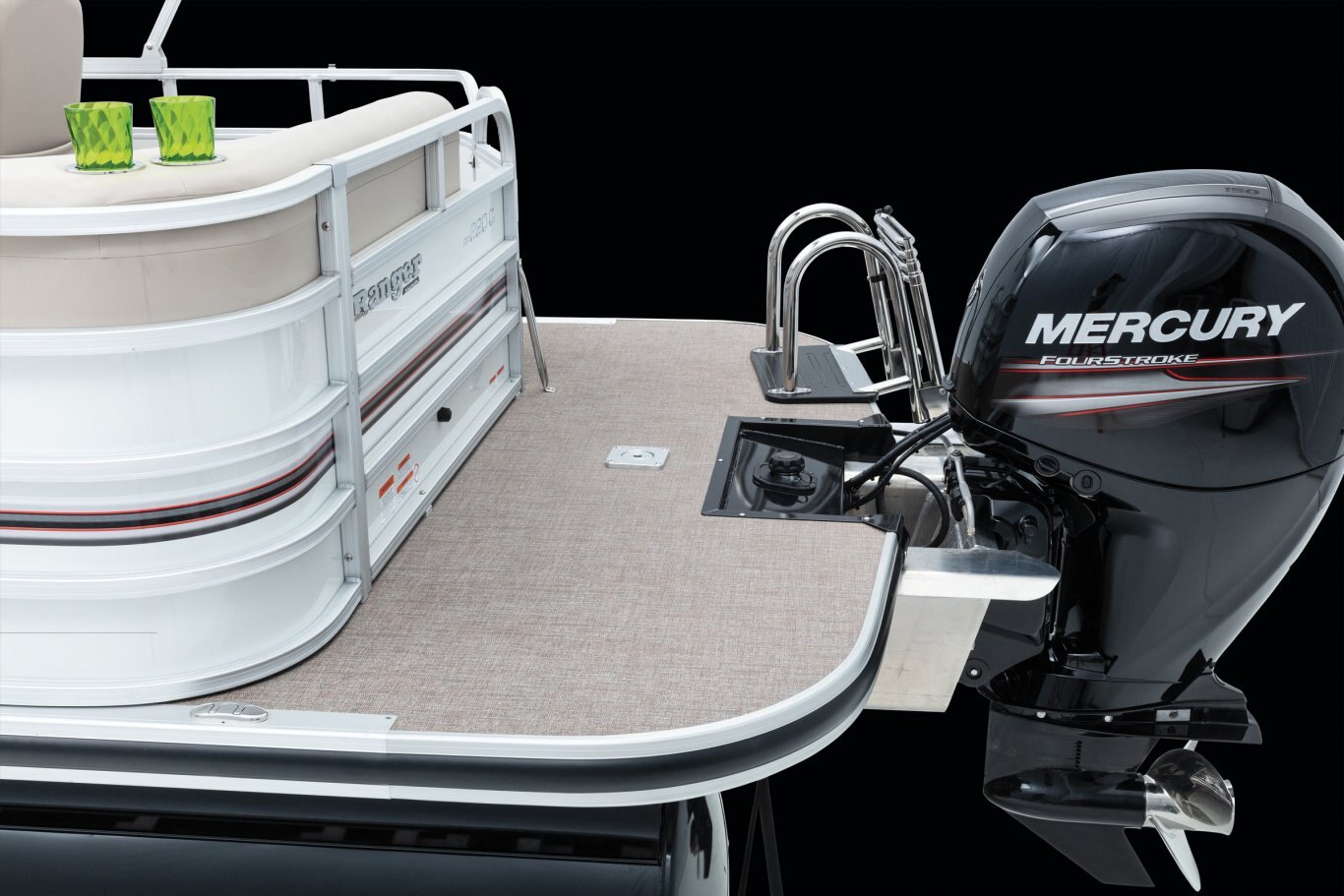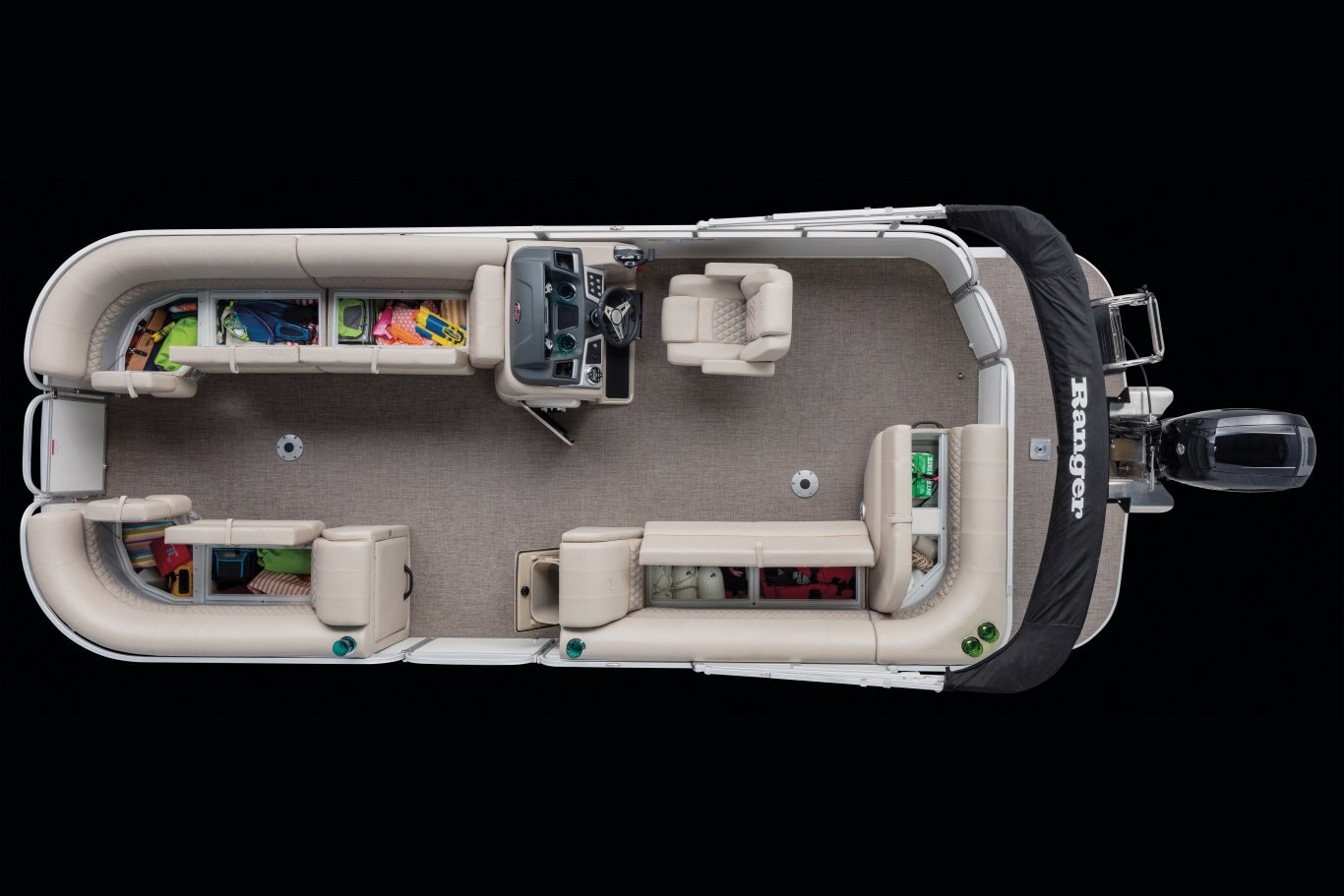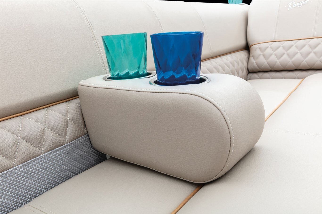 With a deck big enough for any undertaking, the Ranger® Reata® 220C is an easy-to-maneuver platform that gives up nothing in capacity while boasting a full complement of high-end touches inside and out. Chrome bezels surround LED navigation and docking lights on the redesigned fencing. Rounded gates with stainless steel hardware provide entry to the plush deck, highlighted by an updated helm seat and fully featured console complete with no-feedback steering and an array of gauges. A matching 11-foot Bimini top keeps things cool while a wealth of cupholders and an under-console cooler storage keep drinks close at hand. When you need to escape into the outdoors, the 220C deliver all kinds of capability for any and everything.