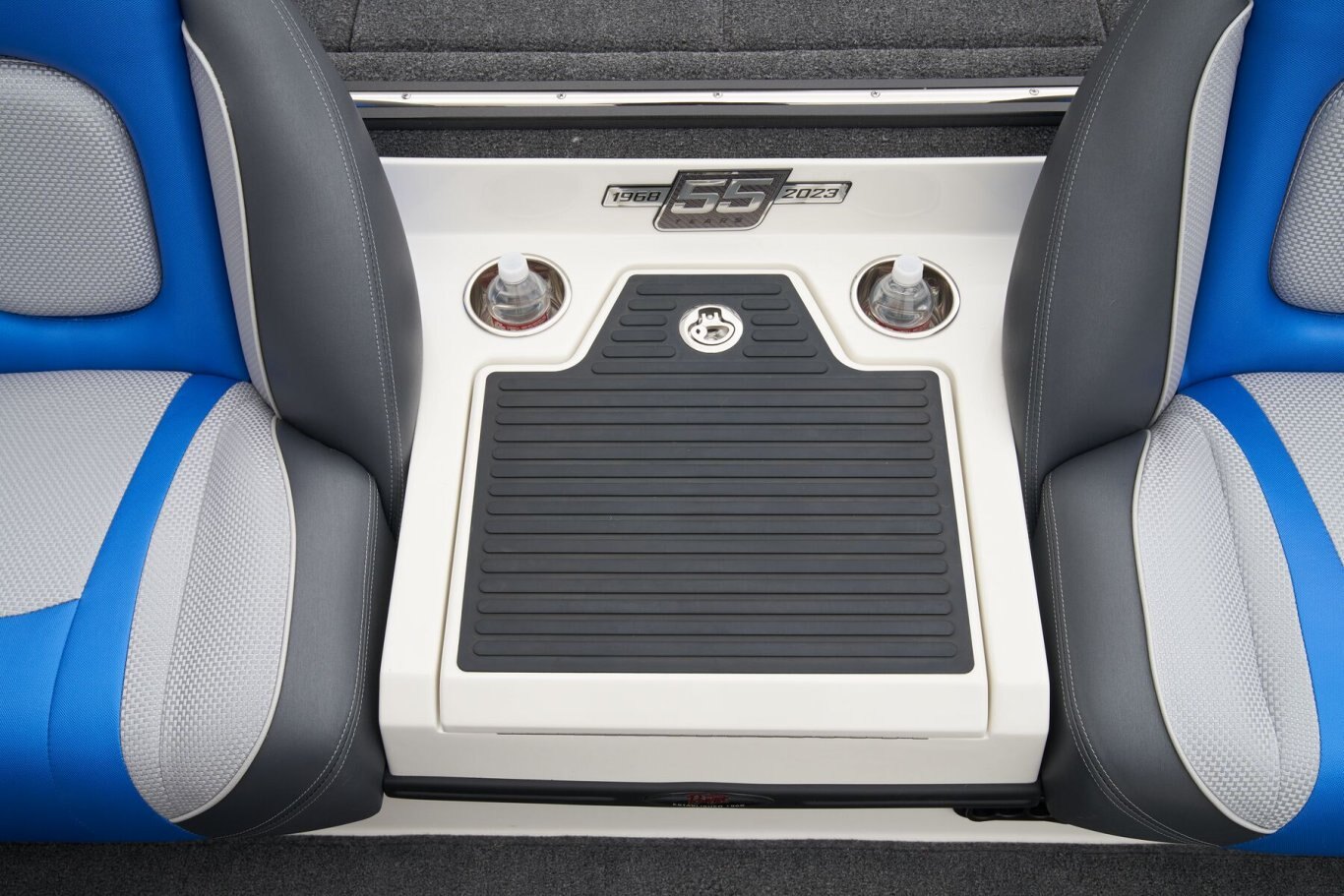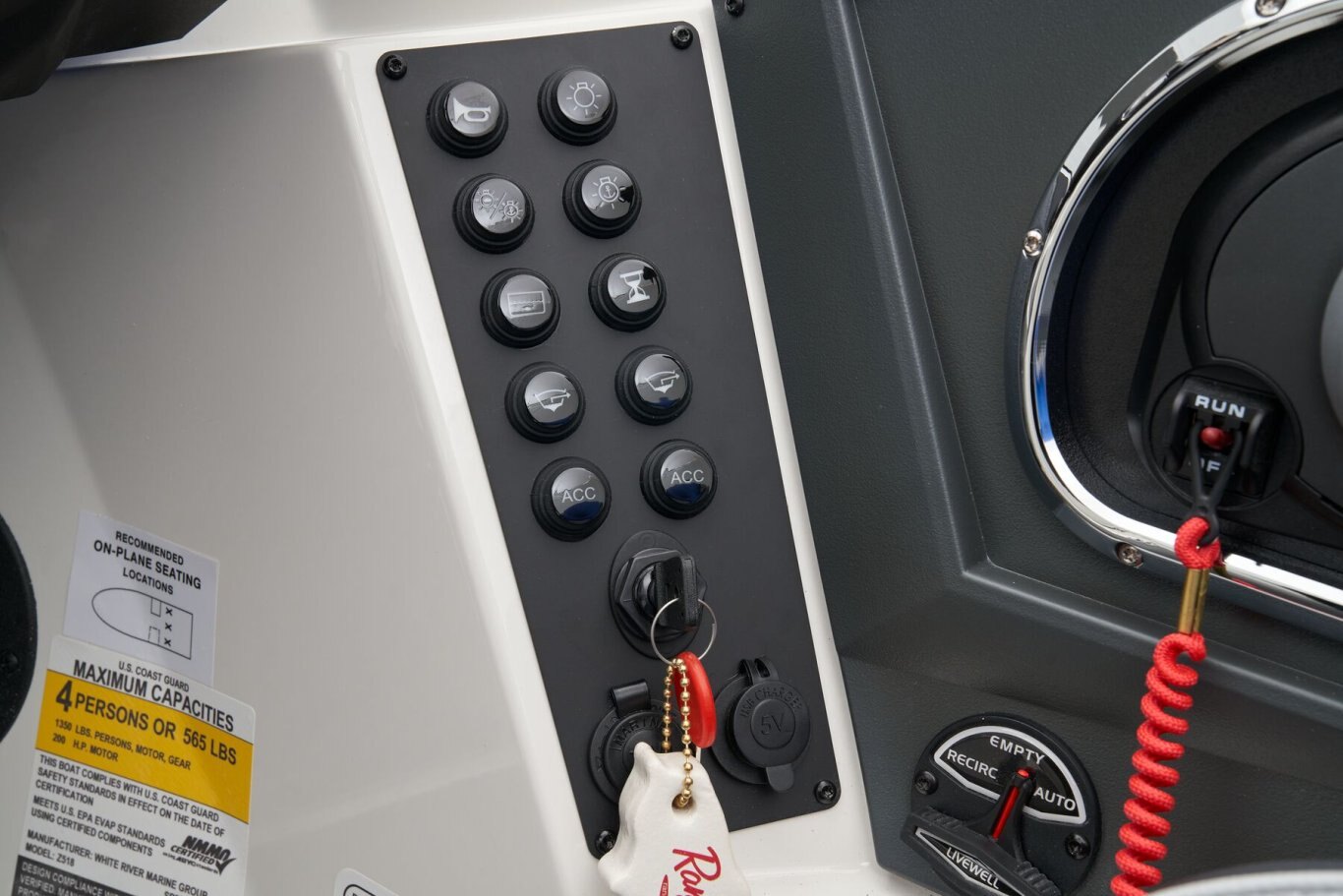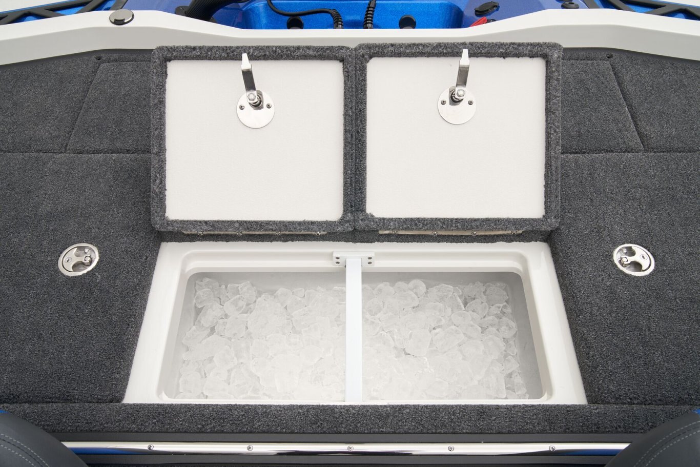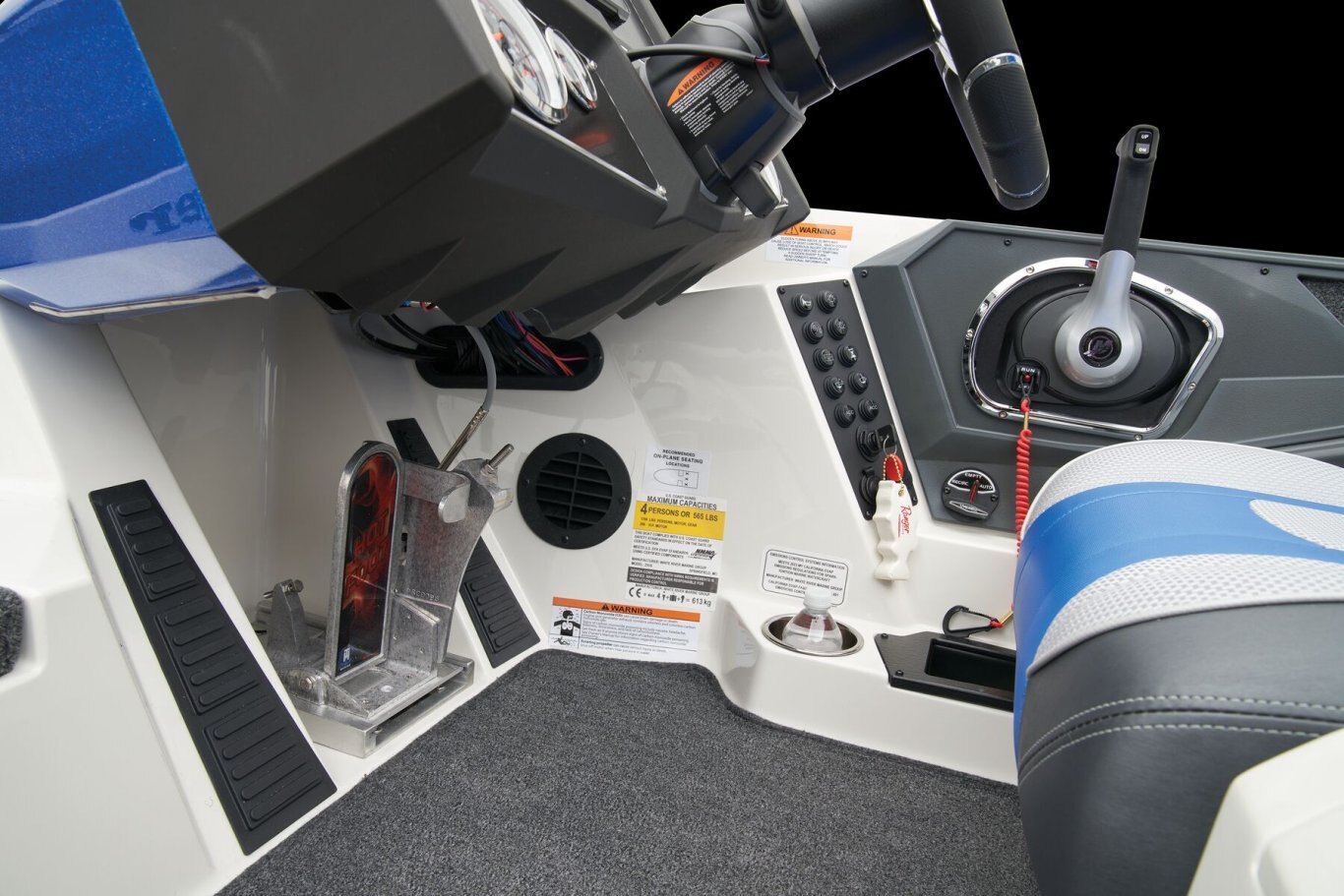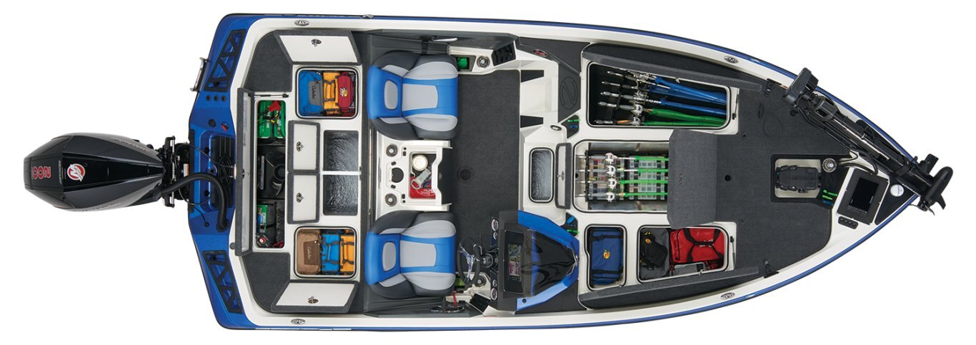 ELECTRONICS Multi-function custom gauge package: speedometer, tachometer, fuel, trim, water pressure, temp, volt Keyed ignition and premium analog switching Digital 6-function keypad at bow Heavy Duty 6-gauge trolling motor wiring harness w/ 60A breaker Master Power on/off battery disconnect switch NOCO™ GB40 jump starter w/ on-board USB charging LED storage compartment lighting & LED courtesy & livewell lighting Integrated LED bow navigation lights & removable LED anchor light 12V DC power receptacle with USB