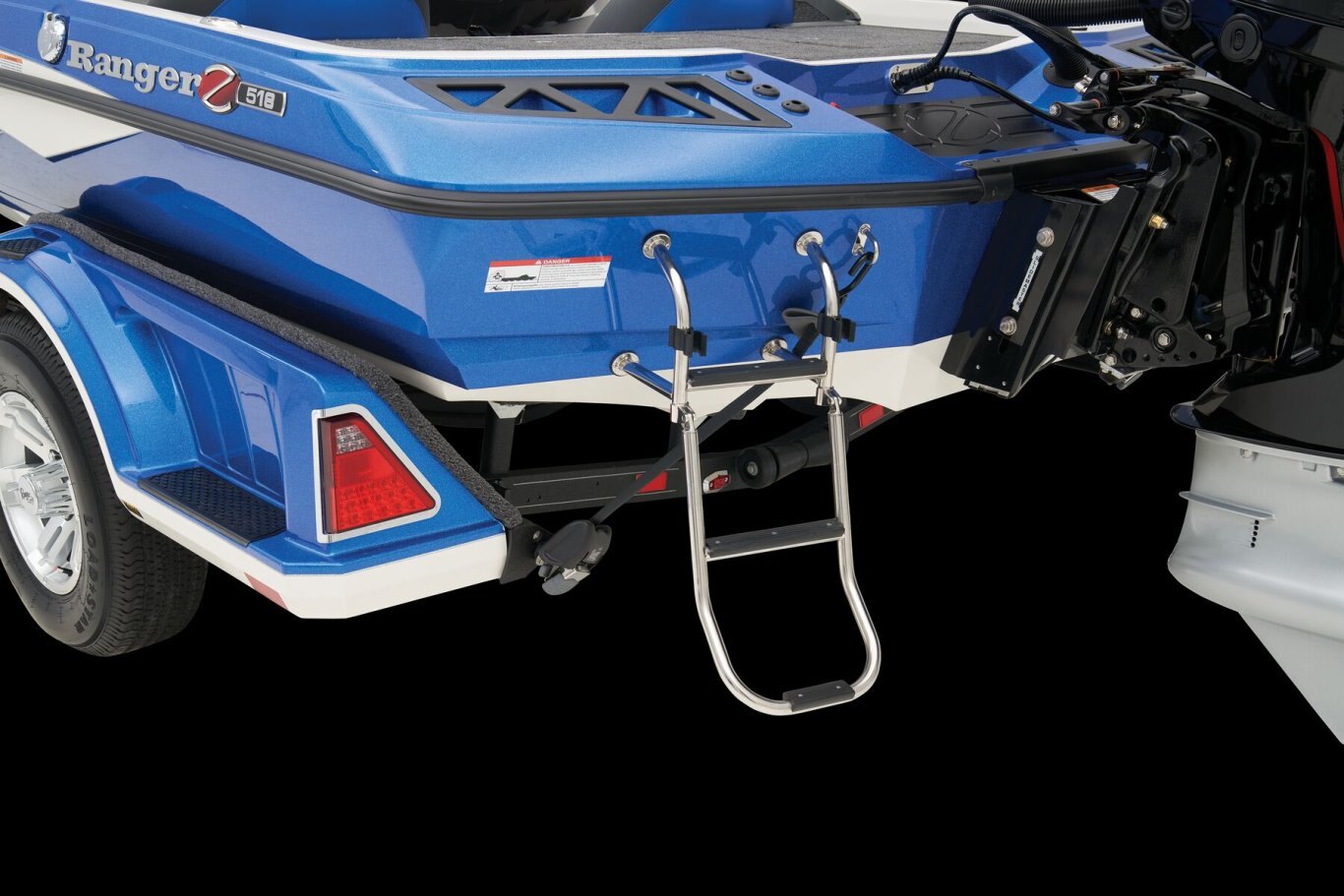 TRAILER FEATURES Ranger Trail® single axle trailer w/ torsion axles and c-channel frame Ranger® Boats Road Armor Equipped® trailer protectant coating 15" Machined/painted Raptor wheels w/ matching spare Ranger Trail® Vault® Hub lubrication system Fiberglass fenders w/ step pads Hydraulic surge disc brakes Swing-away tongue Integrated center-swing jack finished in black powdercoat Stainless steel ratcheting tie-downs LED lighting LED back-up lights NMMA®/NATM certified