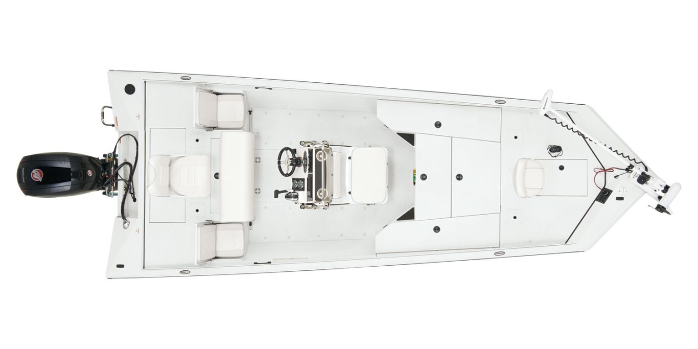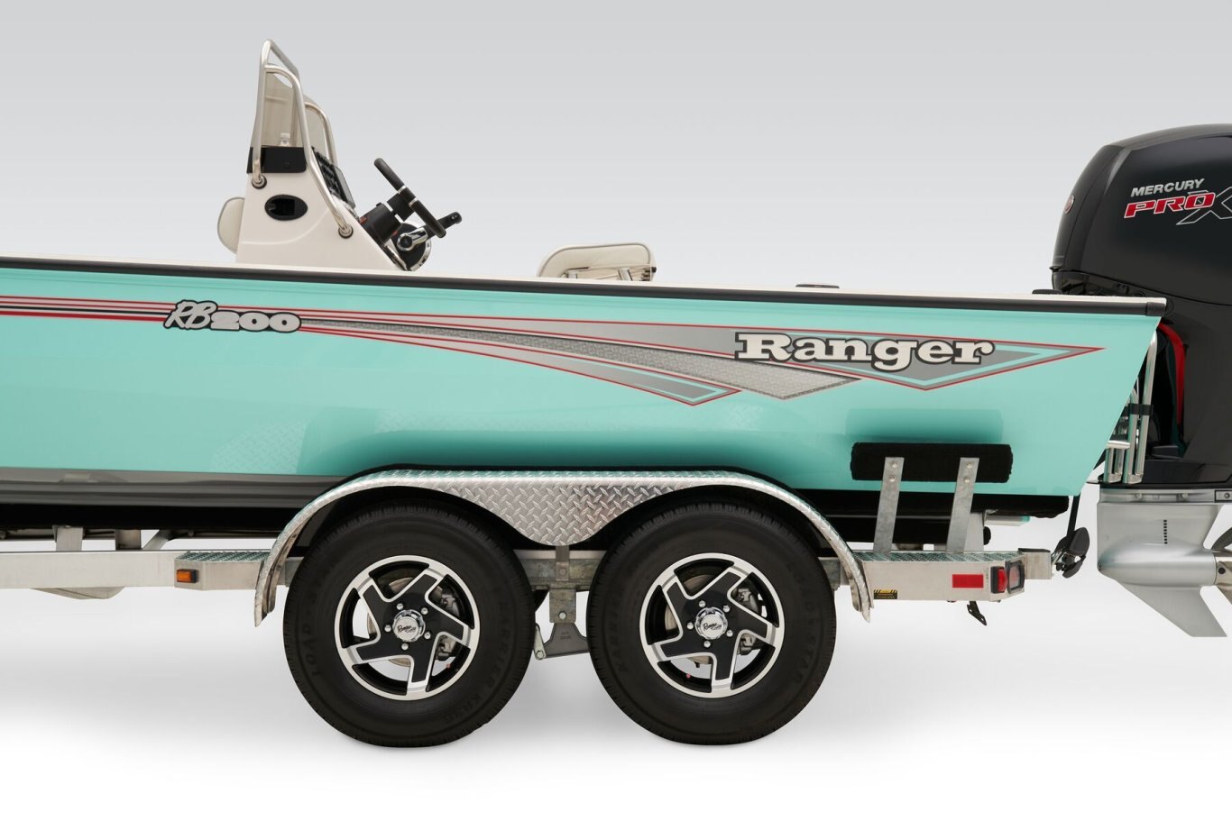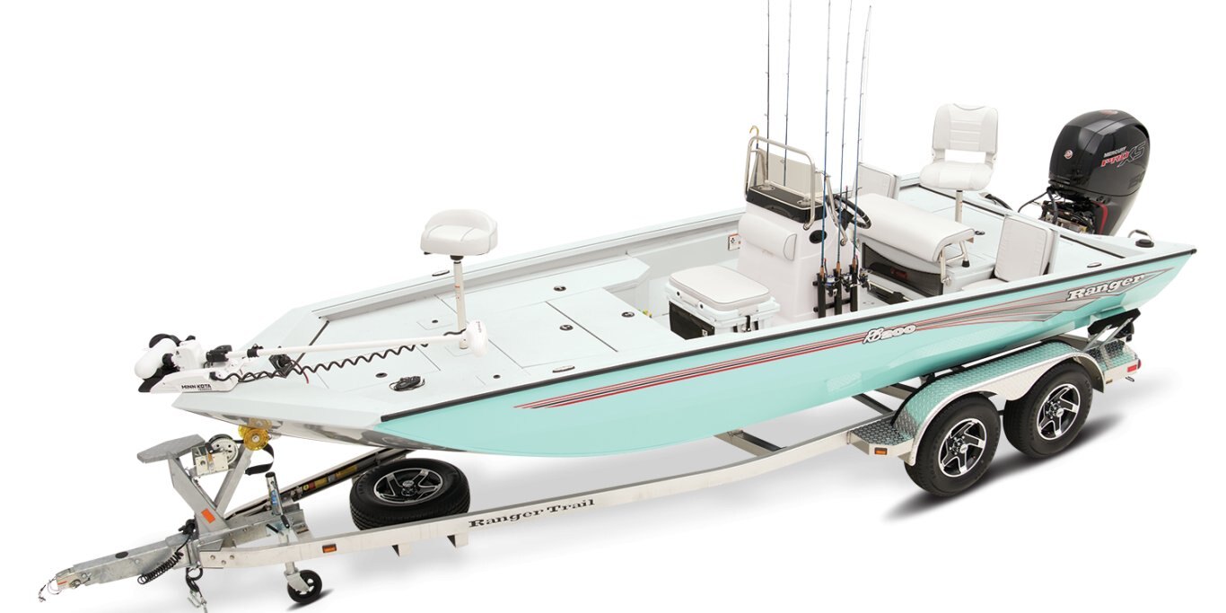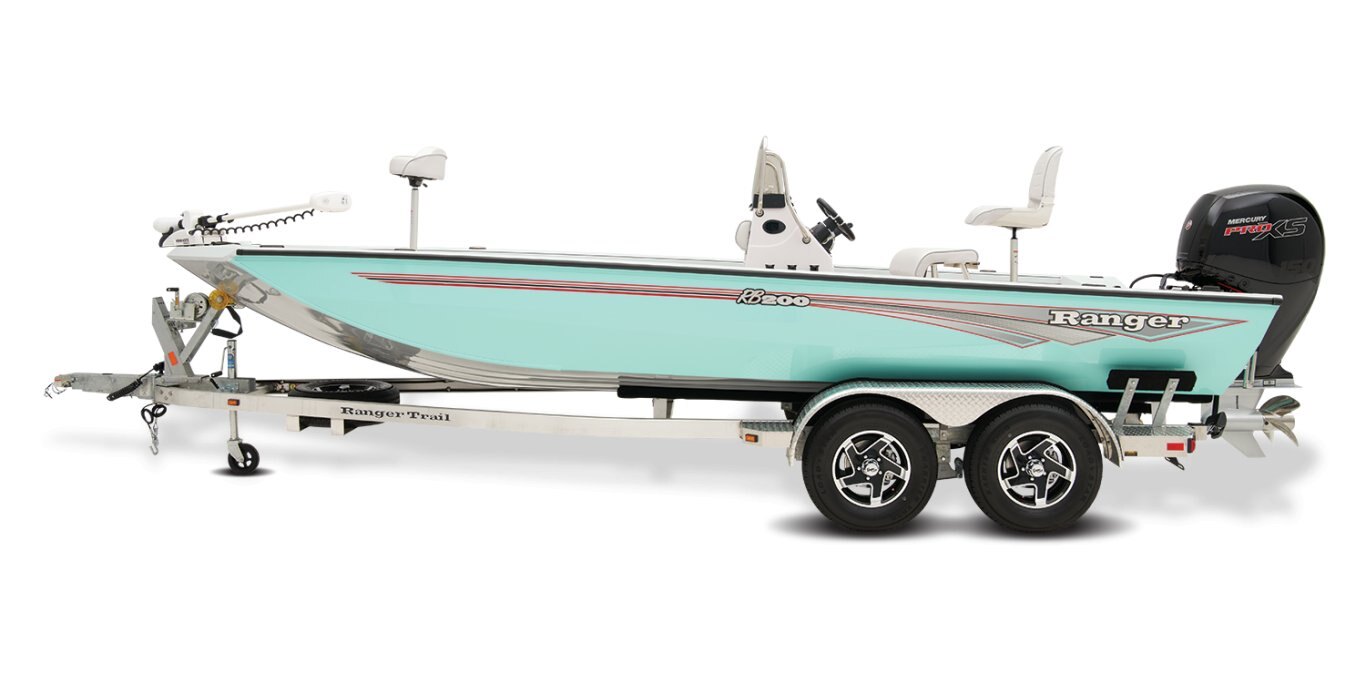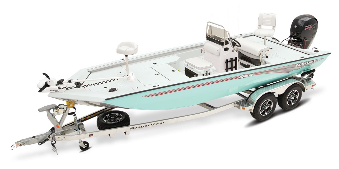 The RB200 packs more muscle in a bigger hull for greater performance, stability and capability to take you further than ever. The pad-bottom hull is designed for a dry ride that planes in a hurry, even in the shallows. The all-welded hull delivers strength in chop while precision steering and throttle control give you the ultimate in command. The wide, stable front casting deck delivers huge room for multiple anglers, and the interior is perfectly tailored for taking on inshore fisheries or a bass tournament with dual livewells and rod boxes, a huge in-deck storage and storage under the rear jump seats. At the helm, electronics up to 9" may be flush mounted and membrane-style switching delivers convenient simplicity. The ruggedized Ranger Trail® trailer is constructed with all-welded aluminum for the utmost in corrosion-resistant strength. Diamond plate fenders offer a step up and protection from road debris. A new camo version is more than just a paint scheme, this special rig features blacked-out badging, matte black closures and console railing, along with an all-black steering wheel for maximum concealment. No matter where your quarry swims, the enhanced capability of the RB200 is designed to Dominate Inshore and Nearshore.