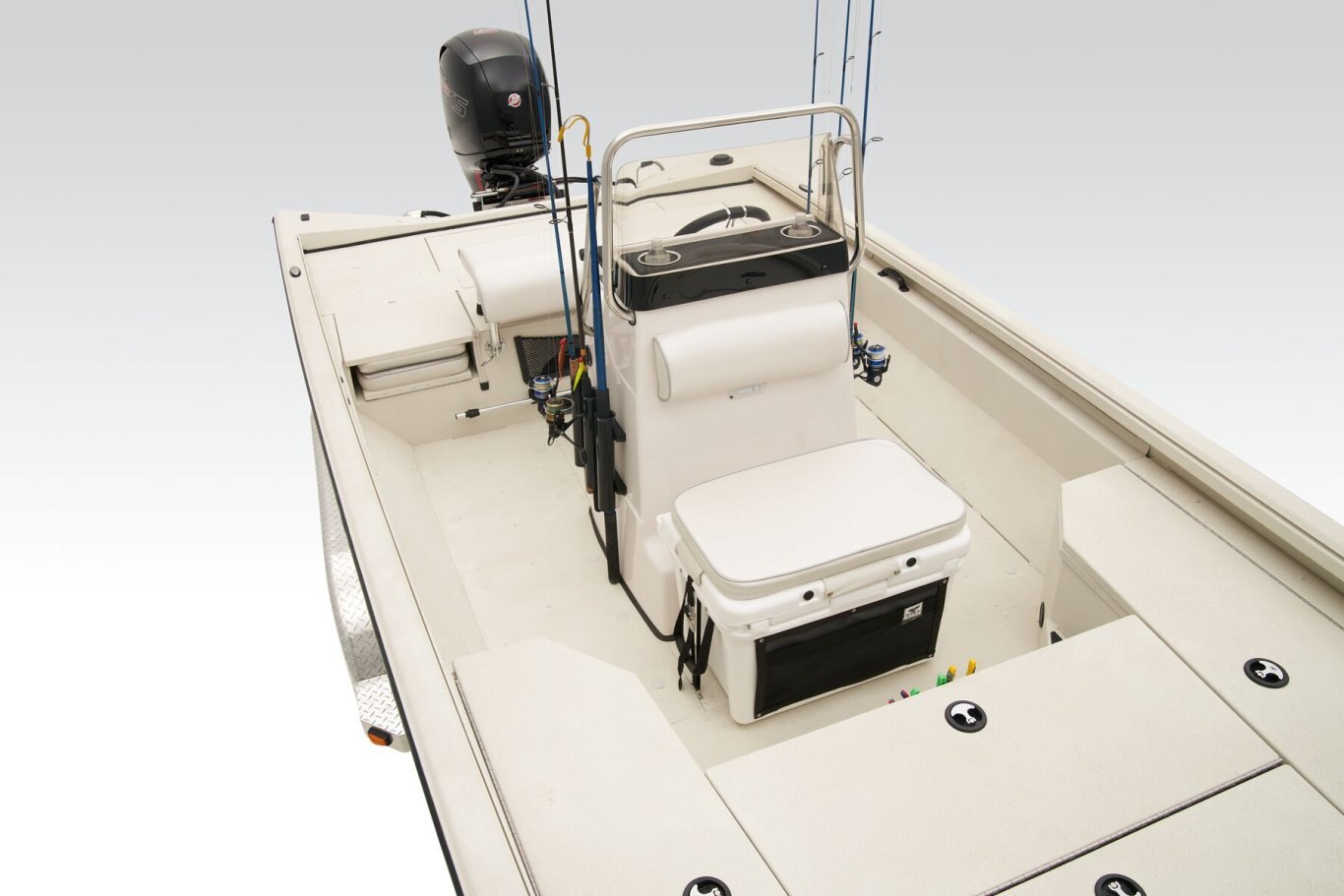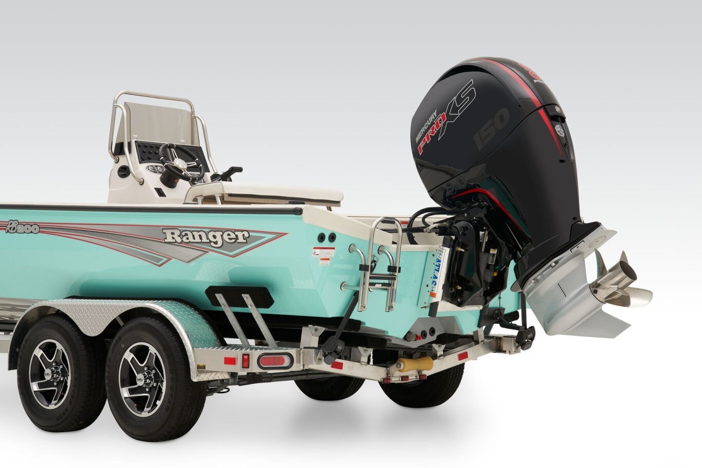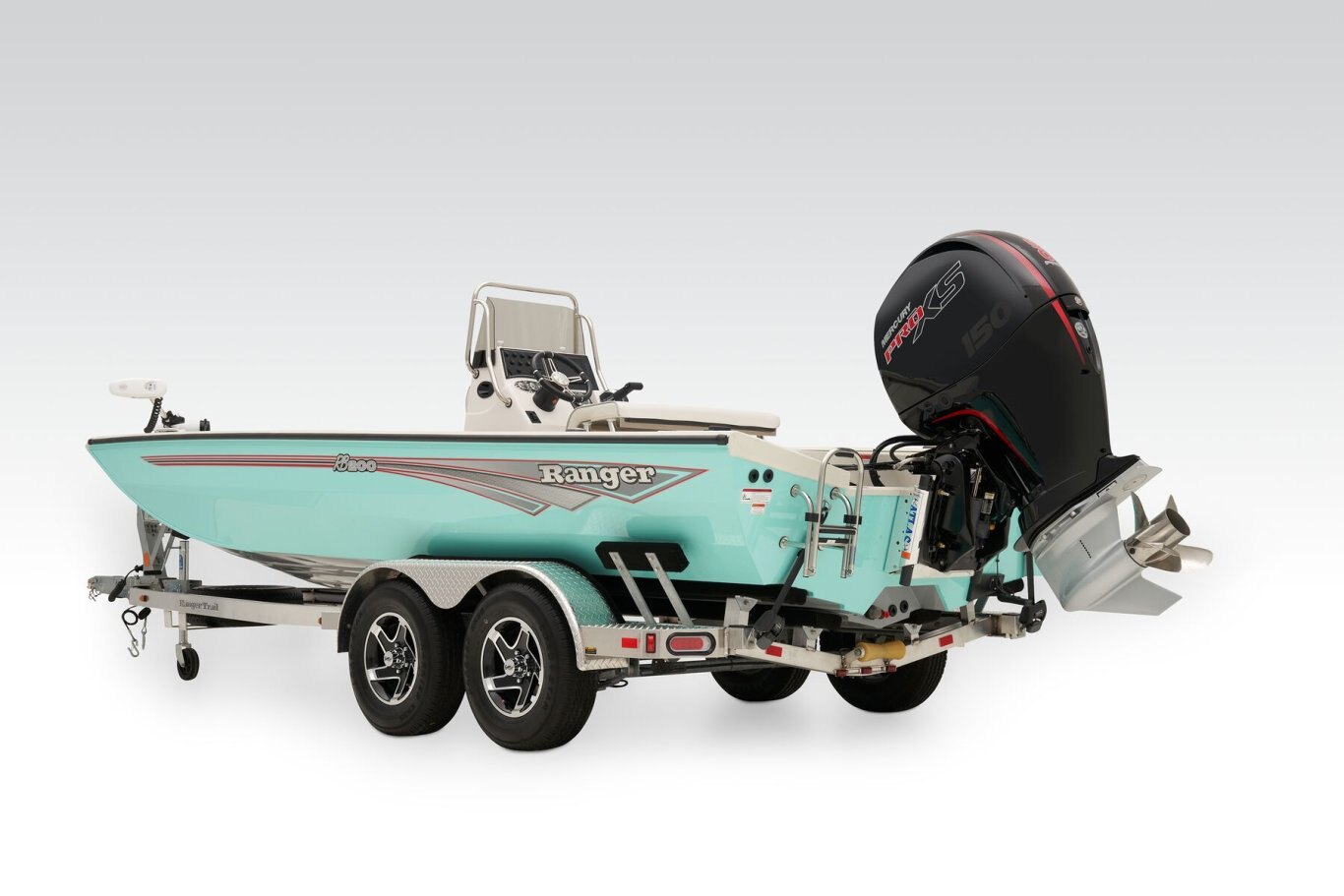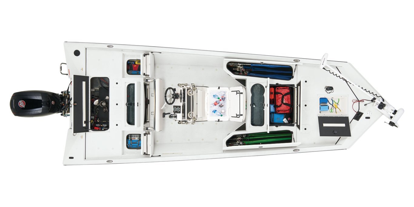 The RB200 packs more muscle in a bigger hull for greater performance, stability and capability to take you further than ever. The pad-bottom hull is designed for a dry ride that planes in a hurry, even in the shallows. The all-welded hull delivers strength in chop while precision steering and throttle control give you the ultimate in command. The wide, stable front casting deck delivers huge room for multiple anglers, and the interior is perfectly tailored for taking on inshore fisheries or a bass tournament with dual livewells and rod boxes, a huge in-deck storage and storage under the rear jump seats. At the helm, electronics up to 9" may be flush mounted and membrane-style switching delivers convenient simplicity. The ruggedized Ranger Trail® trailer is constructed with all-welded aluminum for the utmost in corrosion-resistant strength. Diamond plate fenders offer a step up and protection from road debris. A new camo version is more than just a paint scheme, this special rig features blacked-out badging, matte black closures and console railing, along with an all-black steering wheel for maximum concealment. No matter where your quarry swims, the enhanced capability of the RB200 is designed to Dominate Inshore and Nearshore.