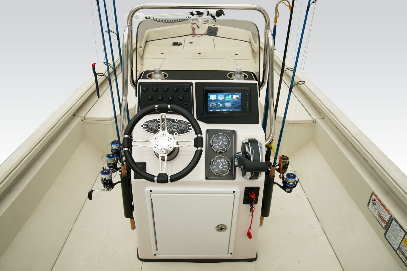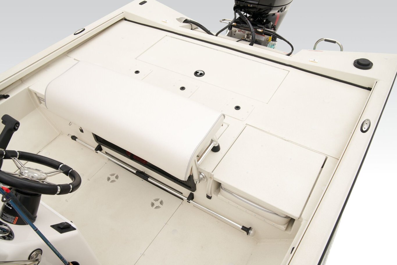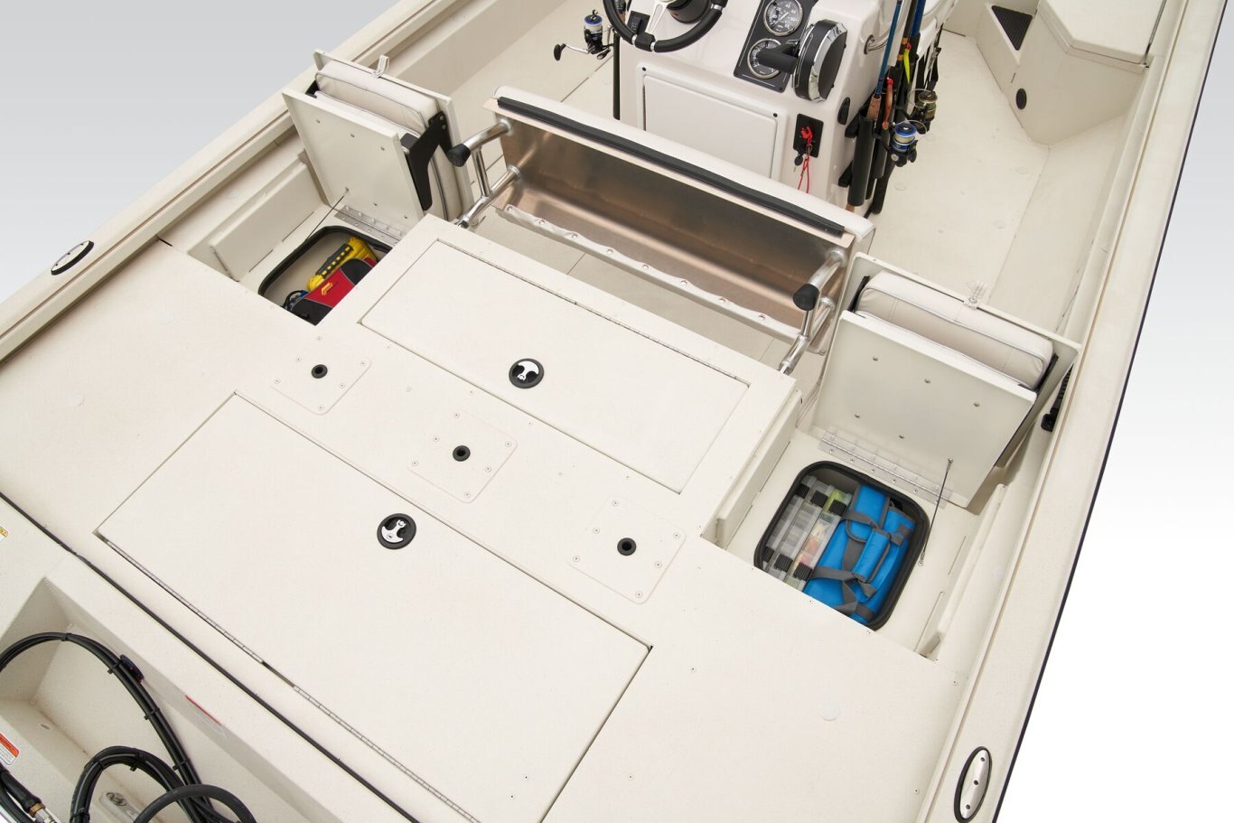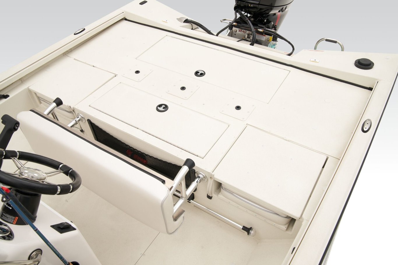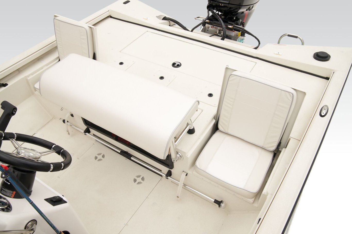 The RB200 packs more muscle in a bigger hull for greater performance, stability and capability to take you further than ever. The pad-bottom hull is designed for a dry ride that planes in a hurry, even in the shallows. The all-welded hull delivers strength in chop while precision steering and throttle control give you the ultimate in command. The wide, stable front casting deck delivers huge room for multiple anglers, and the interior is perfectly tailored for taking on inshore fisheries or a bass tournament with dual livewells and rod boxes, a huge in-deck storage and storage under the rear jump seats. At the helm, electronics up to 9" may be flush mounted and membrane-style switching delivers convenient simplicity. The ruggedized Ranger Trail® trailer is constructed with all-welded aluminum for the utmost in corrosion-resistant strength. Diamond plate fenders offer a step up and protection from road debris. A new camo version is more than just a paint scheme, this special rig features blacked-out badging, matte black closures and console railing, along with an all-black steering wheel for maximum concealment. No matter where your quarry swims, the enhanced capability of the RB200 is designed to Dominate Inshore and Nearshore.
