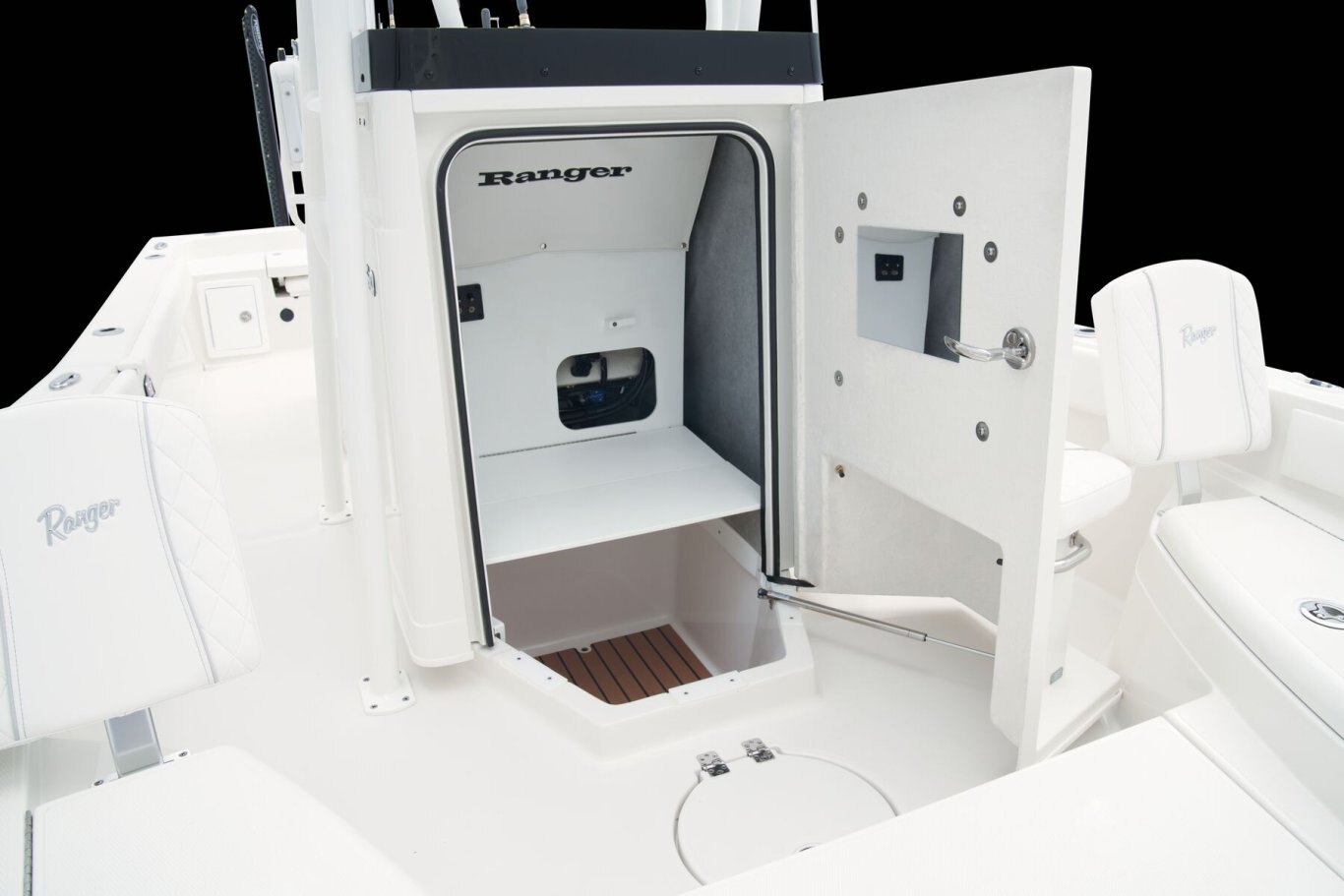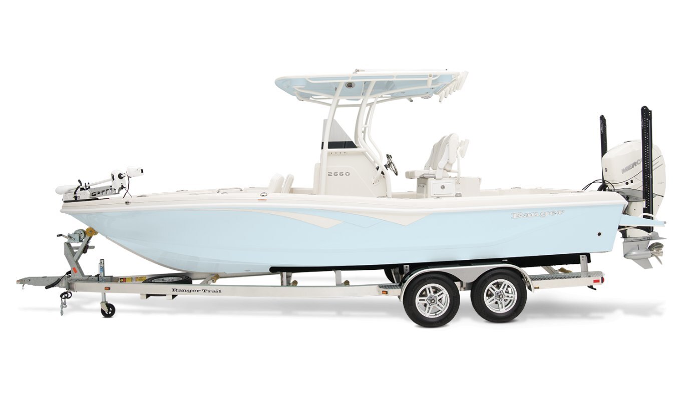 The 2660 Bay Ranger builds on Ranger’s sterling lineup of bay boats with a new hull, expanded capability and an extreme attention to detail to deliver incredible performance and fishability to pursue saltwater species around the globe. Twin rod storages and a massive fish box highlight the angler-centric front deck that is ideal for casting jigs or nets. Live bait rides behind the helm seat and/or in the front deck step for quick access to keep the bite going while rod holders throughout keep your gear handy. A rear swim platform and optional front-deck cushions add versatility to the 2660 for a family-oriented outing, but when it’s time to get after the fish the 400-horsepower rating offers excitement on demand. The Ranger 2660 boasts ample muscle for all of your blue water quests.