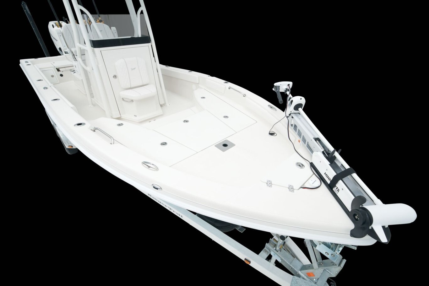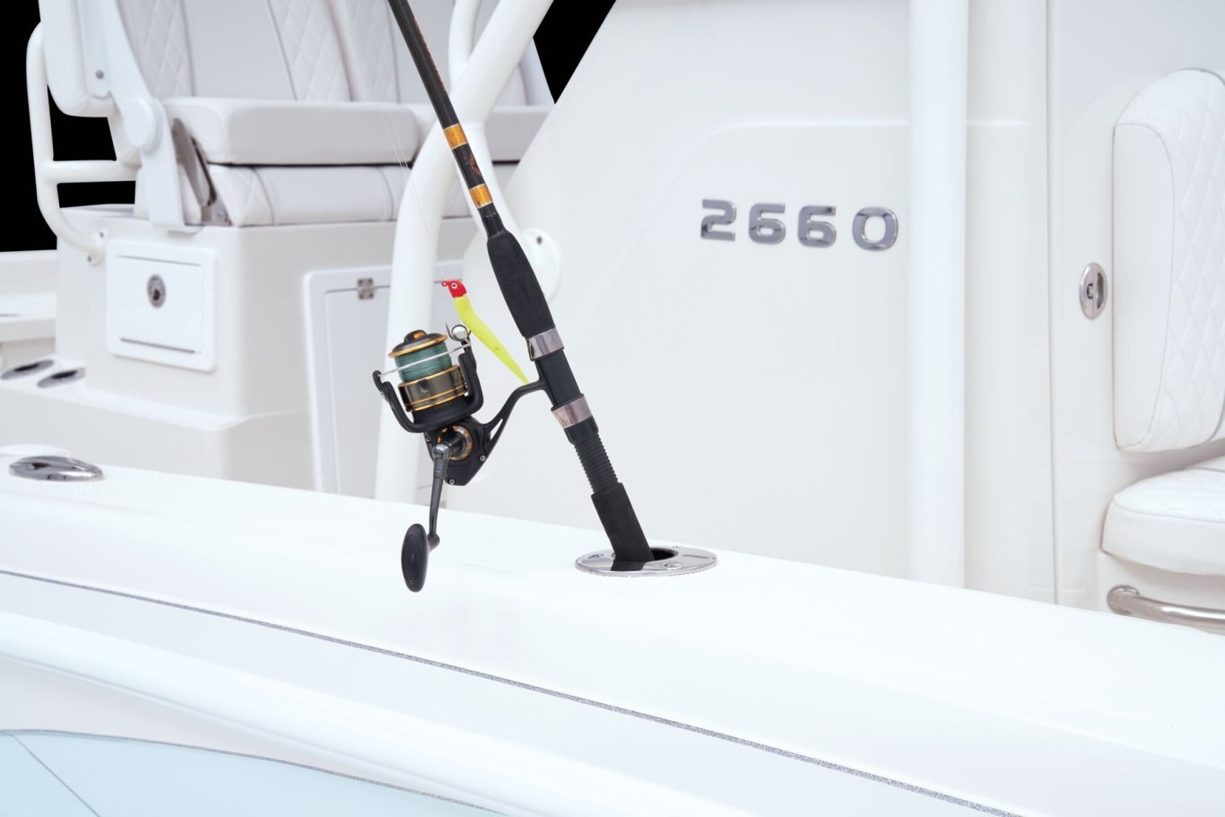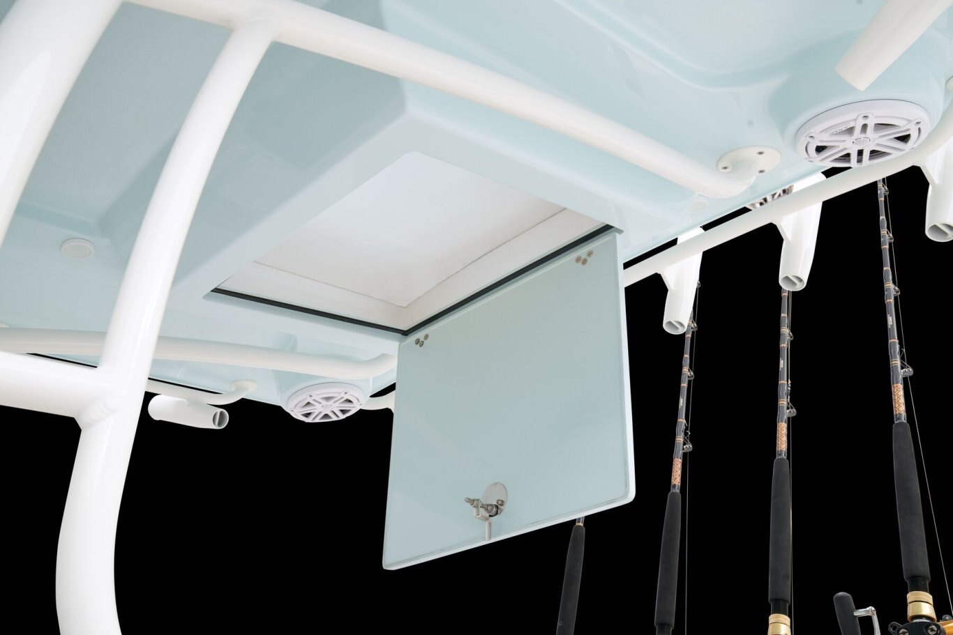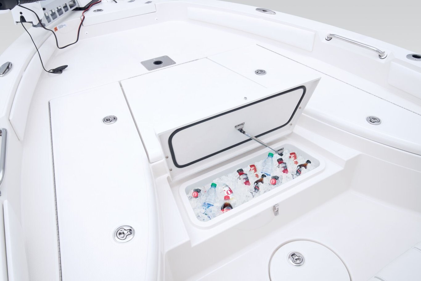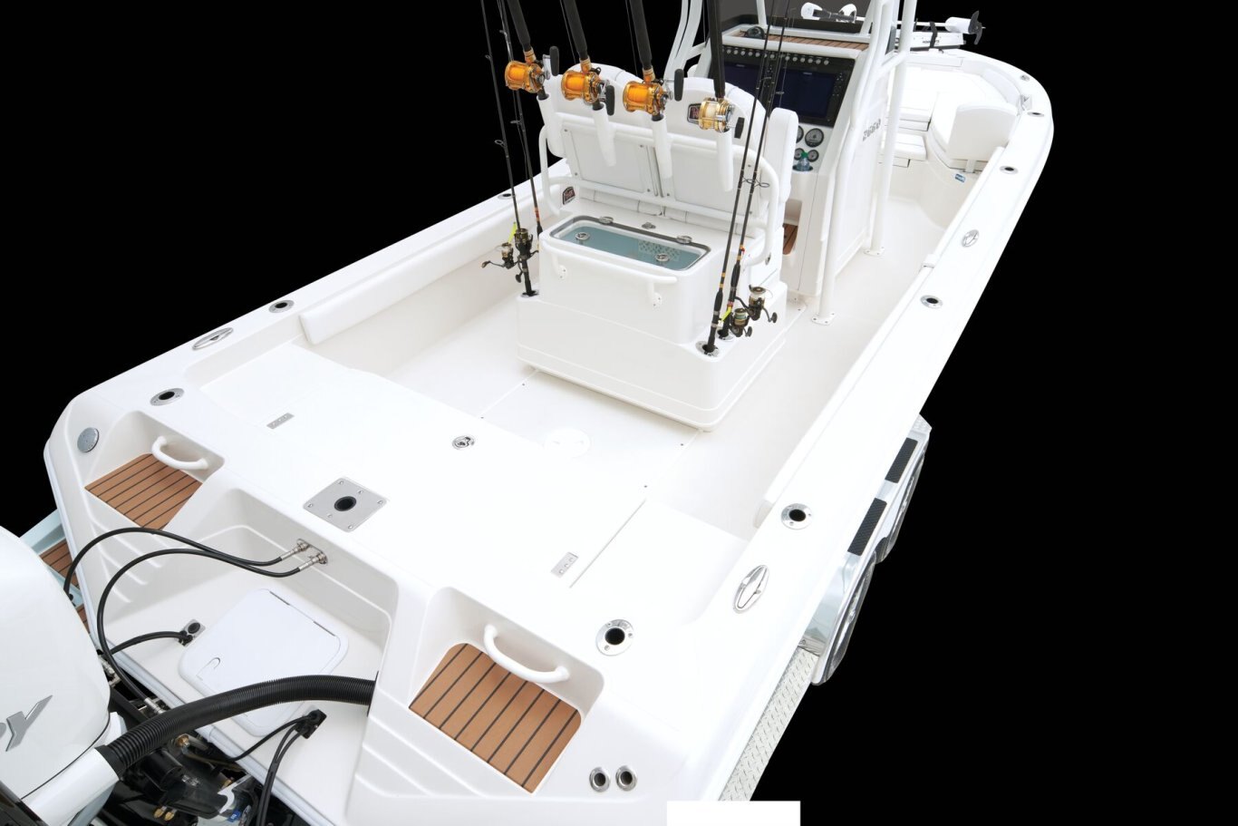 CUSTOM DETAILS Access hatch for quick pump and shut-off access Anchor locker w/ overboard drain Fully bolstered cockpit Gunnel and transom rod holders (10) In-floor bucket storage On demand fresh water wash down Patented Power Ventilation Rod Storage™ Rod storage & port rod tubes Storage under front & rear deck Gelcoated storage boxes Anchor locker w/ protective stainless steel plate for tie-off Stainless steel compression lid locks Stainless steel fittings Stainless steel gas spring lid assist Custom 320 quart fish box w/ large overboard drain Leaning post rod holders (4) Polished stainless steel pedestal base Built-in 120 quart cooler Trim tabs 12"x12" Fresh water and raw water washdowns Exhaust fan & light under console