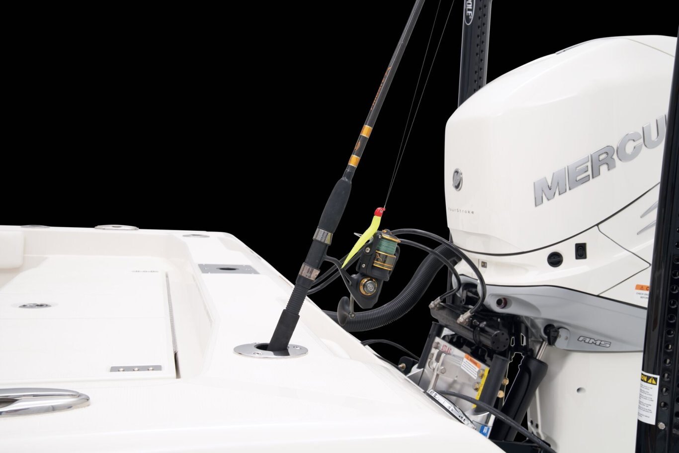 SAFETY/COMFORT Heavy duty rubrail offered in white or black Fire extinguisher & horn Easy entry transom steps Step in console Skid-resistant deck & interior Plexi windshield Upright, level flotation Custom-fitted premium marine upholstery: leaning post w/ 40 gal. baitwell & added storage Folding rear bench seat w/ storage Self-bailing cockpit w/ stainless steel scuppers Stainless steel pull up tie cleats/ fore, aft, & midship Swim platform w/ boarding ladder Mirror on console cabin door