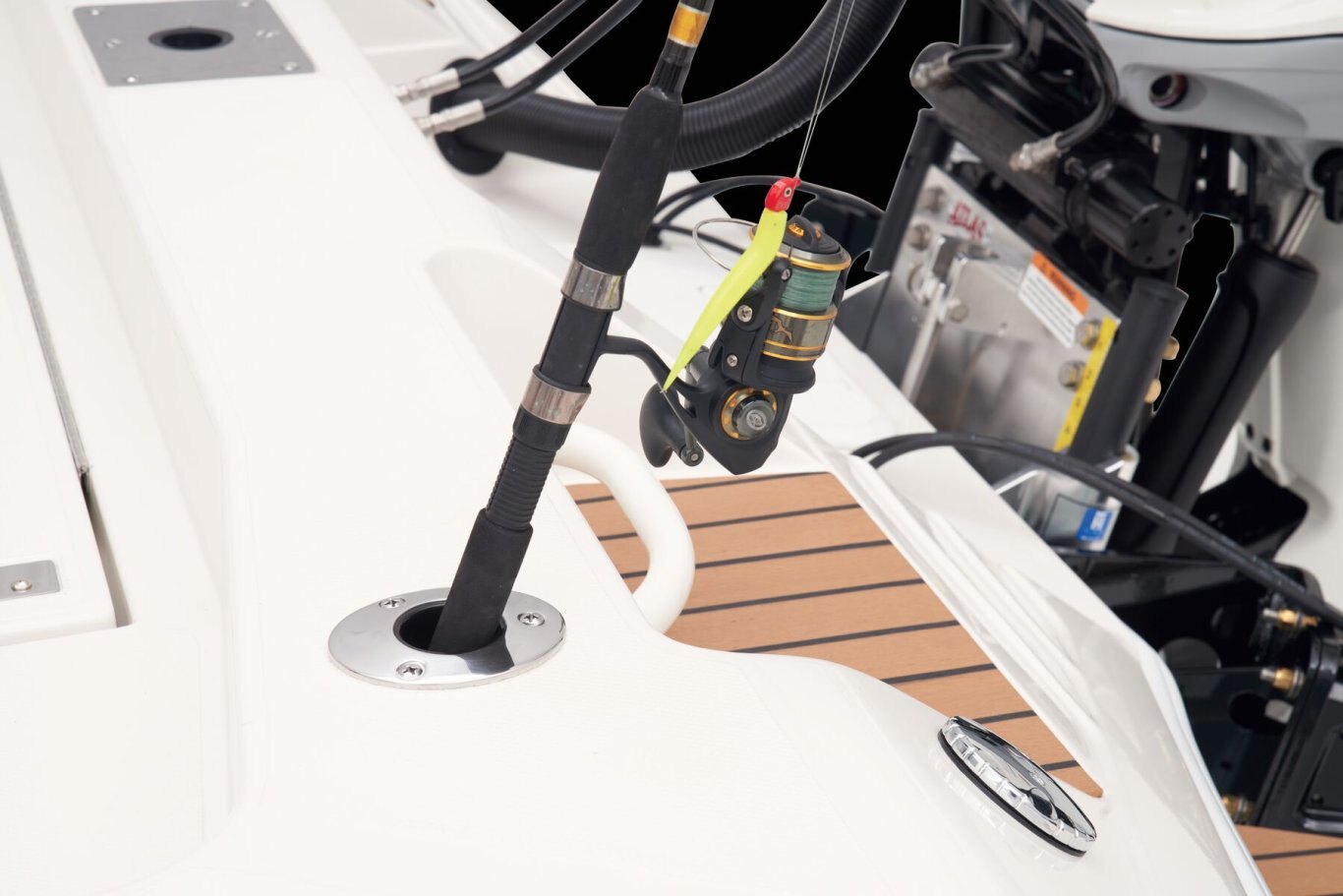POWER/PERFORMANCE Edson Comfort Grip stainless steel steering wheel w/ assist knob Master battery switch Binnacle throttle control High performance stainless steel prop Pultruded fiberglass transom Fiberglass stringer system Hydraulic tilt steering (may vary with engine model and setback plate) Recirculating aerated livewell/baitwell leaning post combination w/ high speed pickup, dual pumps & in-line filter, rear Hydraulic setback plate