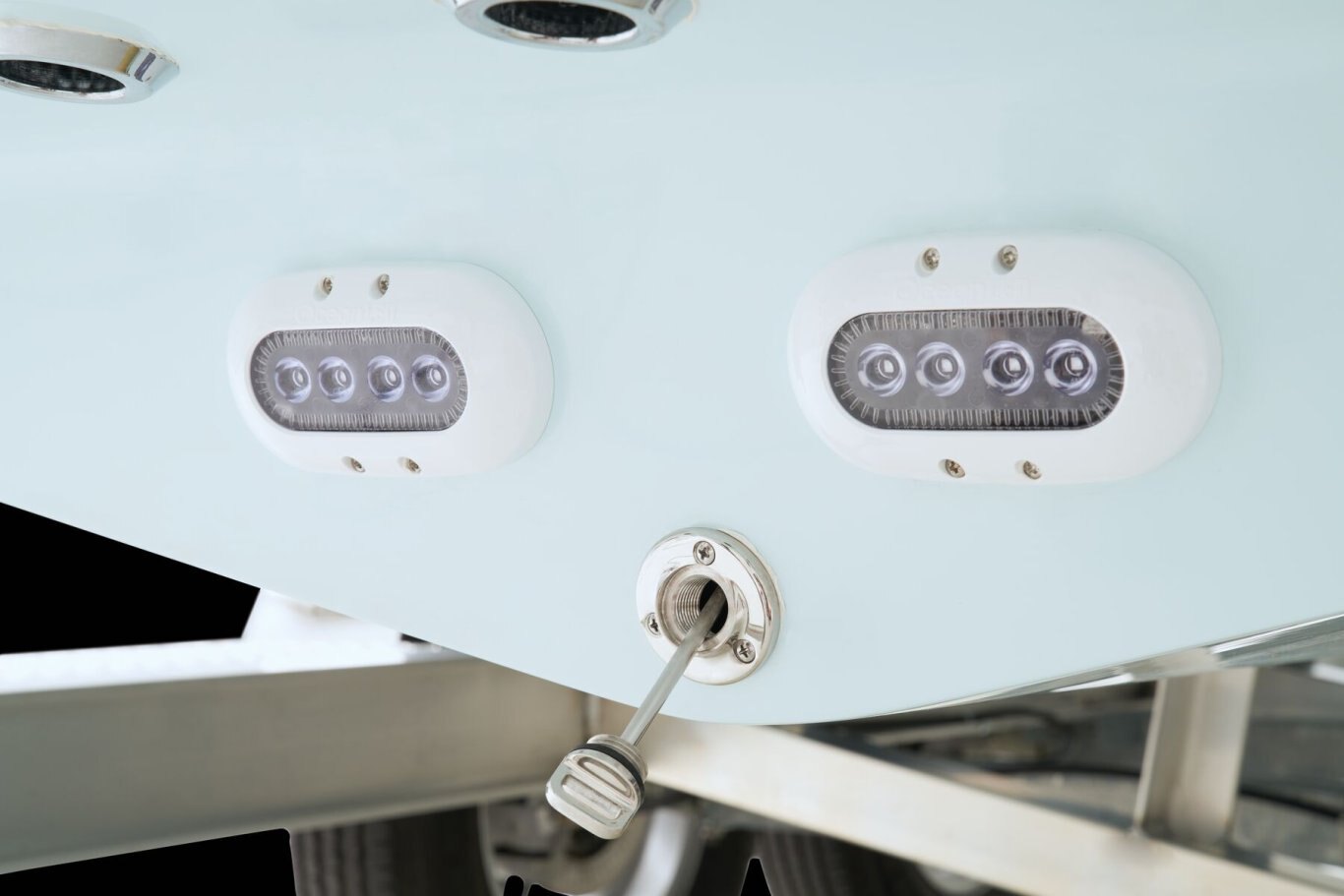 ELECTRONICS Digital speedometer, Tach, Fuel, Trim & Water Pressure by engine manufacturer Heavy duty 6 ga. TM wiring w/60 amp breakers Corrosion resistant wiring w/ resettable breakers 12V DC power receptacle Console panel w/ stainless push-button switching w/ 30 amp breaker LED cockpit, compartment & livewell light package LED under water lights