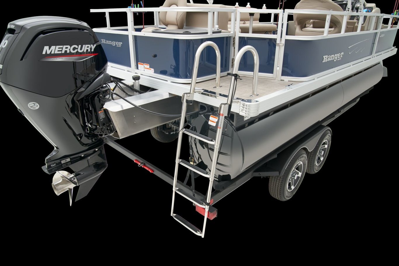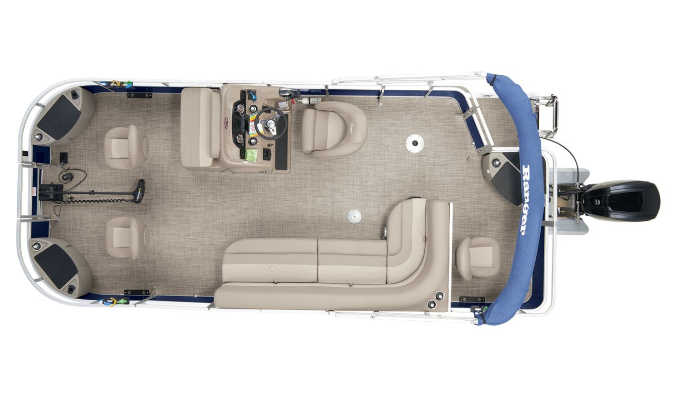 EXTERIOR NEW - Updated, modern graphics .032"-thick fence panels 4-step, fold-down, telescoping stainless steel boarding ladder w/ two tall handrails 1-1/4"(3.18cm), .090"(.23cm) thick anodized aluminum fence rails w/ decorative styling 24" (60.96 cm) diameter high-buoyancy multi-chambered pontoons w/ internal bracing for additional strength 3/4" (1.91 cm) deck w/ Limited Lifetime Warranty Aft boarding platform All-welded, all-aluminum extended PowerPod™ motor pod w/ built-in EPA-compliant fuel system Color: Black Metallic, Ranger Blue, or Matador Red Elevated fence panels for deck drainage & ventilation Extruded anodized aluminum deck edging w/ polished aft corner covers High-sheen fence finish for long-lasting good looks One-piece full-length M-bracket deck supports Protective exoskeleton rail & panel system for durability & quieter ride Channel for snapless mooring cover and optional tops Roto-molded furniture backs & bases for resistance to the elements Sound- & vibration-deadening fence insulation for a quiet ride Stainless or coated corrosion-resistant fasteners Factory-matched aluminum prop Factory-rigged Mercury® outboard motors