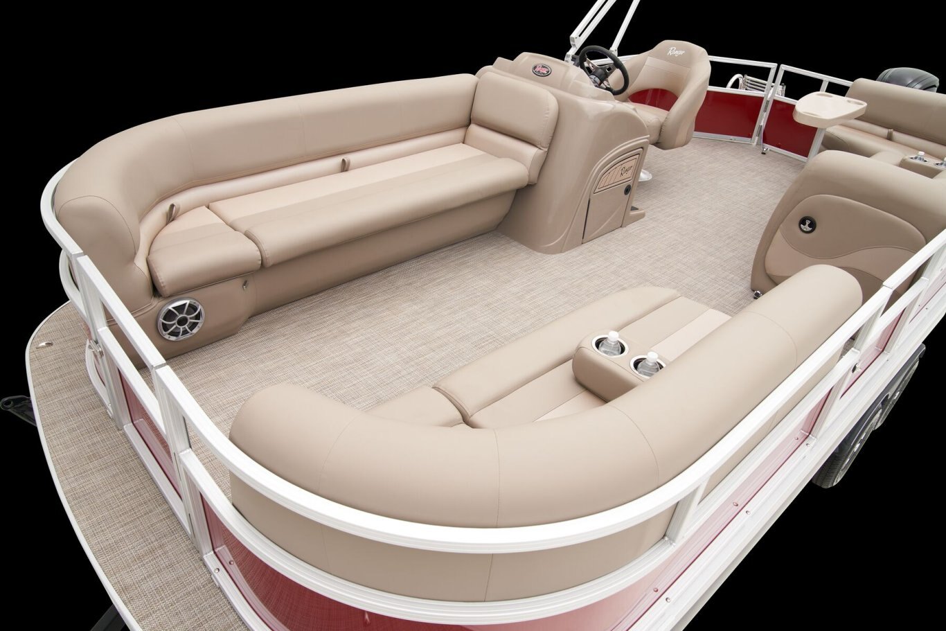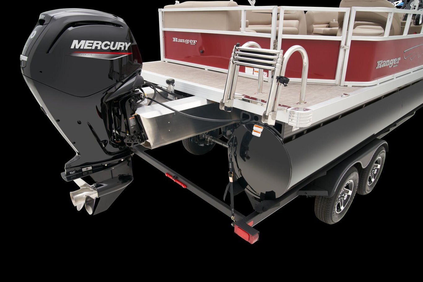 EXTERIOR NEW - Updated, modern graphics .032"-thick fence panels 4-step, fold-down, telescoping stainless steel boarding ladder w/ two tall handrails 1-1/4"(3.18cm), .090"(.23cm) thick anodized aluminum fence rails w/ decorative styling 24" (60.96 cm) diameter high-buoyancy multi-chambered pontoons w/ internal bracing for additional strength 3/4" (1.91 cm) deck w/ Limited Lifetime Warranty Full-width aft swim deck All-welded, all-aluminum extended PowerPod™ motor pod w/ built-in EPA-compliant fuel system Color: Black Metallic, Ranger Blue, or Matador Red Elevated fence panels for deck drainage & ventilation Extruded anodized aluminum deck edging w/ polished aft corner covers High-sheen fence finish for long-lasting good looks One-piece full-length M-bracket deck supports Channel for snapless mooring cover and optional tops Reinforced bow structure Roto-molded furniture backs & bases for resistance to the elements Sound- & vibration-deadening fence insulation for a quiet ride Stainless or coated corrosion-resistant fasteners Factory-matched aluminum prop Factory-rigged Mercury® outboard motors