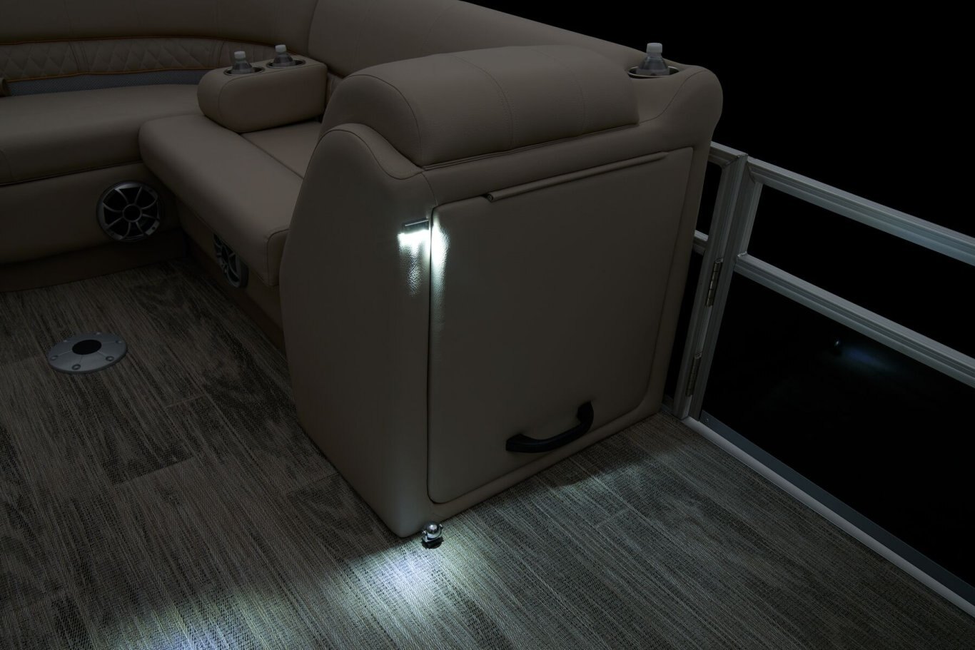 • Aft L-lounge with drained storage and movable drink holder