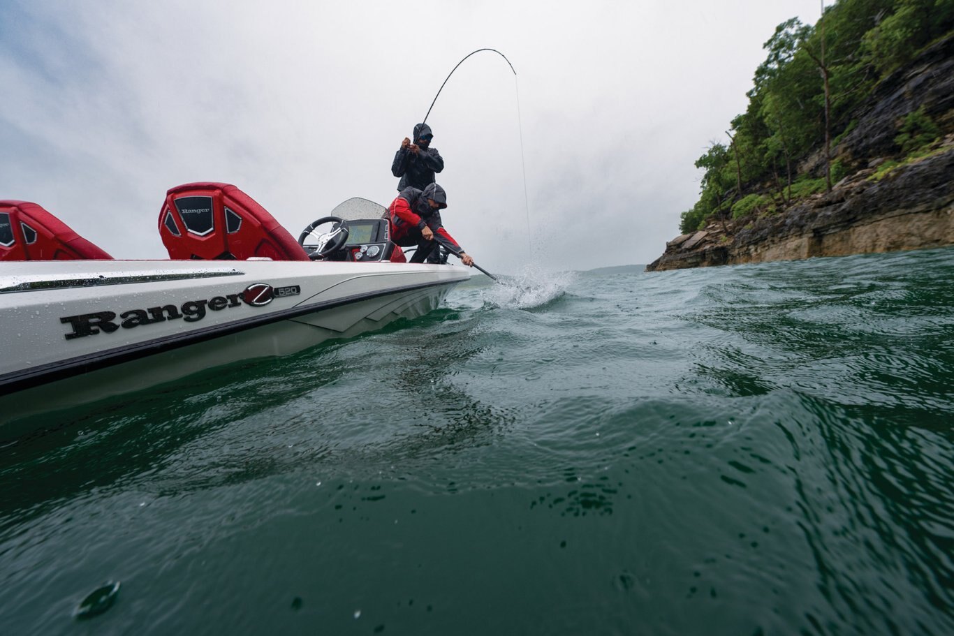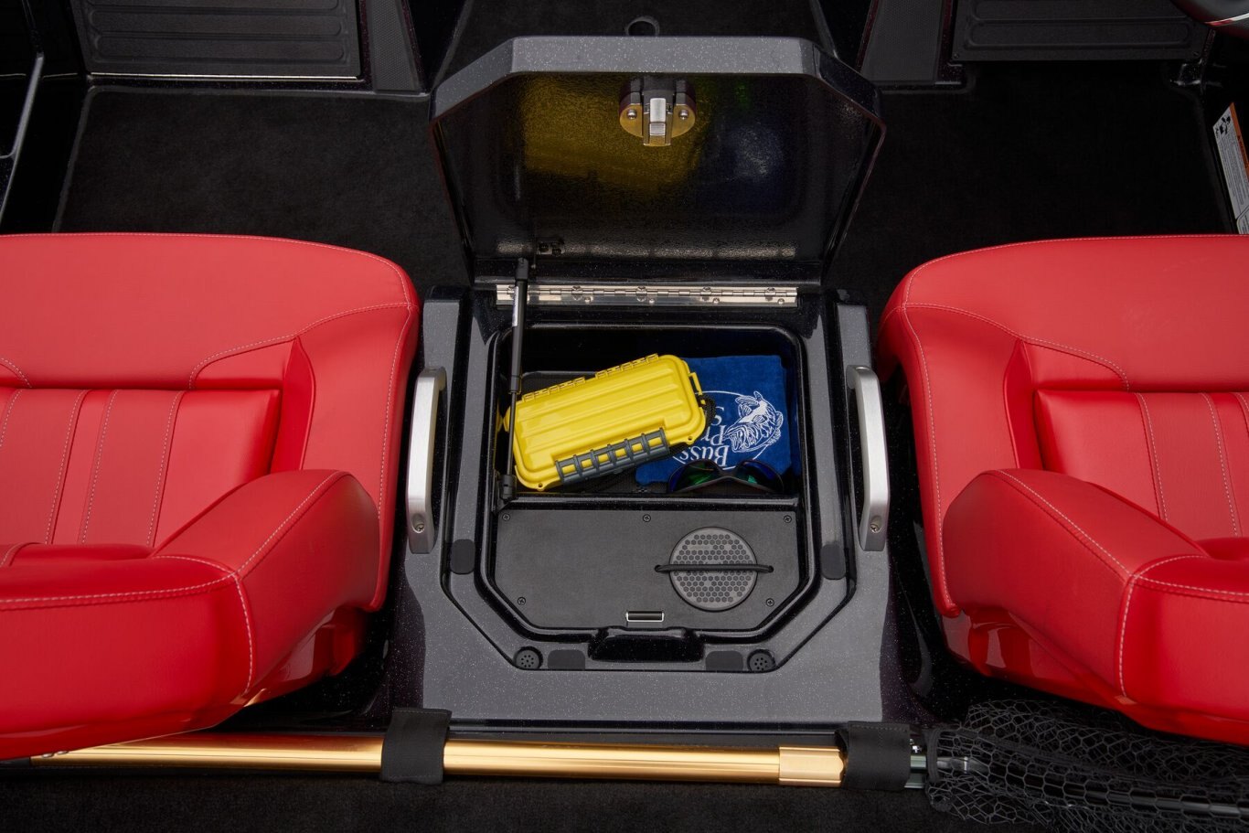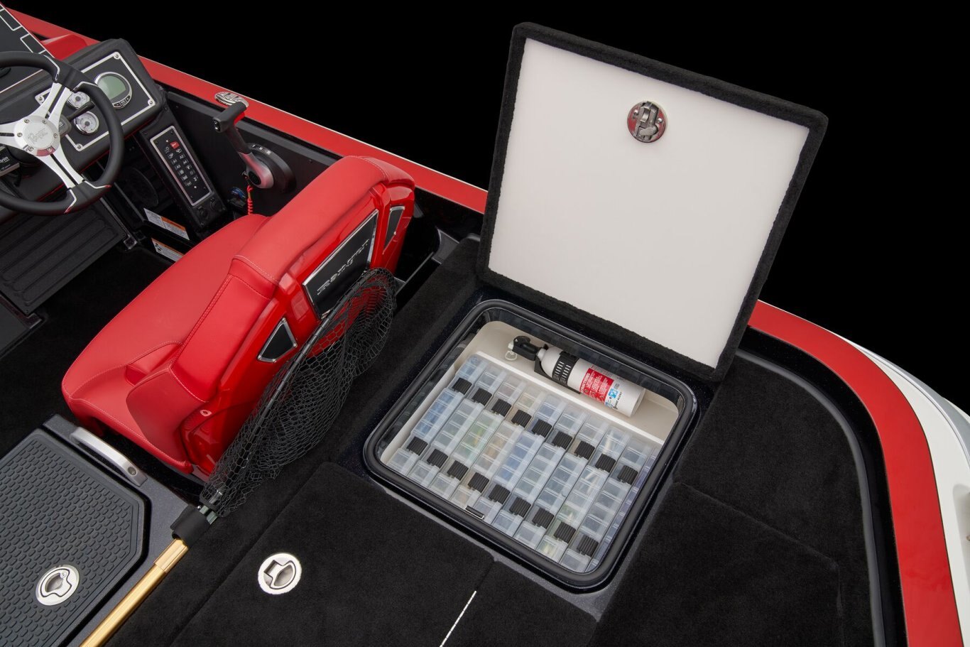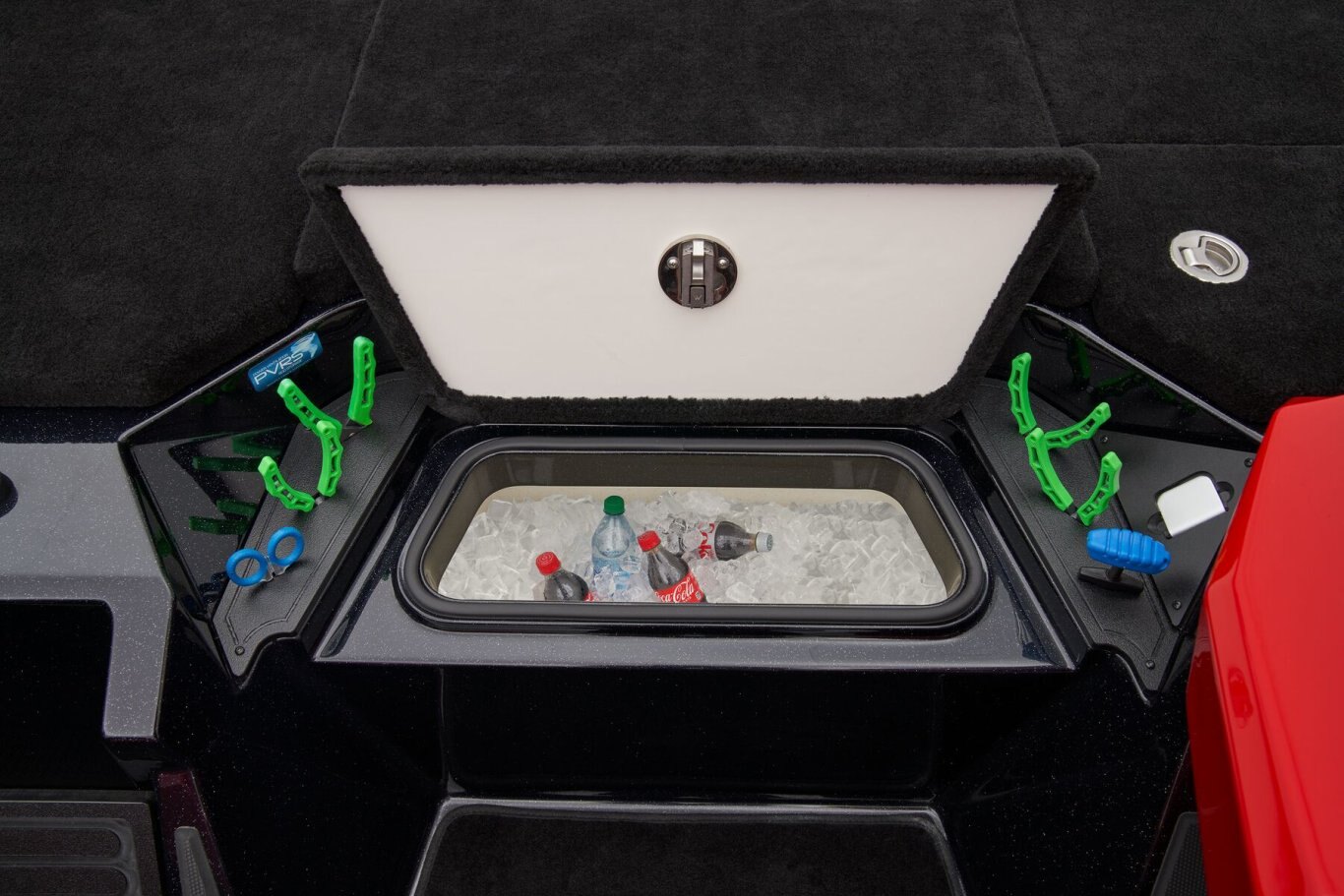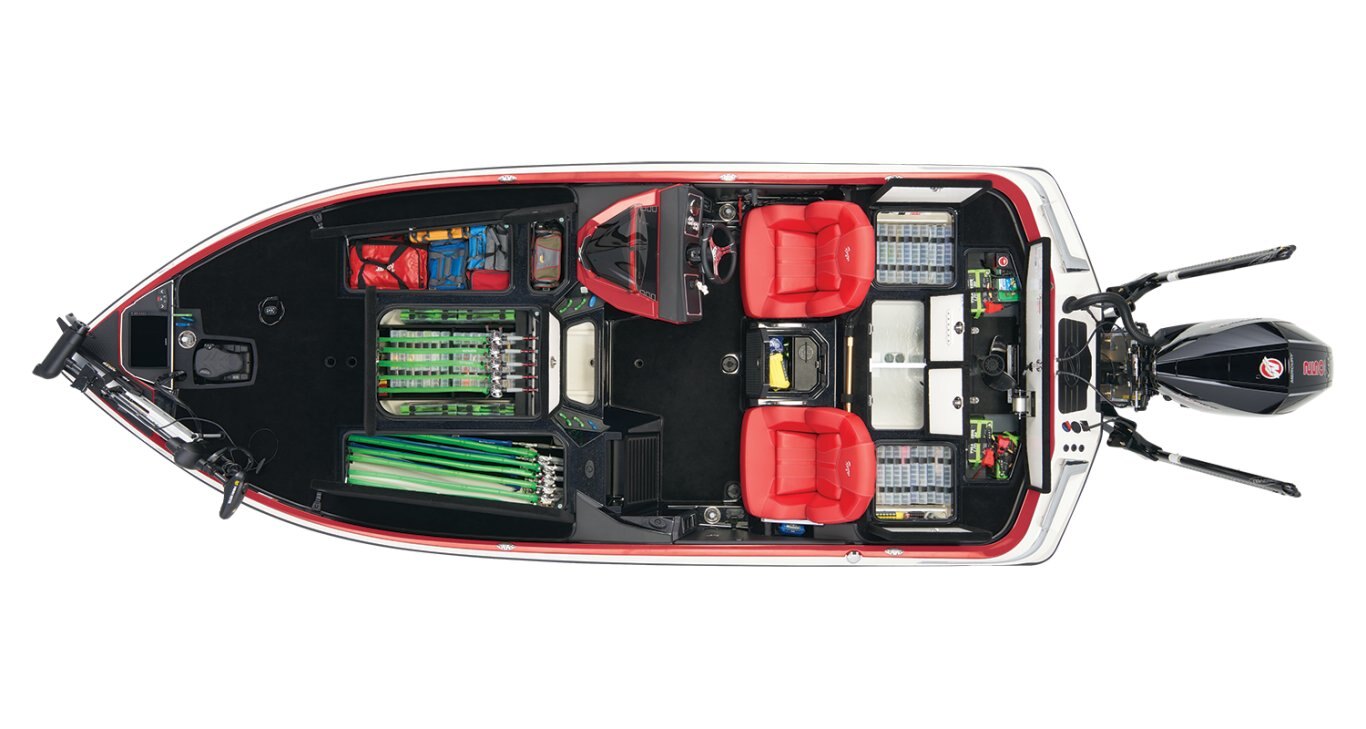 Custom Details Ranger Echelon™ Rod Storage System - 3-tiered port & 2-tiered starboard rod lockers Power Ventilation Rod Storage™ Insulated 40 qt. step-up cooler Integrated center-storage rod & tackle management system Stainless steel push-to-close locking latches Carpeted cockpit floor and compartment liner mats Ranger® tournament measuring board integrated at front deck step Runnin' rod rack w/ retractable strap Remote drain plug Tool holders at bow and front deck step Molded-in driver / passenger footrests Integrated stainless steel cup holders