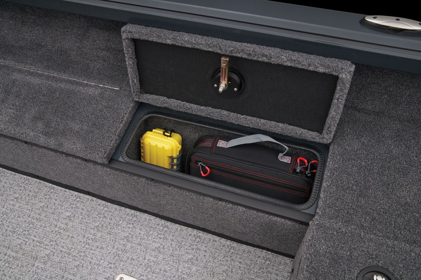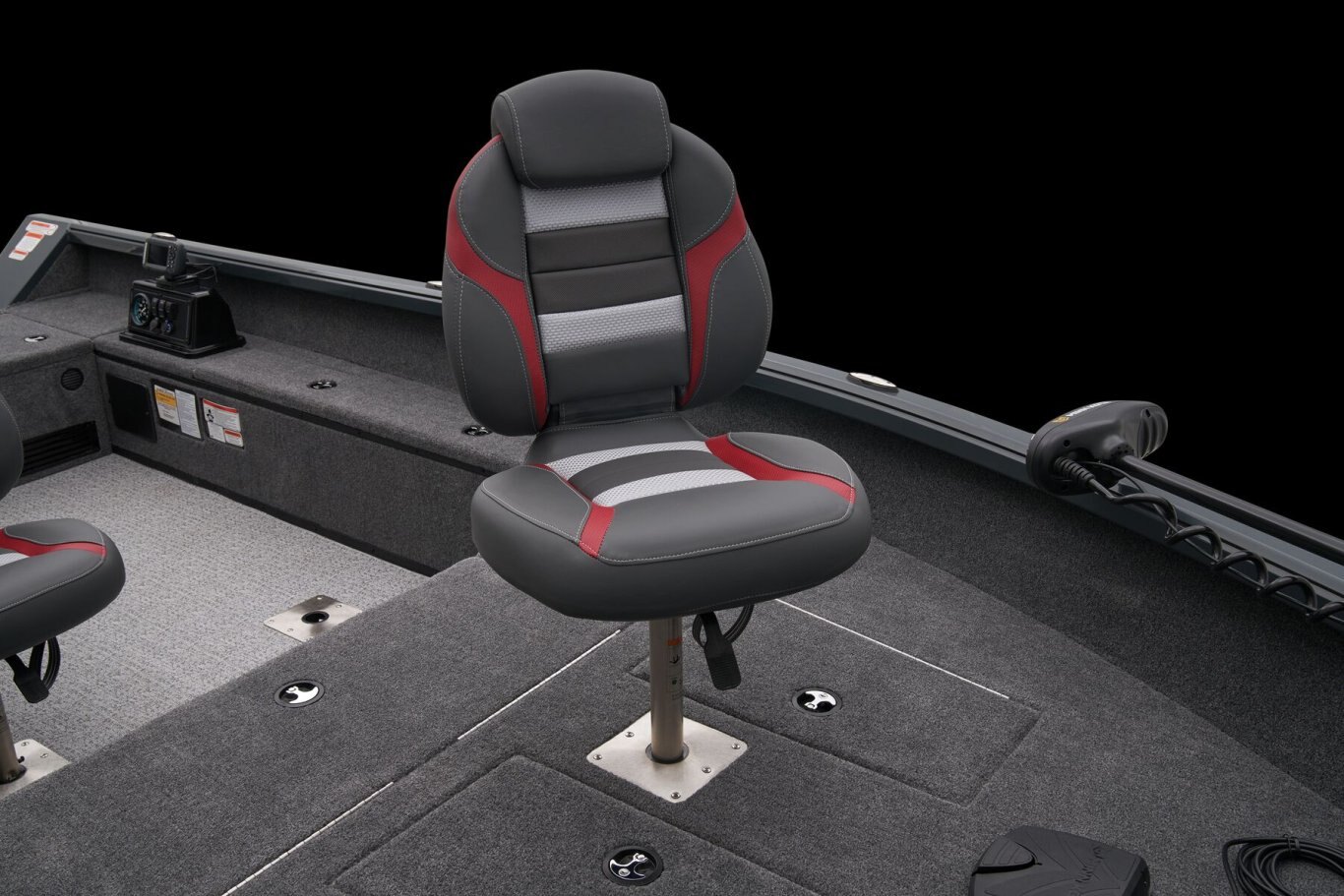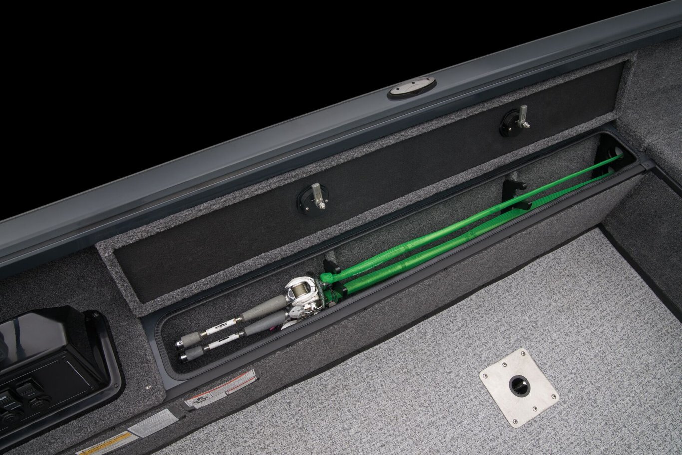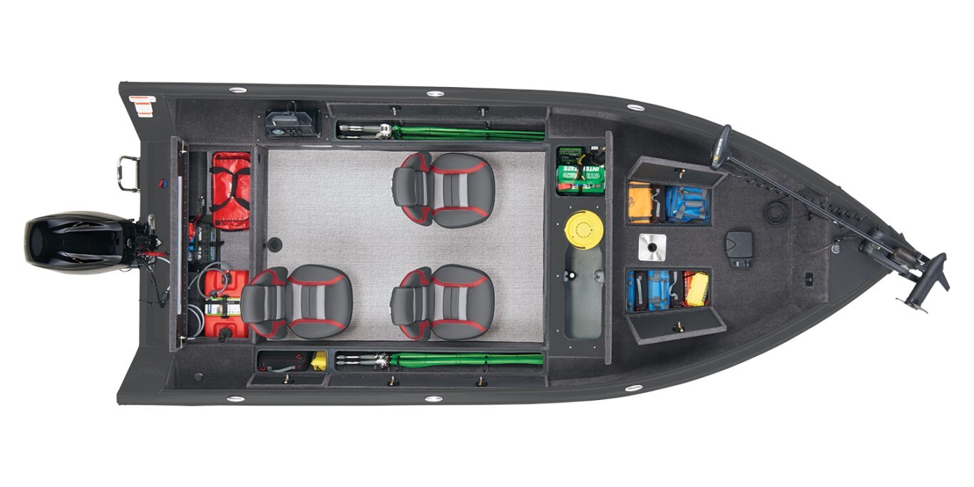 A wide-open cockpit with movable seating gives space for tending trolling lines while the front deck is ideal for casting. The timed and aerated livewell is at the rear of the deck adjacent trolling motor battery storage. Twin lockable 8' 6" rod boxes flank the cockpit, which is highlighted by a fiberglass gauge pod that houses a tach, twin USB ports and a 12V outlet, rocker switching and keyed ignition. Behind the driver's seat is a folding casting deck that hides up to two 6-gallon fuel tanks with the cranking battery. Every element of the VS1665 T combines to make One Thriller of a Tiller. |