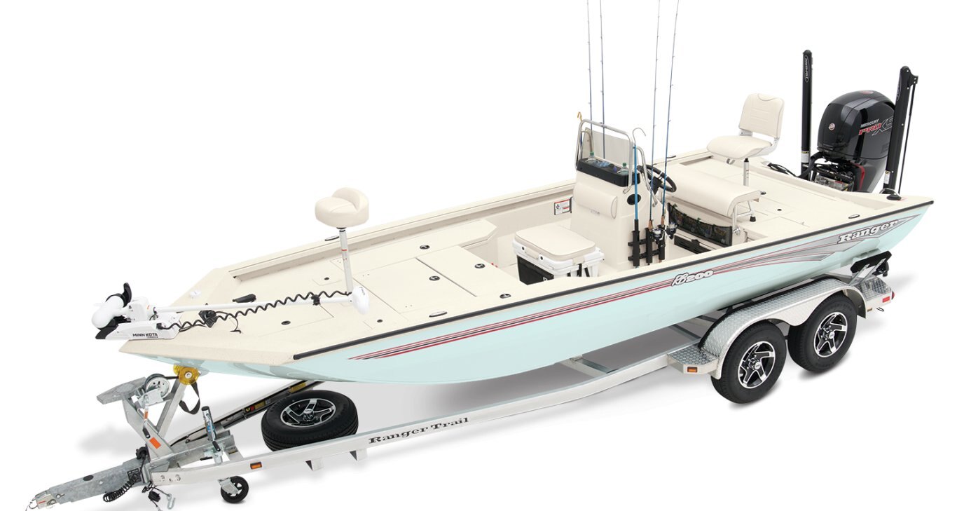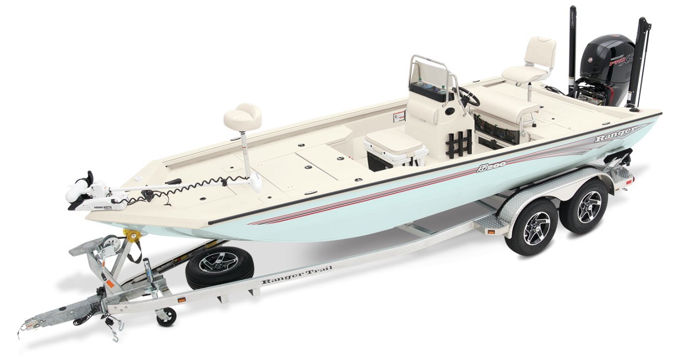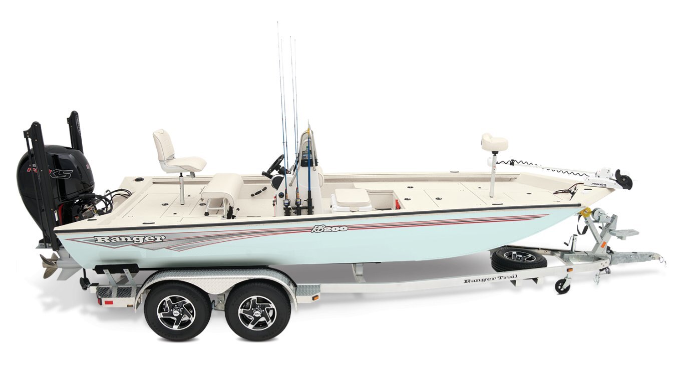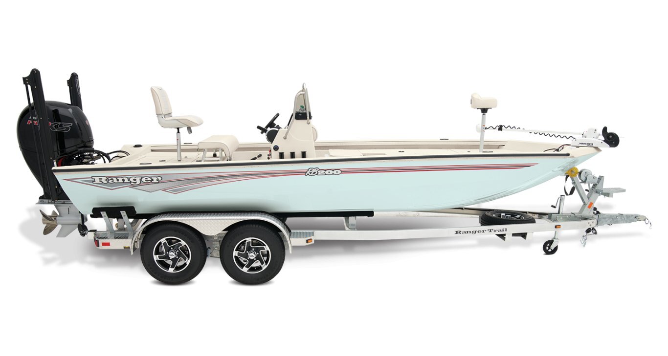 At the helm, electronics up to 9" may be flush mounted and the Ranger RIDE™ touchscreen display keeps critical engine parameters and boat functions at your fingertips. The ruggedized Ranger Trail® trailer is constructed with all-welded aluminum for the utmost in corrosion-resistant strength and diamond plate fenders offer a step up and protection from road debris. New paint schemes set this rig apart even more with premium paints that deliver long-lasting shine and durability in salty environments. No matter where your quarry swims, the enhanced capability of the RB200 is designed to Dominate Inshore and Nearshore.