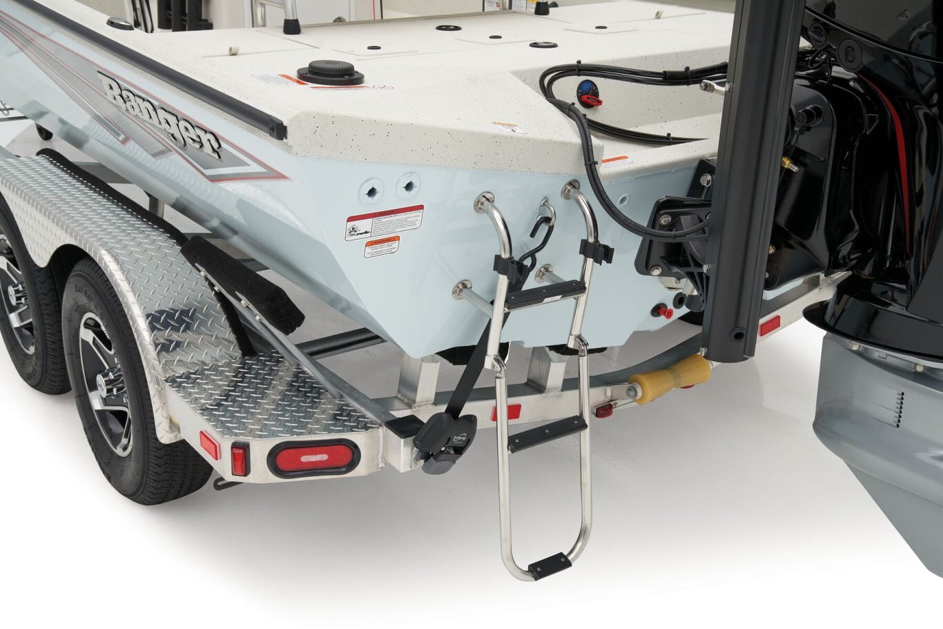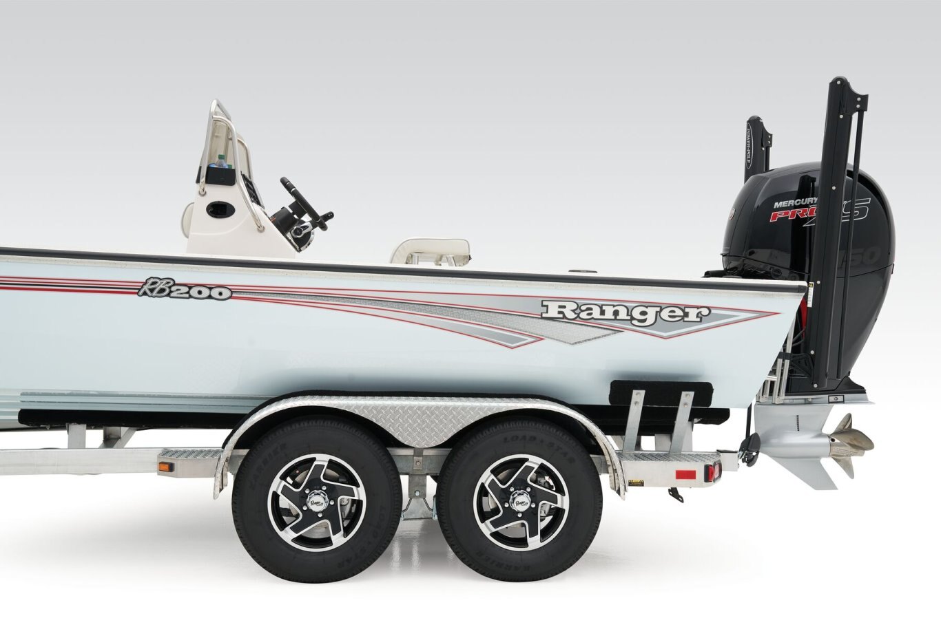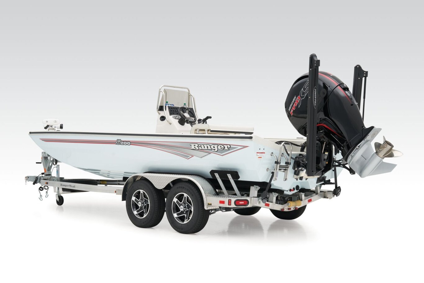At the helm, electronics up to 9" may be flush mounted and the Ranger RIDE™ touchscreen display keeps critical engine parameters and boat functions at your fingertips. The ruggedized Ranger Trail® trailer is constructed with all-welded aluminum for the utmost in corrosion-resistant strength and diamond plate fenders offer a step up and protection from road debris. New paint schemes set this rig apart even more with premium paints that deliver long-lasting shine and durability in salty environments. No matter where your quarry swims, the enhanced capability of the RB200 is designed to Dominate Inshore and Nearshore.
