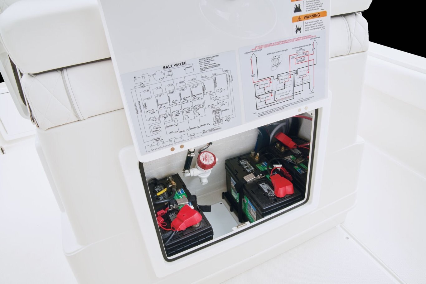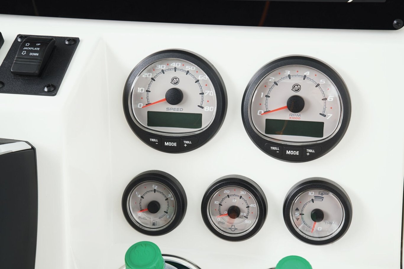 Electronics Digital speedometer, Tach, Fuel, Trim & Water Pressure by engine manufacturer Heavy duty 6 ga. TM wiring w/60 amp breakers Corrosion resistant wiring w/ resettable breakers 12V DC power receptacle Console panel w/ stainless push-button switching w/ 30 amp breaker LED cockpit, compartment & livewell light package LED under water lights