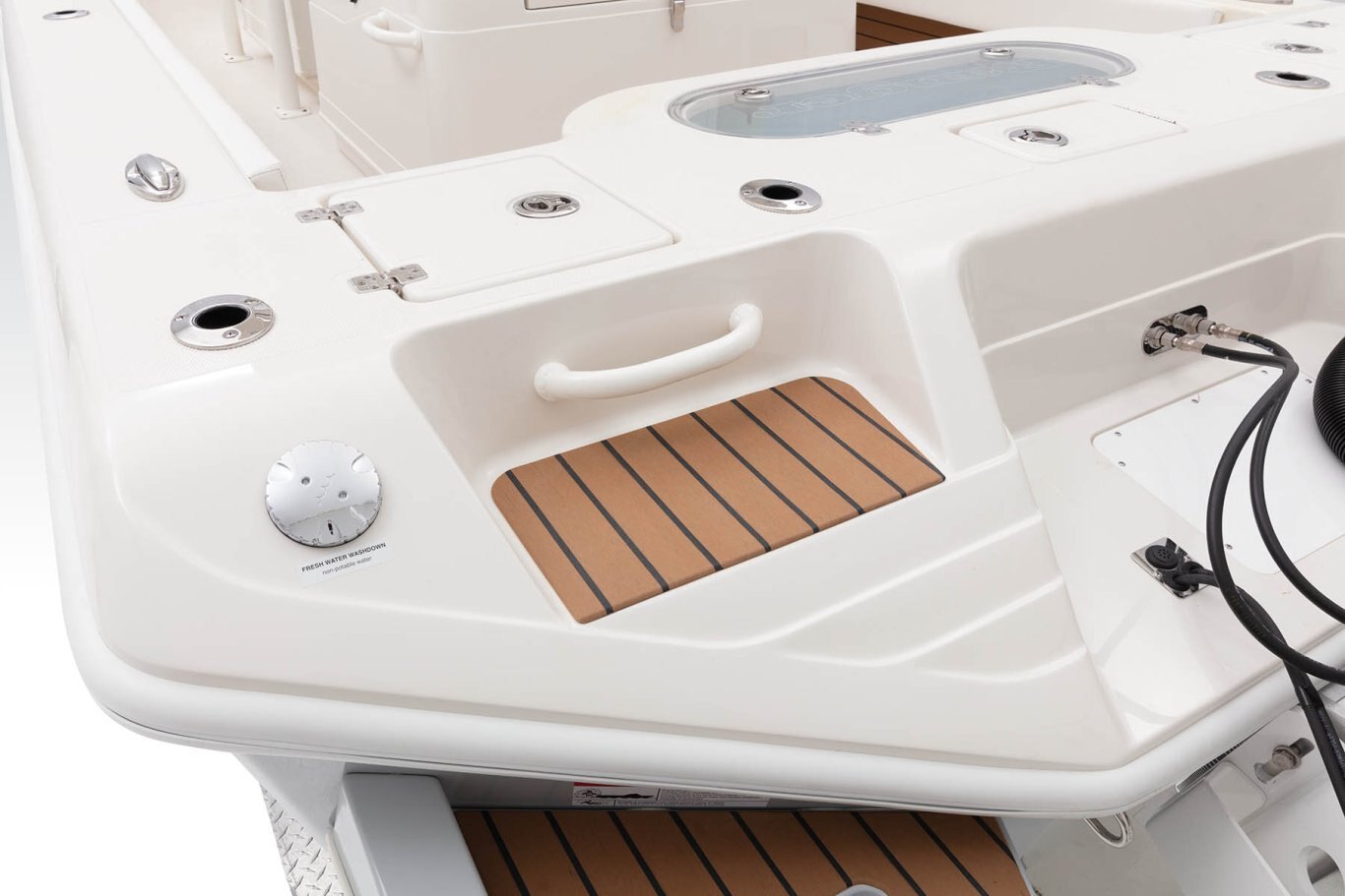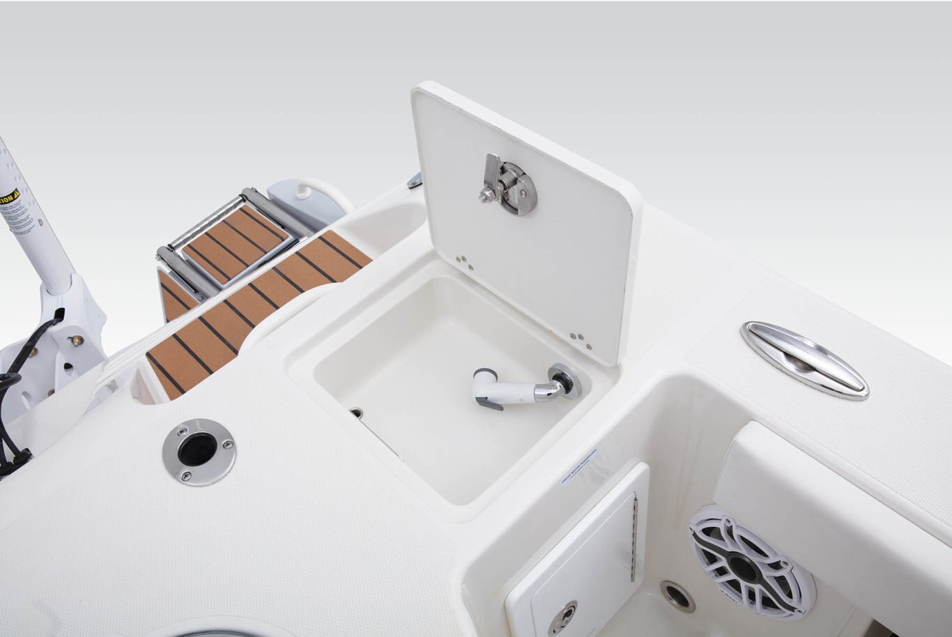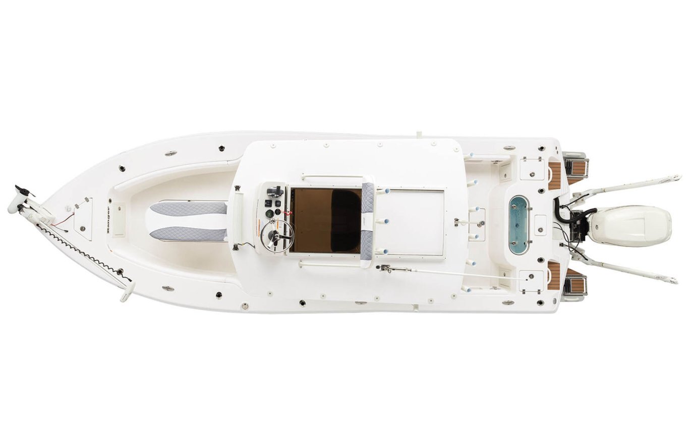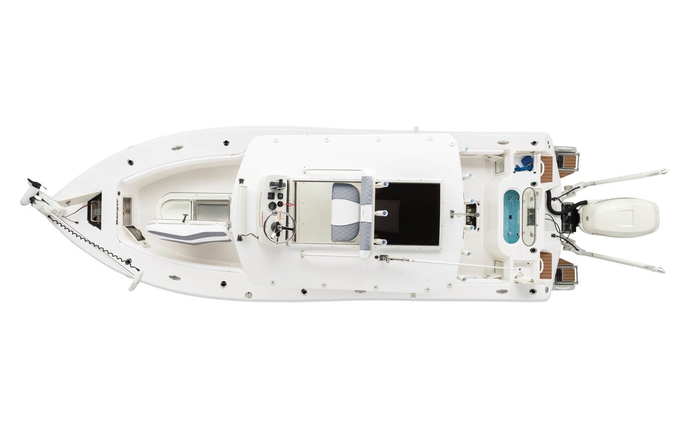 Safety/Comfort Heavy duty rubrail offered in white or black Fire extinguisher & horn Easy entry transom steps Step in console Skid-resistant deck & interior Plexi windshield Upright, level flotation Custom fitted premium marine upholstery - leaning post w/ mezzanine seating, baitwell/cooler and storage Self-bailing cockpit w/ stainless steel scuppers 50 gallon pressurized transom baitwell Stainless steel pull up tie cleats/ fore, aft, & midship Swim platform w/ boarding ladder Mirror on console cabin door