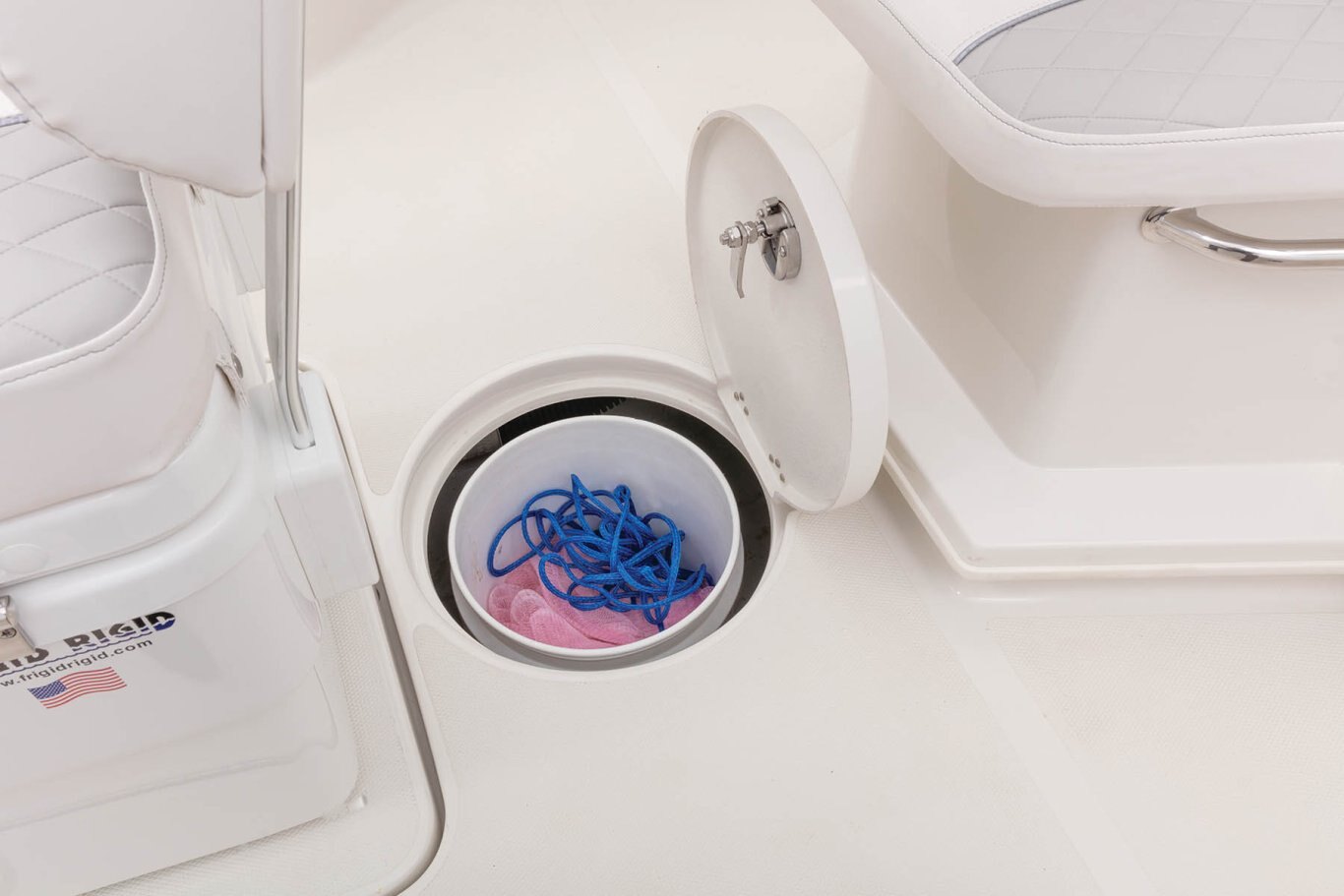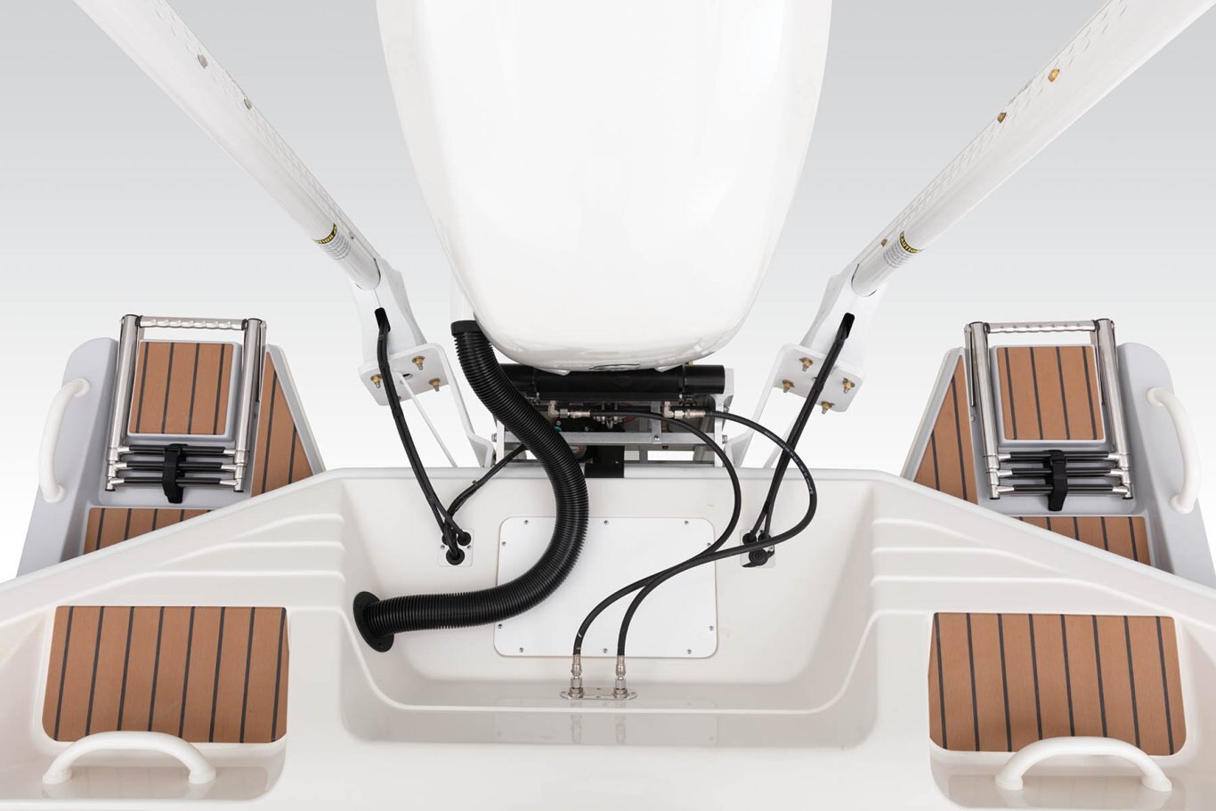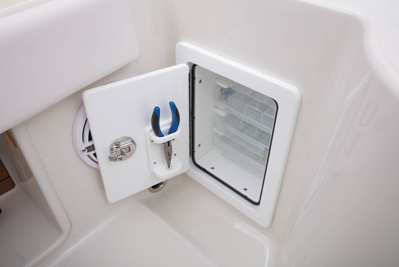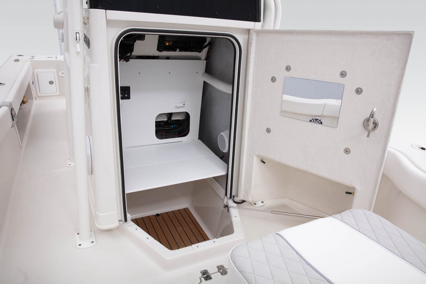 Safety/Comfort Heavy duty rubrail offered in white or black Fire extinguisher & horn Easy entry transom steps Step in console Skid-resistant deck & interior Plexi windshield Upright, level flotation Custom fitted premium marine upholstery - leaning post w/ mezzanine seating, baitwell/cooler and storage Self-bailing cockpit w/ stainless steel scuppers 50 gallon pressurized transom baitwell Stainless steel pull up tie cleats/ fore, aft, & midship Swim platform w/ boarding ladder Mirror on console cabin door