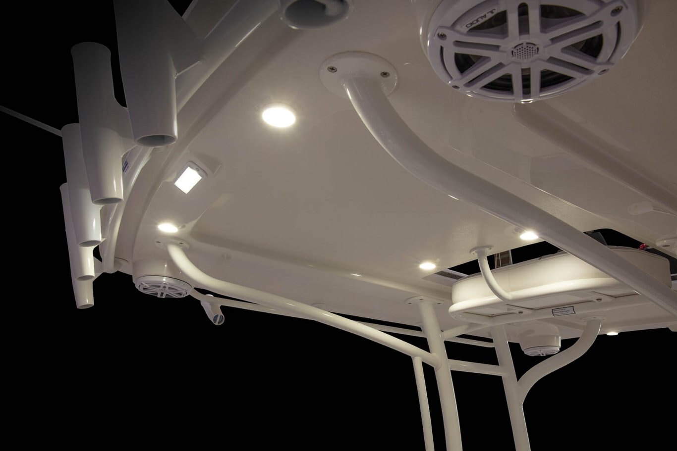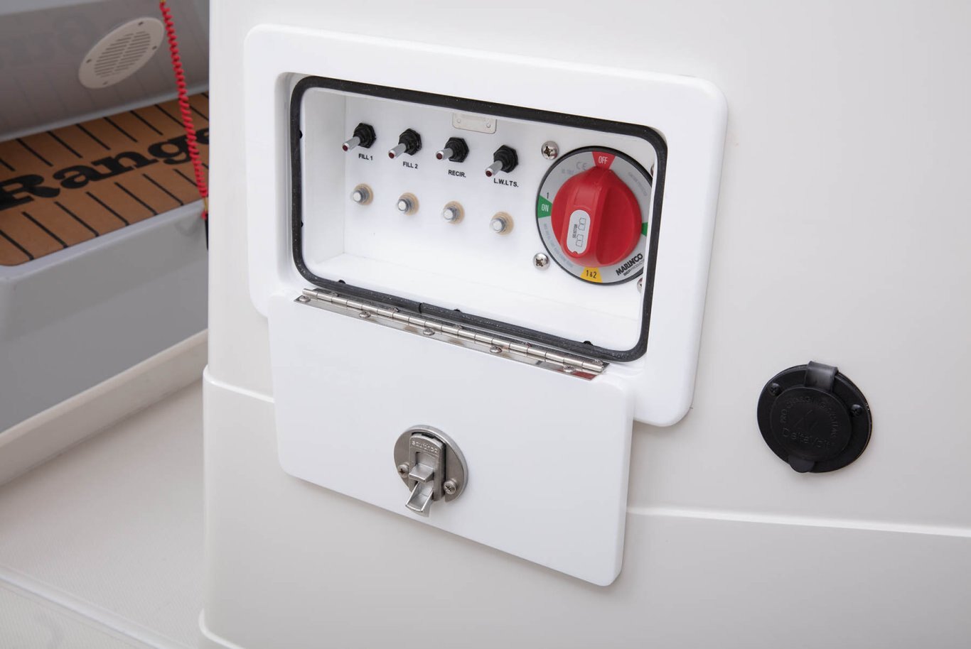 Electronics Digital speedometer, Tach, Fuel, Trim & Water Pressure by engine manufacturer Heavy duty 6 ga. TM wiring w/60 amp breakers Corrosion resistant wiring w/ resettable breakers 12V DC power receptacle Console panel w/ stainless push-button switching w/ 30 amp breaker LED cockpit, compartment & livewell light package LED under water lights