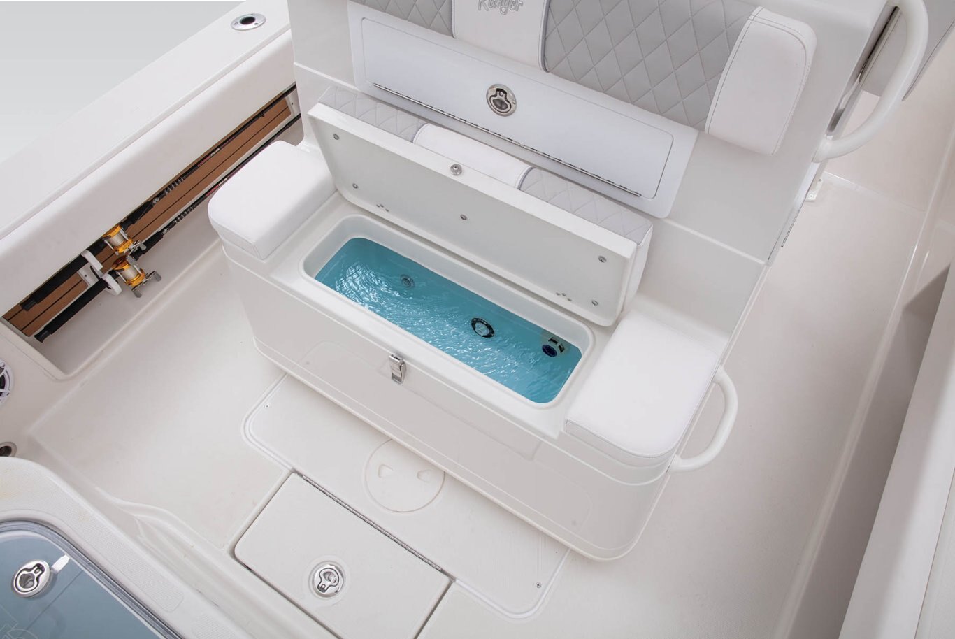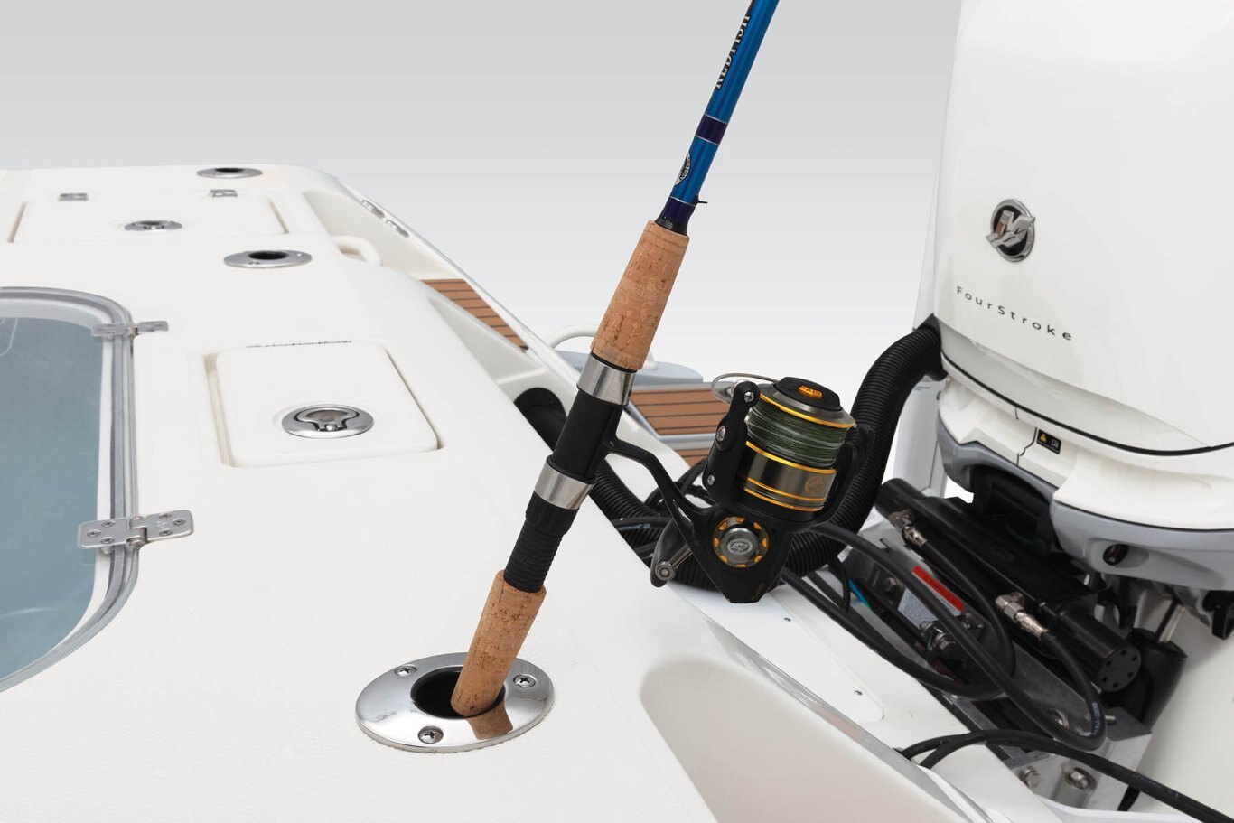 Custom Details Access hatch for quick pump and shut-off access Anchor locker w/ overboard drain Fully bolstered cockpit Gunnel and transom rod holders (12) In-Floor 60" fish box w/ Macerator In-floor bucket storage In-gunnel rod storage port & starboard Integrated rear tackle storage station Leaning post rod holders (5) On demand fresh water wash down Stainless steel friction hinges Gelcoated storage boxes Anchor locker w/ protective stainless steel plate for tie-off Stainless steel fittings Stainless steel gas spring lid assist Trim tabs 12"x12" Fresh water and raw water washdowns Exhaust fan & light under console