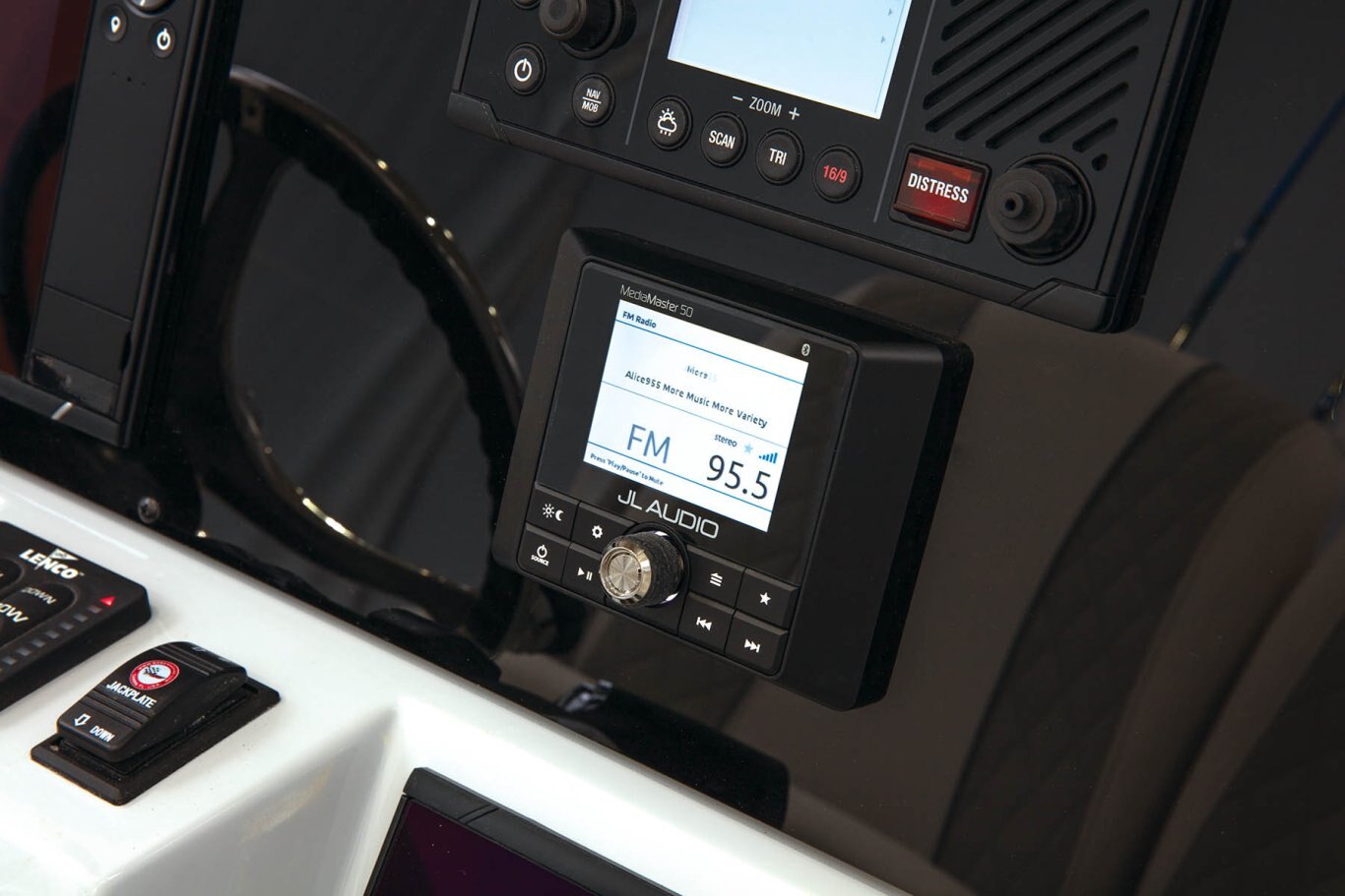 Power/Performance Edson Comfort Grip stainless steel steering wheel w/ assist knob Master battery switch Binnacle throttle control High performance stainless steel prop Pultruded Fiberglass Transom Fiberglass stringer system Hydraulic tilt steering (may vary with engine model and setback plate) Hydraulic setback plate