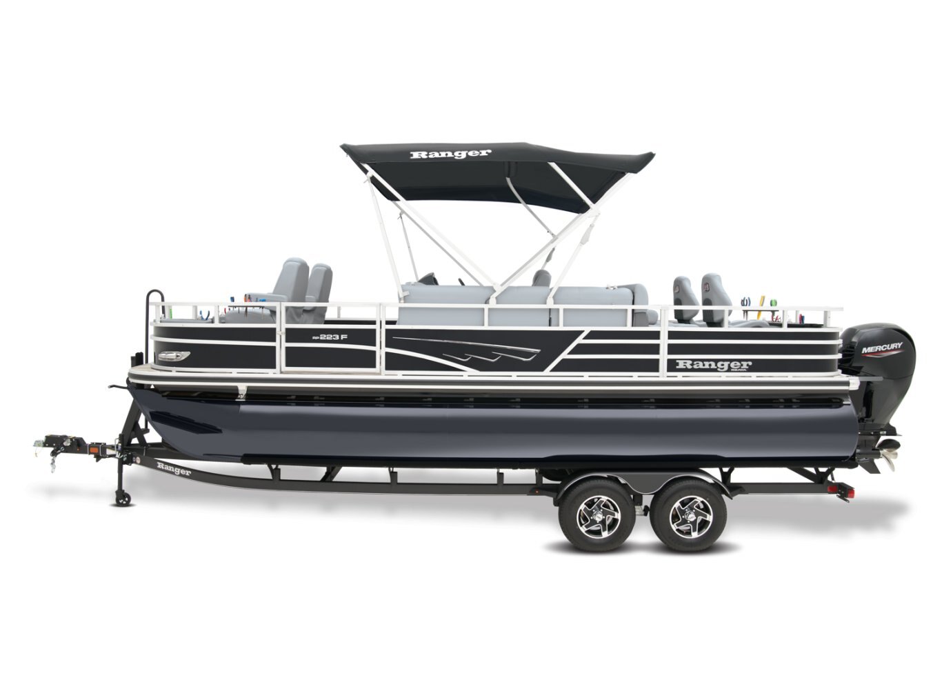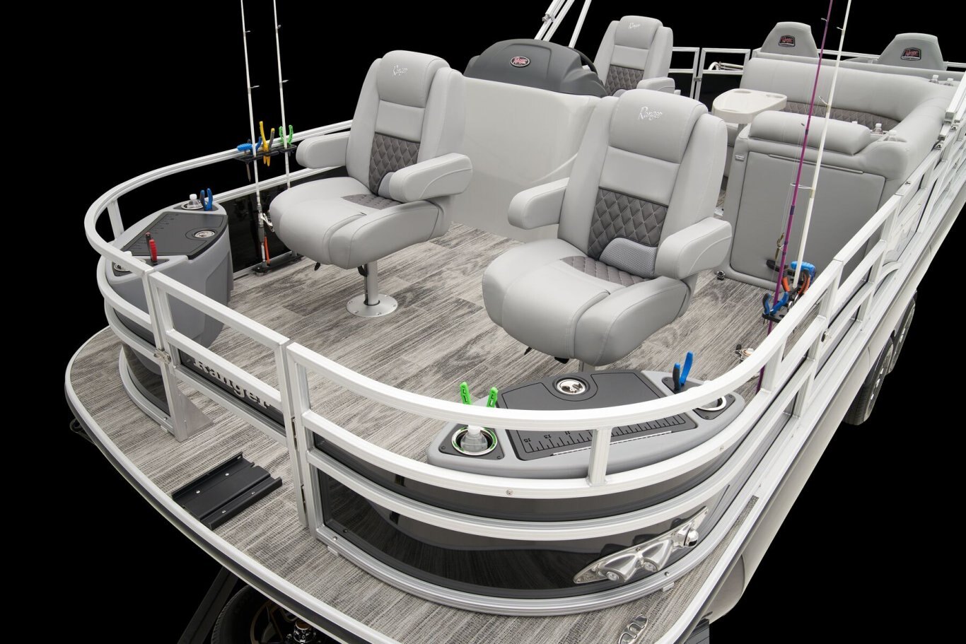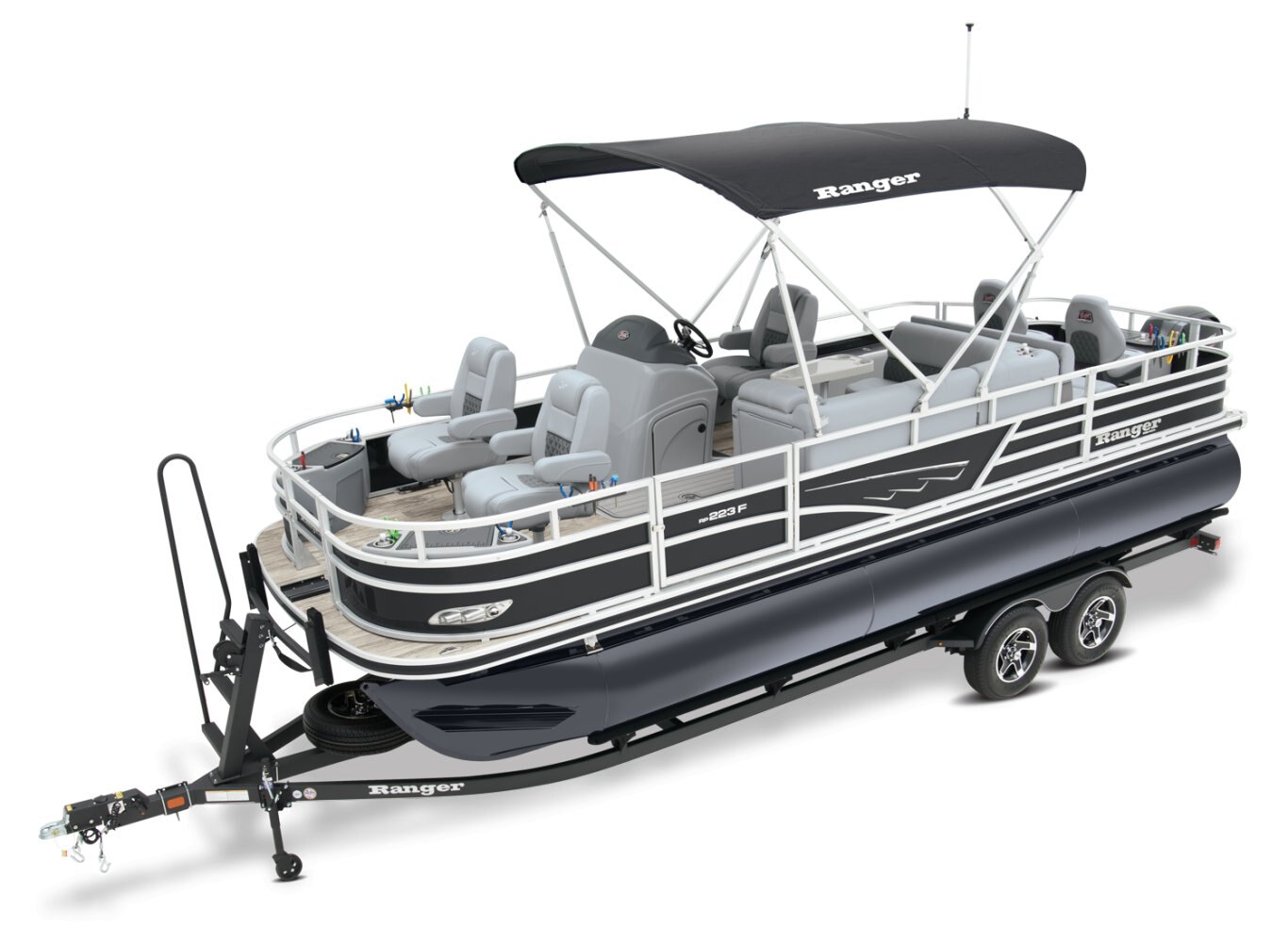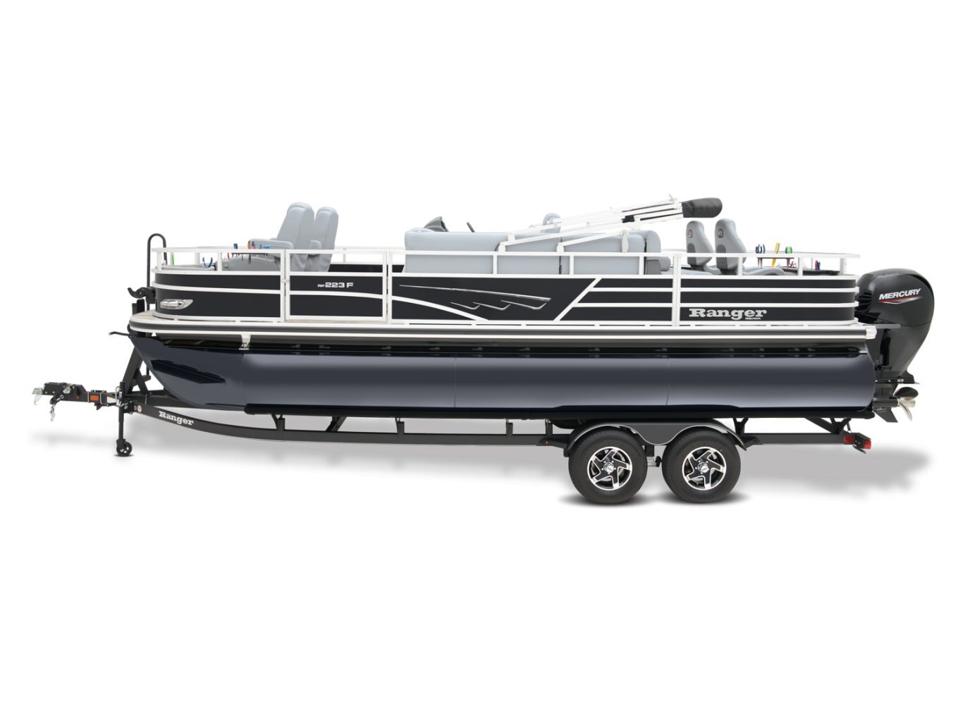 REEL ‘EM IN AND CHILL OUTThe 2025 Ranger® Reata® 223F fishing pontoon is the largest in the Ranger® fishing pontoon series, making it the ultimate headquarters for your days of casting. Its 22'1" deck fits up to 11 passengers, who can take their places in the midship L-shaped lounge with a connected aft-facing bench or the 4 fishing chairs split between the fore and aft fishing decks. The forward fishing deck sports deluxe chairs that swivel, recline, and have self-leveling arms. In front of those chairs is a 12-gal. aerated livewell. The aft fishing deck boasts fold-down, swiveling fishing chairs and a 15-gal. aerated livewell. Both decks have tool and rod holders. Keep your rods up to 7'6" in the lockable starboard rod box. For those who are simply there to enjoy the water, there are features such as the 10' Dowco® EasyLift bimini top, Wet Sounds® stereo with 2 speakers and Bluetooth®, and a removable table. Store water toys, tackle, and other equipment in the in-floor storage compartment and under the lounge area's seat cushions. The 2025 Ranger® Reata® 223F comes standard with a 150hp Mercury® L Fourstroke outboard motor and has a recommended maximum 200hp rating. |