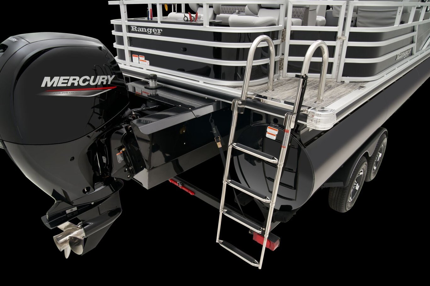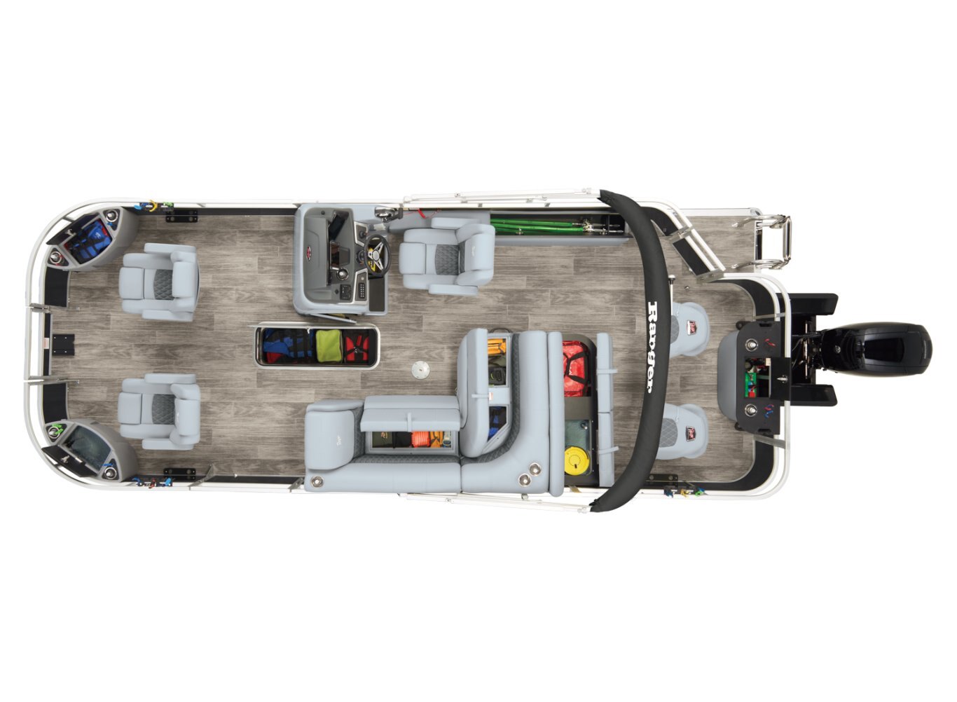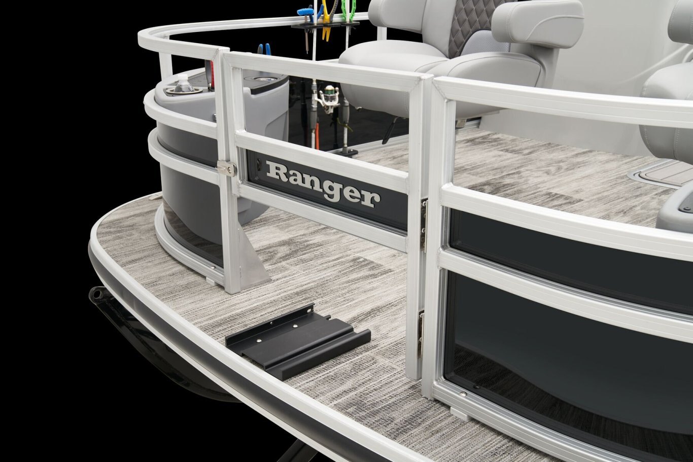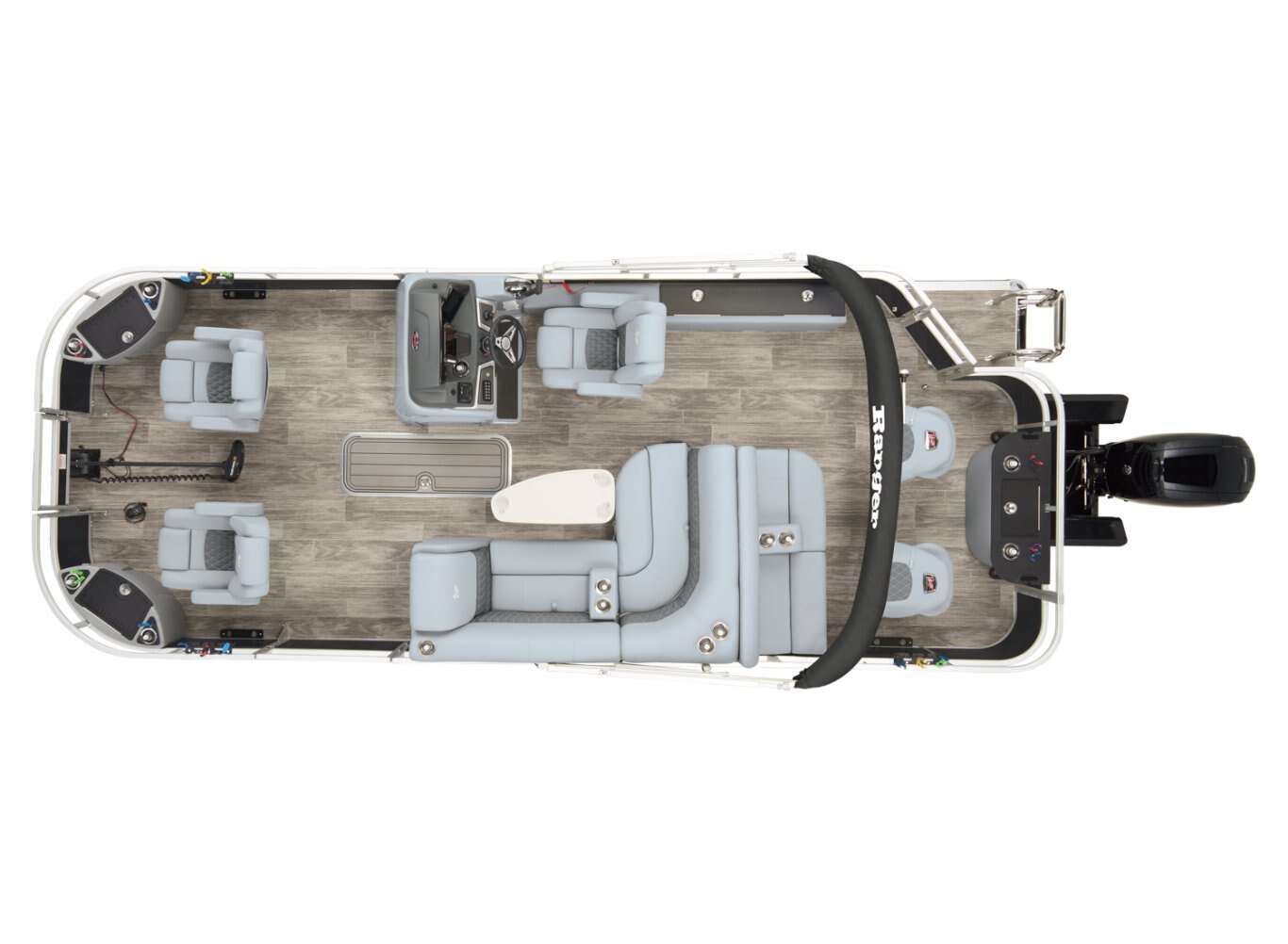 REEL ‘EM IN AND CHILL OUTThe 2025 Ranger® Reata® 223F fishing pontoon is the largest in the Ranger® fishing pontoon series, making it the ultimate headquarters for your days of casting. Its 22'1" deck fits up to 11 passengers, who can take their places in the midship L-shaped lounge with a connected aft-facing bench or the 4 fishing chairs split between the fore and aft fishing decks. The forward fishing deck sports deluxe chairs that swivel, recline, and have self-leveling arms. In front of those chairs is a 12-gal. aerated livewell. The aft fishing deck boasts fold-down, swiveling fishing chairs and a 15-gal. aerated livewell. Both decks have tool and rod holders. Keep your rods up to 7'6" in the lockable starboard rod box. For those who are simply there to enjoy the water, there are features such as the 10' Dowco® EasyLift bimini top, Wet Sounds® stereo with 2 speakers and Bluetooth®, and a removable table. Store water toys, tackle, and other equipment in the in-floor storage compartment and under the lounge area's seat cushions. The 2025 Ranger® Reata® 223F comes standard with a 150hp Mercury® L Fourstroke outboard motor and has a recommended maximum 200hp rating. |