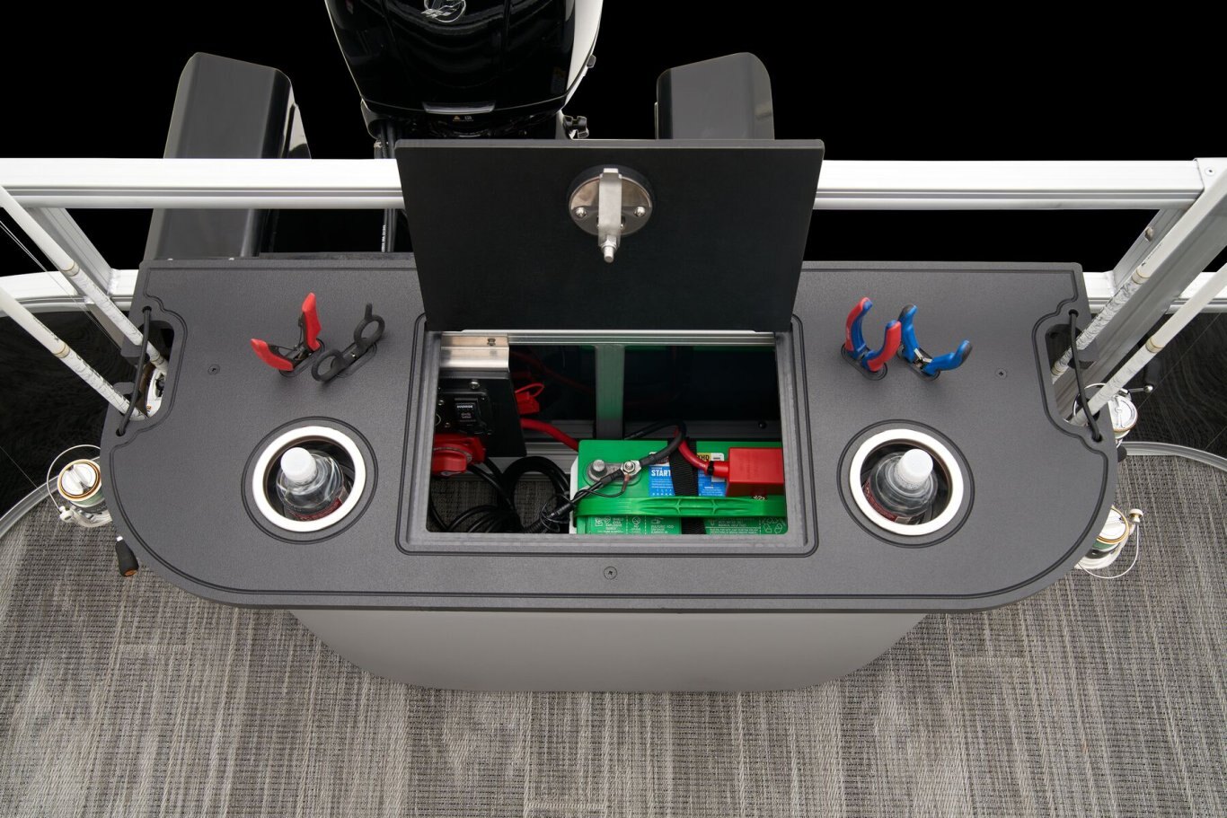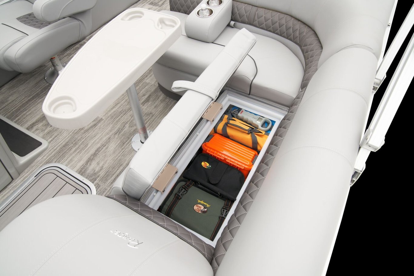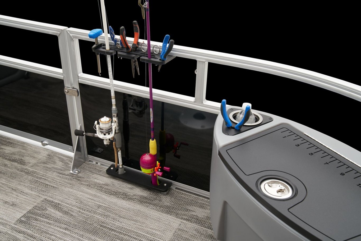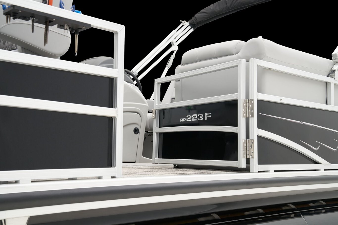 REEL ‘EM IN AND CHILL OUTThe 2025 Ranger® Reata® 223F fishing pontoon is the largest in the Ranger® fishing pontoon series, making it the ultimate headquarters for your days of casting. Its 22'1" deck fits up to 11 passengers, who can take their places in the midship L-shaped lounge with a connected aft-facing bench or the 4 fishing chairs split between the fore and aft fishing decks. The forward fishing deck sports deluxe chairs that swivel, recline, and have self-leveling arms. In front of those chairs is a 12-gal. aerated livewell. The aft fishing deck boasts fold-down, swiveling fishing chairs and a 15-gal. aerated livewell. Both decks have tool and rod holders. Keep your rods up to 7'6" in the lockable starboard rod box. For those who are simply there to enjoy the water, there are features such as the 10' Dowco® EasyLift bimini top, Wet Sounds® stereo with 2 speakers and Bluetooth®, and a removable table. Store water toys, tackle, and other equipment in the in-floor storage compartment and under the lounge area's seat cushions. The 2025 Ranger® Reata® 223F comes standard with a 150hp Mercury® L Fourstroke outboard motor and has a recommended maximum 200hp rating. |