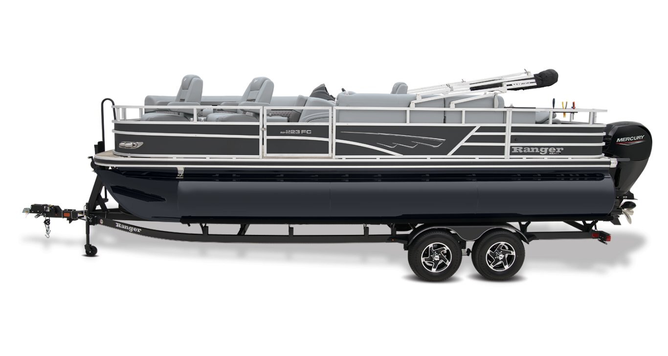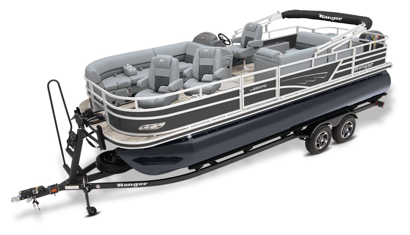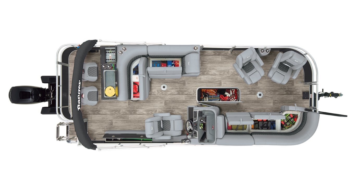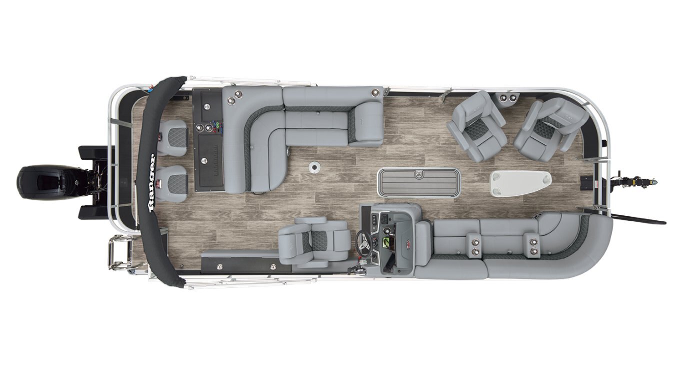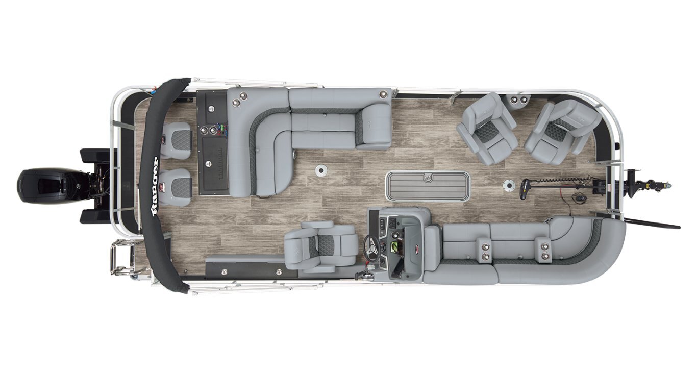 Catch a limit of fun every timeMaximize your fishing pontoon's space and power! The 2025 Ranger® Reata® 223FC Fish & Cruise delivers exciting days not only for anglers, but for everyone looking for fun on the lake. This is the biggest Fish & Cruise crossover in the Ranger® lineup—and the most luxurious. Its layout is engineered to give up to 11 friends and family a comfortable and exciting space. 2 lounges, 2 reclining port chairs with self-leveling arms, and a deluxe captain's chair are built for relaxing. The pilot sits before a fiberglass console equipped with a Wet Sounds® stereo, digital dash touch screen, and a 12-button switch panel over an in-console cooler compartment to keep beverages close by. Serious anglers can grab their setups from the lockable rod compartment and set up shop in 1 of the 2 chairs in the aft fishing deck. This deck also sports an aerated livewell and a holder for your rods and tools. If the sun's beating down overhead, expand the color-matched 10' bimini top for some shade so you can fish the day away. The 2025 Ranger® Reata® 223FC comes standard with a 200hp Mercury® L FourStroke outboard motor and has a recommended maximum 200hp rating. |