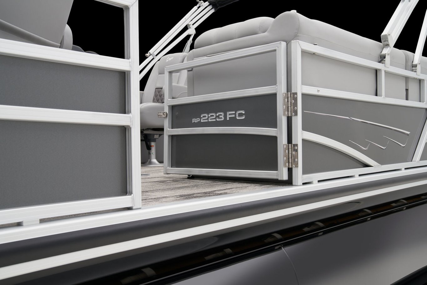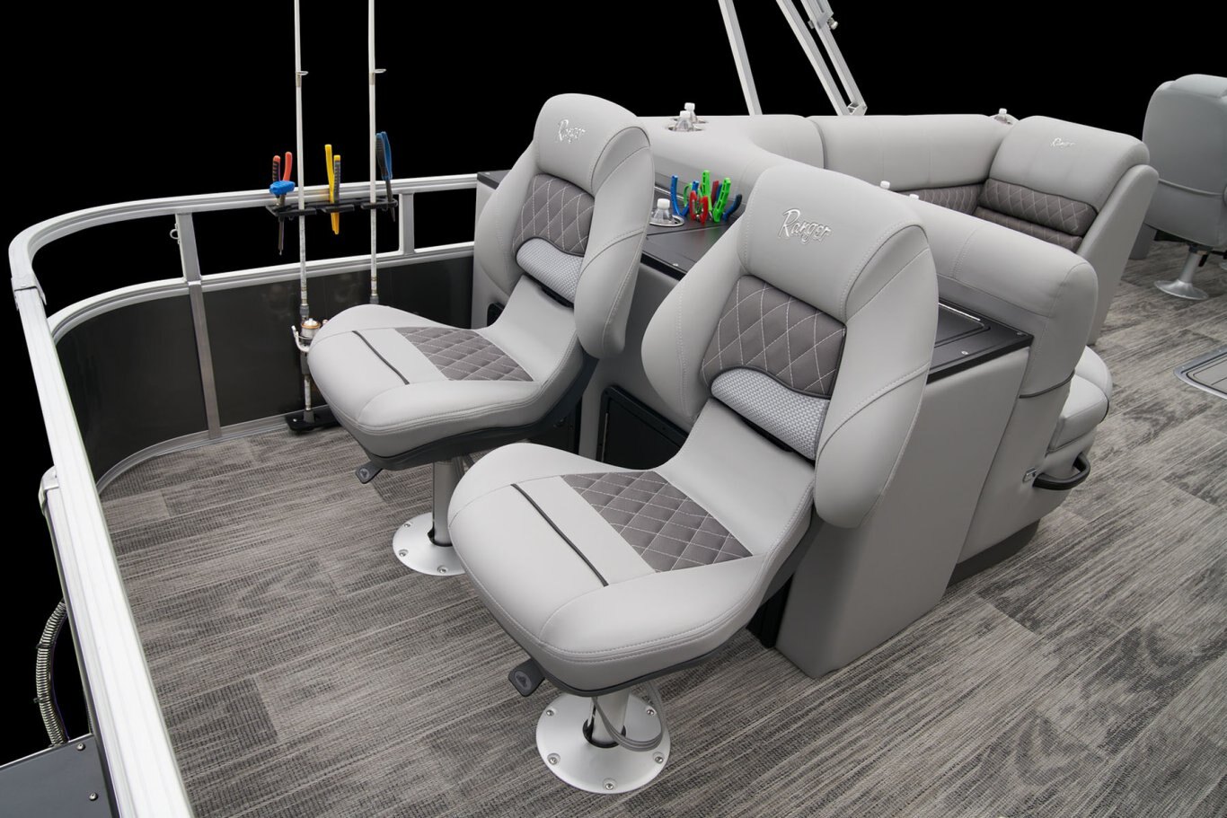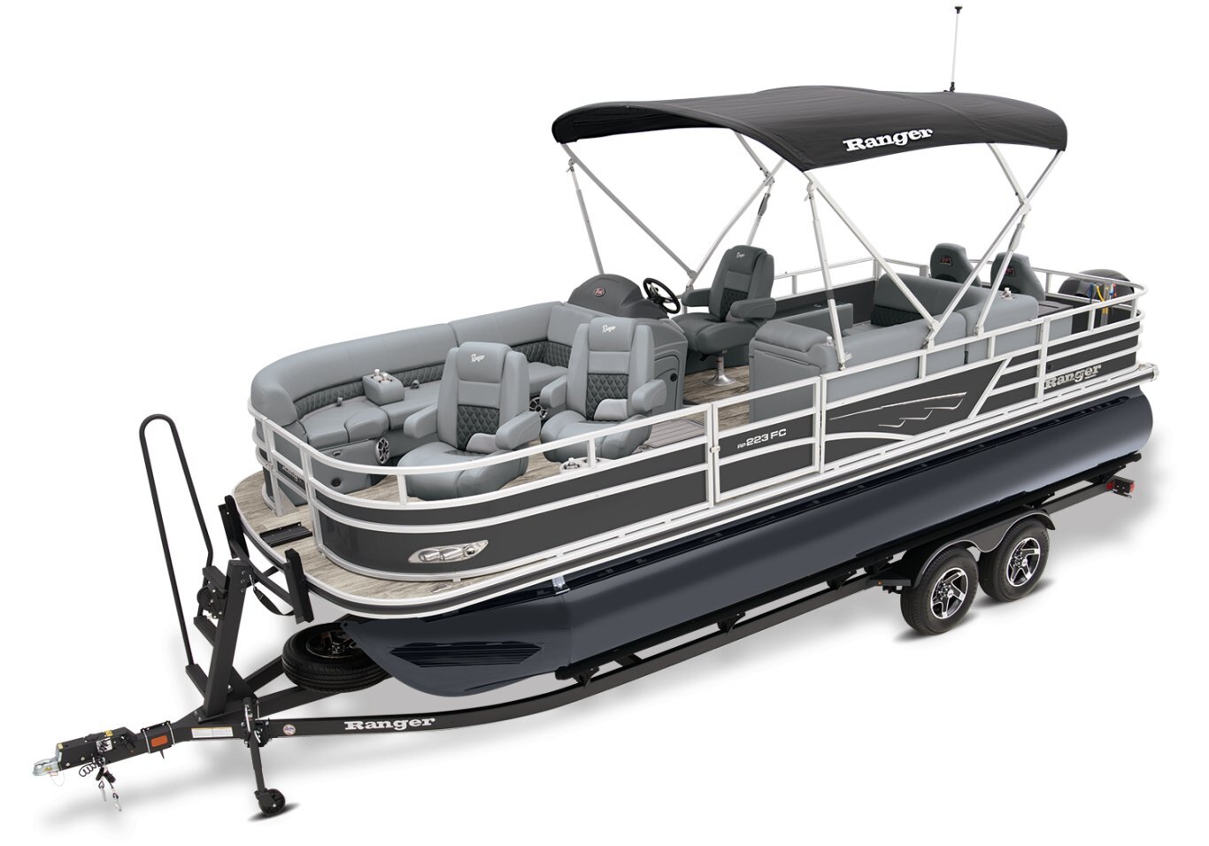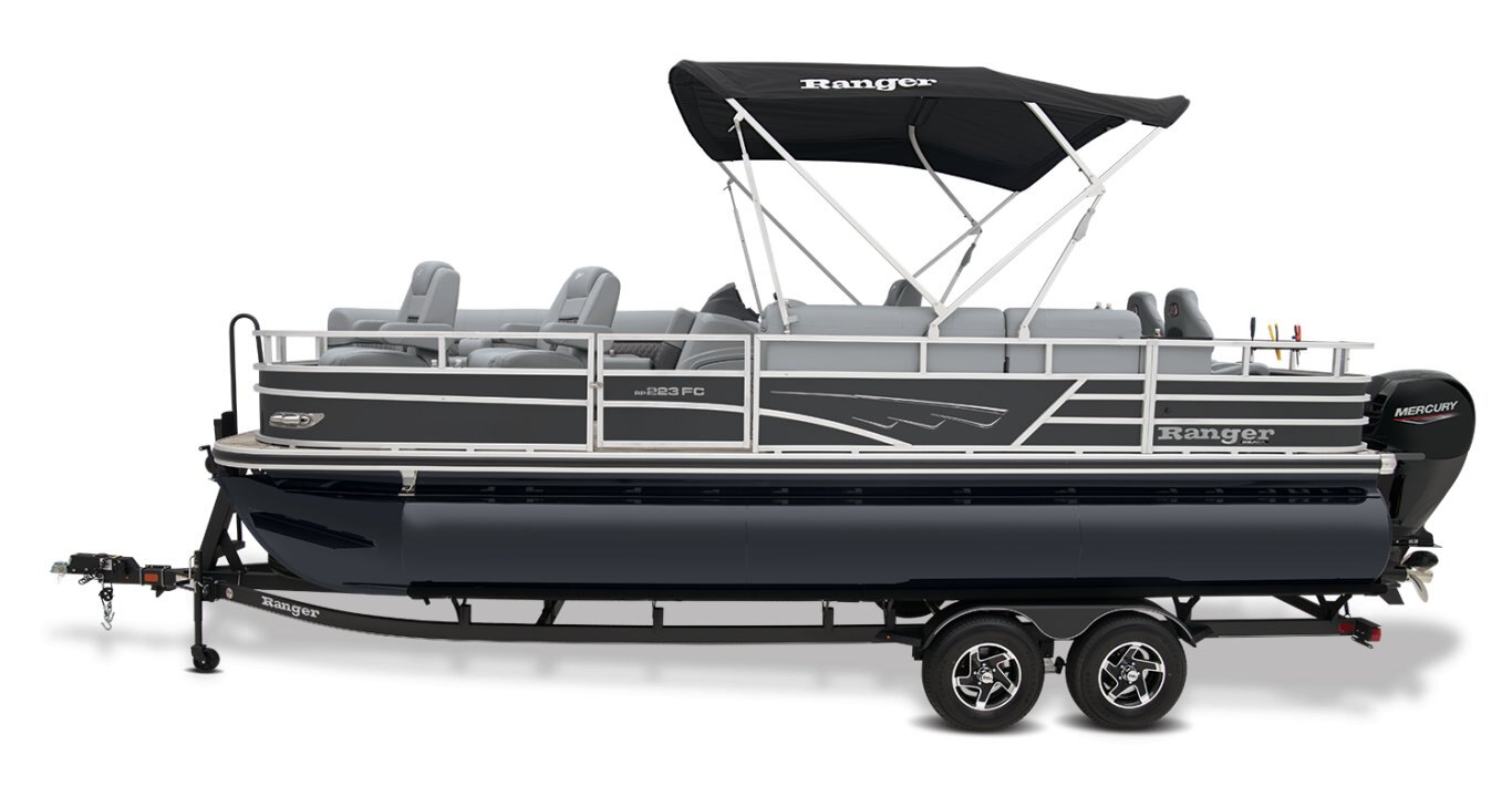 Catch a limit of fun every timeMaximize your fishing pontoon's space and power! The 2025 Ranger® Reata® 223FC Fish & Cruise delivers exciting days not only for anglers, but for everyone looking for fun on the lake. This is the biggest Fish & Cruise crossover in the Ranger® lineup—and the most luxurious. Its layout is engineered to give up to 11 friends and family a comfortable and exciting space. 2 lounges, 2 reclining port chairs with self-leveling arms, and a deluxe captain's chair are built for relaxing. The pilot sits before a fiberglass console equipped with a Wet Sounds® stereo, digital dash touch screen, and a 12-button switch panel over an in-console cooler compartment to keep beverages close by. Serious anglers can grab their setups from the lockable rod compartment and set up shop in 1 of the 2 chairs in the aft fishing deck. This deck also sports an aerated livewell and a holder for your rods and tools. If the sun's beating down overhead, expand the color-matched 10' bimini top for some shade so you can fish the day away. The 2025 Ranger® Reata® 223FC comes standard with a 200hp Mercury® L FourStroke outboard motor and has a recommended maximum 200hp rating. |