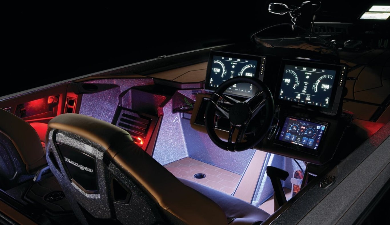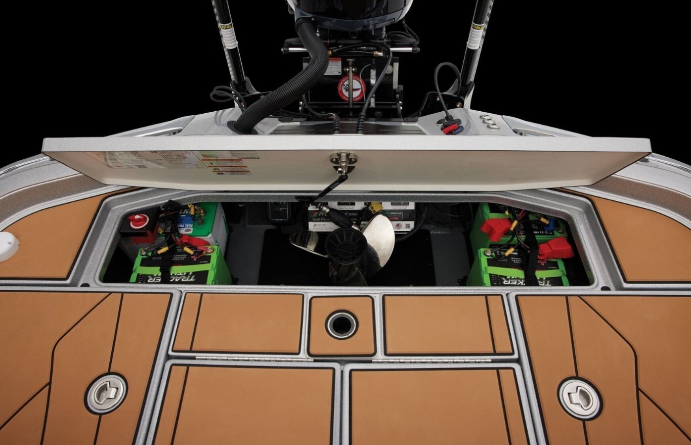 Power/Performance Pultruded Fiberglass Transom (3) Lithium 80AH trolling batteries w/trays AGM Starting battery w/ tray Backup manual ignition keyswitch One-Piece-Feel™ Interloc Construction Integrated engine setback 10" manual setback plate Tilt hydraulic steering Recirculating aerated livewell w/ removable divider & integrated culling tag system Pure Oxygen Generator Venturi Aeration System Recessed trolling motor foot pedal High performance stainless steel prop Foam-filled fiberglass stringer system