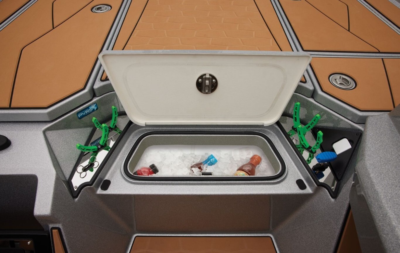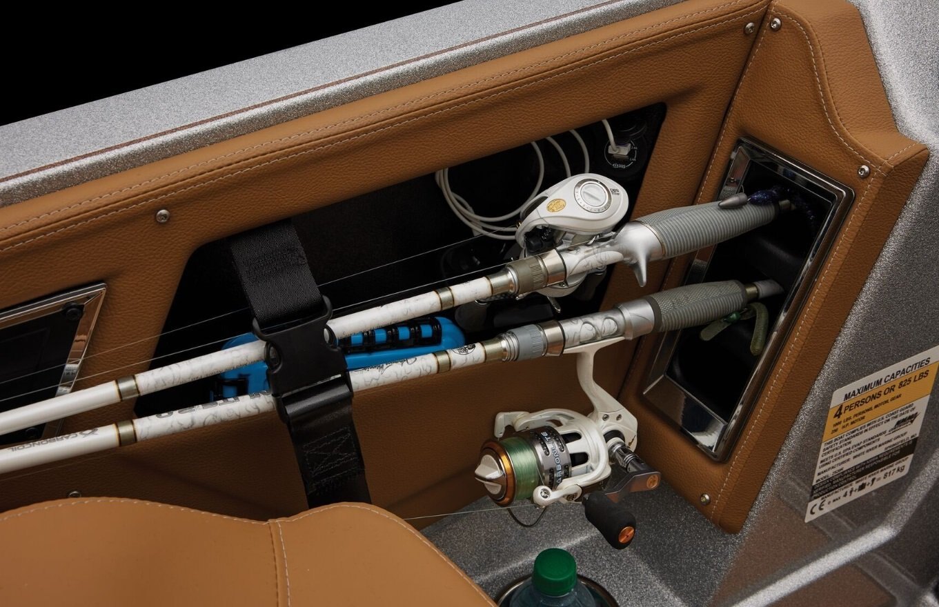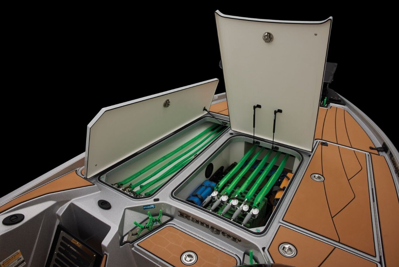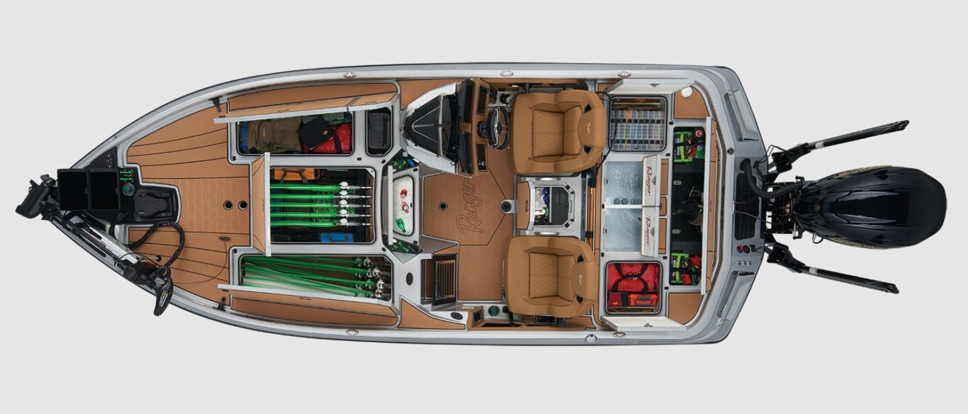Custom Details Ranger Echelon™ Rod Storage System - 3-tiered port & 2-tiered starboard rod lockers Custom color package Power Ventilation Rod Storage™ Insulated 40 qt. step-up cooler Integrated center-storage rod & tackle management system Stainless steel push-to-close locking latches Color-matched cockpit floor and compartment liner mats Integrated line spooling station under battery lid Ranger® tournament measuring board integrated at front deck step Retractable rod buckles Runnin' rod rack w/ retractable strap Remote drain plug Tool holders at bow and front deck step Pultrusion-reinforced decks, floors, transom & stringers