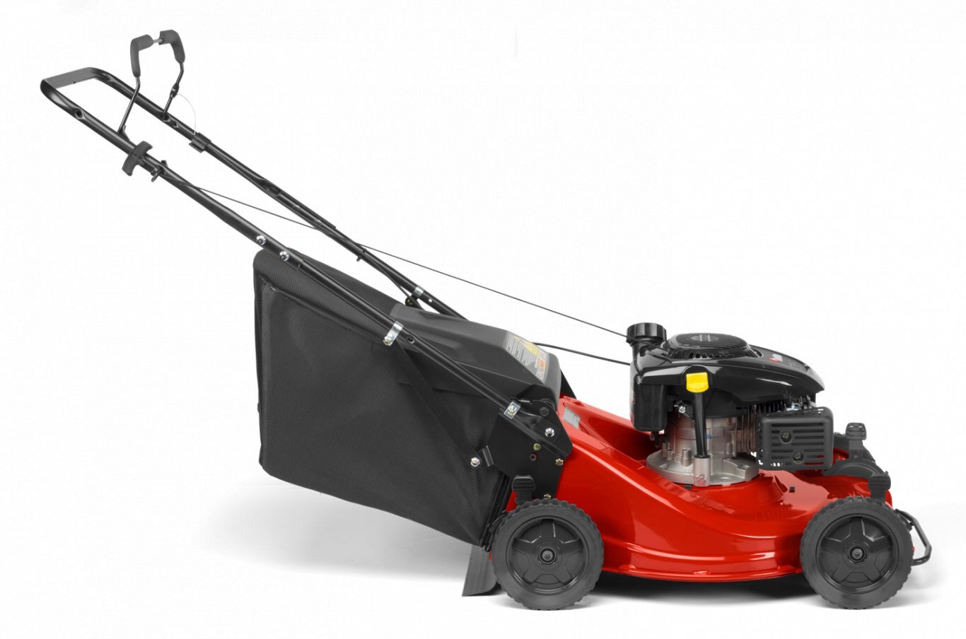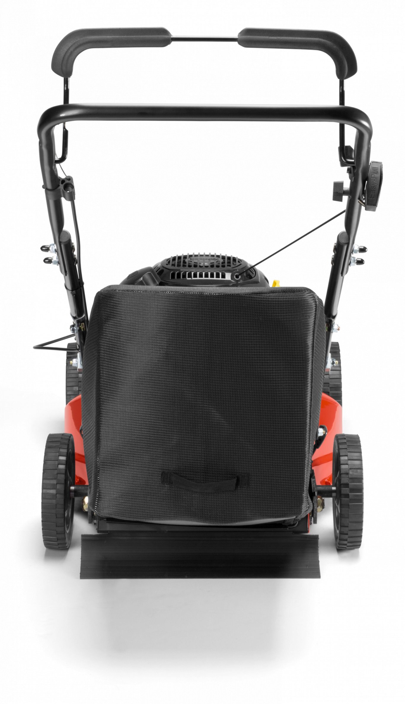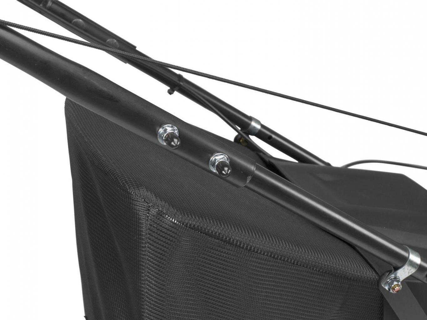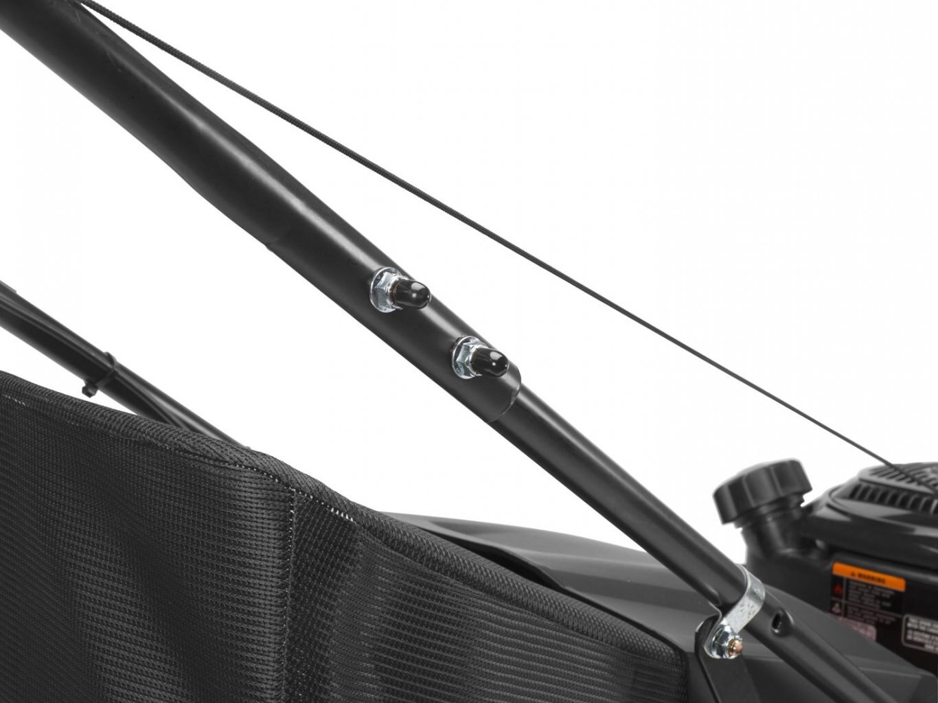 Double bolted bag through handle for durable construction, responsive operation, and easy grass bag access. |