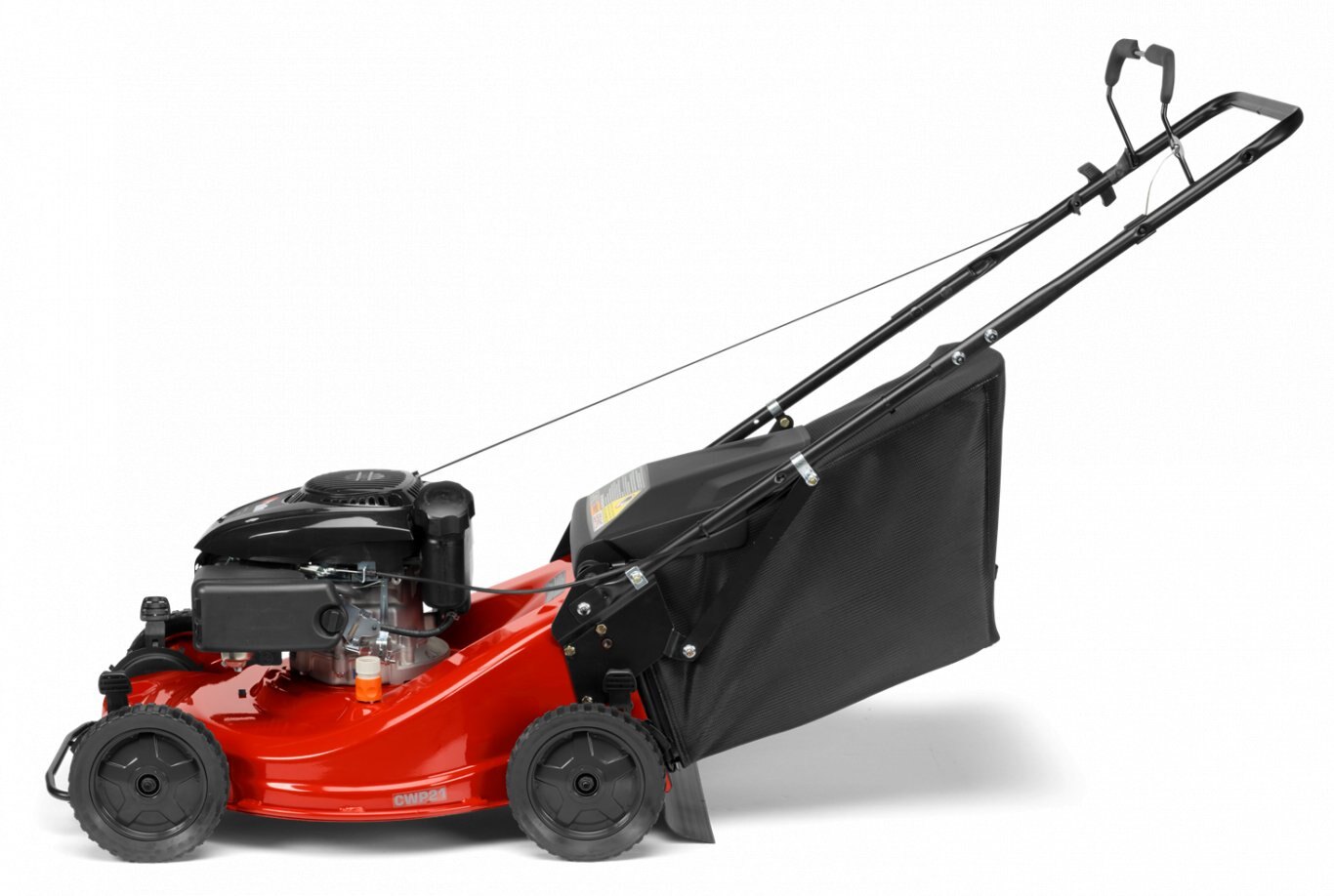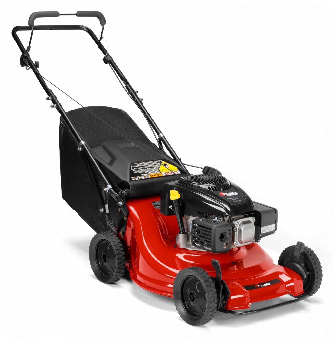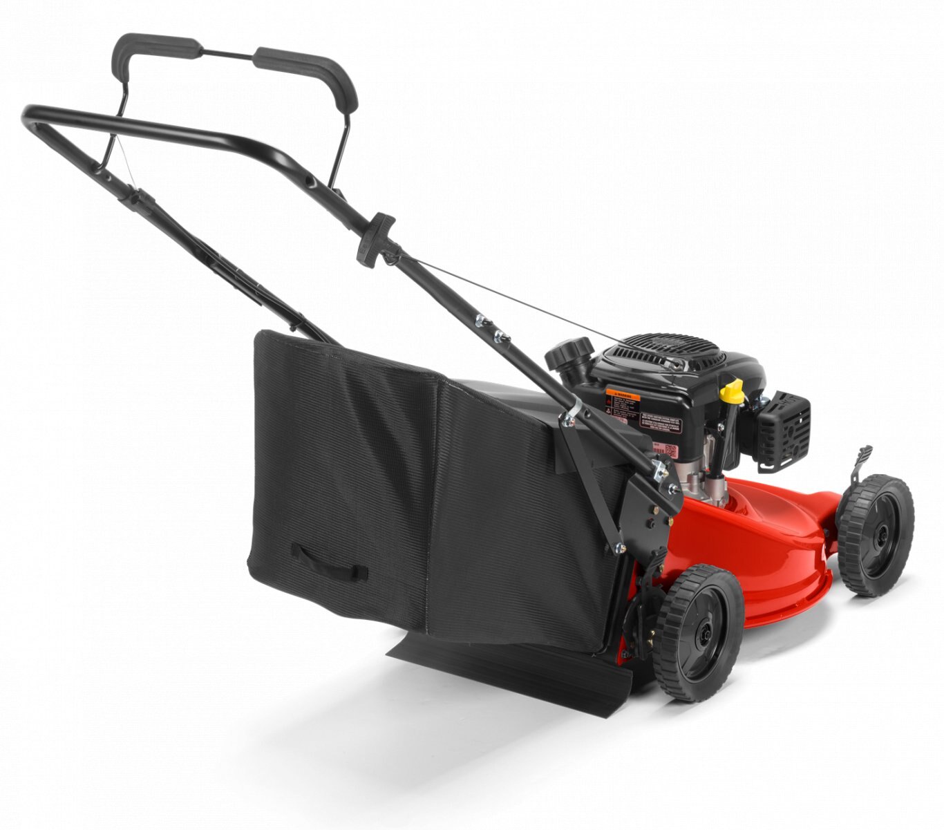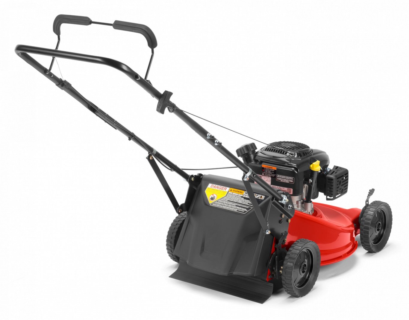 Double bolted bag through handle for durable construction, responsive operation, and easy grass bag access. |